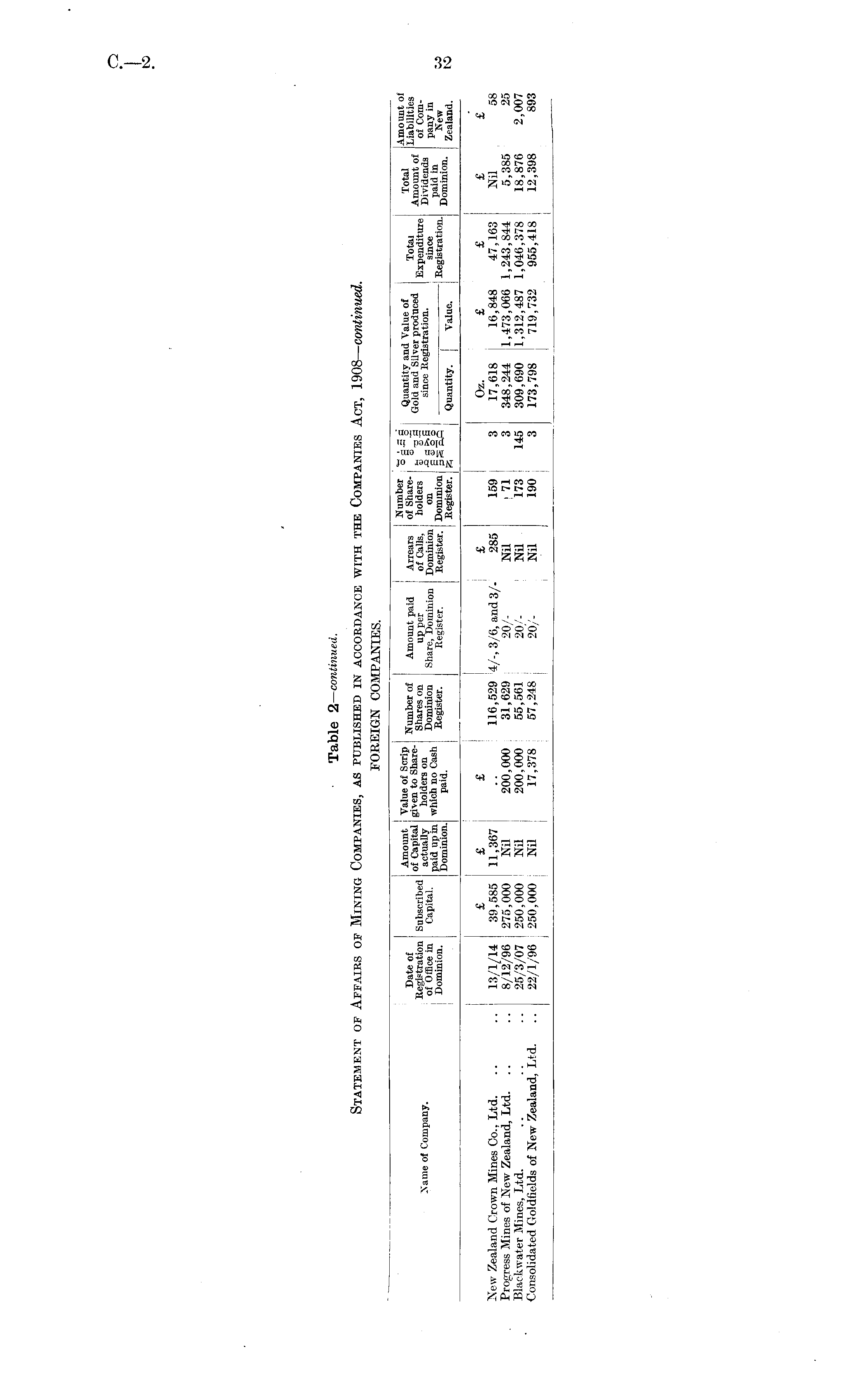 Table 2—continued. Statement of Afairs of Mining Companies, as published in acordance with the Companies Act, 1908—continued. FOREIGN COMPANIES.