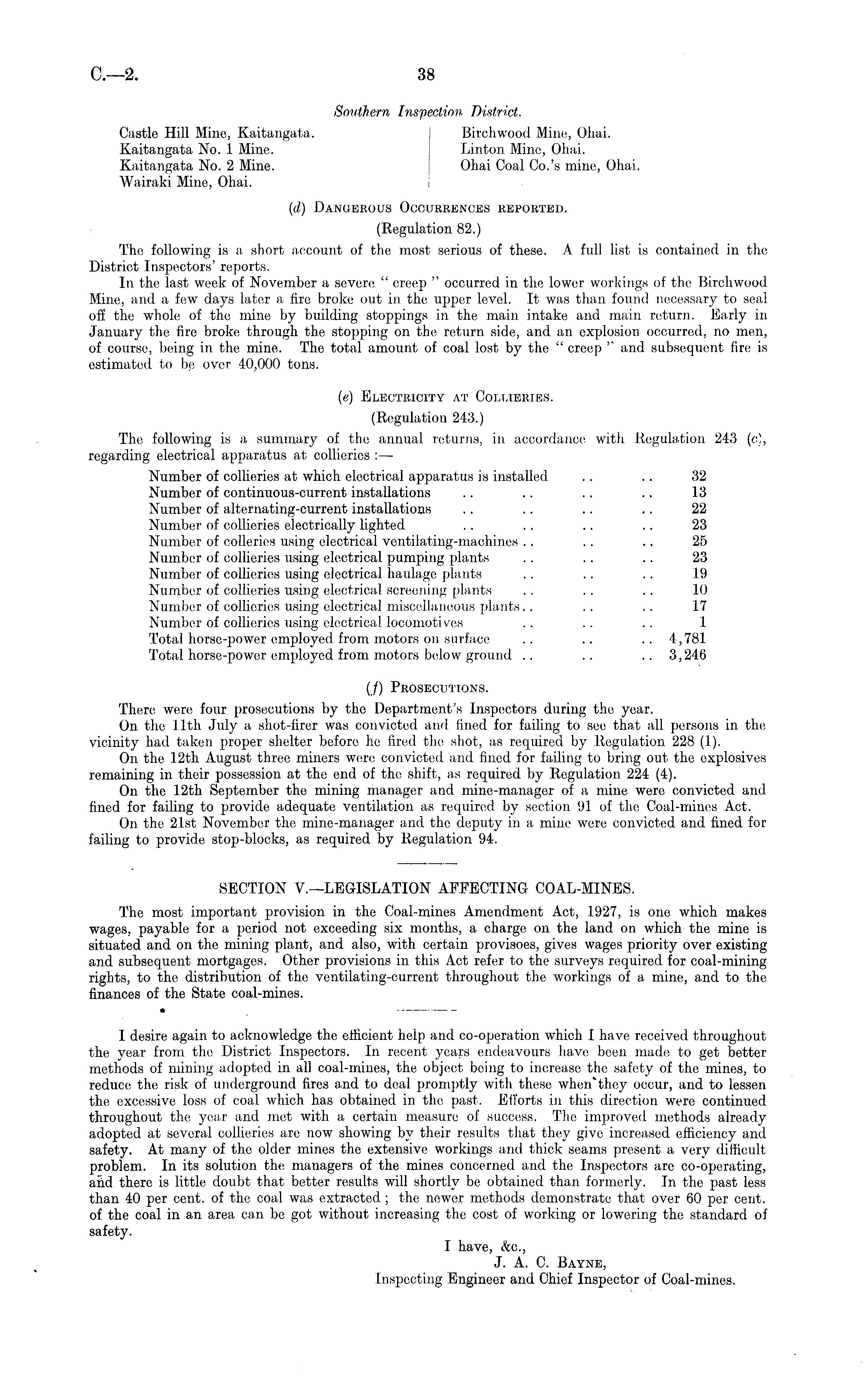 Southern Inspection District. Castle Hill Mine, Kaitangata. Birchwood Mini!, Ohai. Kaitangata No. I Mine. Linton Mine, Ohai. Kaitangata No. 2 Mine. Ohai Coal Co.'s mine, Ohai. Wairaki Mine, Ohai. (d) Dangerous Occurrences reported. (Regulation 82.) The following is a short account of the most serious of these. A full list is contained, in tin; District In selectors' reports. In the last week of November a severe " creep " occurred in the lower workings of the Birchwood Mine, and a few days later a fire broke out in the upper level. It was than found necessary to seal off the whole of the mine by building stoppings in the main intake and main return. Early in January the fire broke through the stopping on the return side, and an explosion occurred, no men, of course, being in the mine. The total amount of coal lost by the " creep " and subsequent fire is estimated to be ovor 40,000 tons. (c) Electricity at Collieries. (Regulation 243.) The following is a summary of the annual returns, in accordance with Regulation 243 (c), regarding electrical apparatus at collieries : — Number of collieries at which electrical apparatus is installed .. .. 32 Number of continuous-current installations .. .. . . .. f 3 Number of alternating-current installations .. .. .. . . 22 Number of collieries electrically lighted .. .. .. . . 23 Number of colleries using electrical ventilating-maohines . . . . .. 25 Number of collieries using electrical pumping plants . . . . .. 23 Number of collieries using electrical haulage plants .. . . .. 19 Number of collieries using electrical screening plants . . . . .. 10 Number of collieries using electrical miscellaneous plants. . .. .. 17 Number of collieries using electrical locomotives . . .. .. 1 Total horse-power employed from motors on surface .. .. .. 4,781 Total horse-power employed from motors below ground .. .. .. 3,246 (/) Prosecutions. There were four prosecutions by tho Department's Inspectors during the year. On. the 11th .July a shot-firer was convicted and lined for failing to see that all persons in the vicinity had taken proper shelter before he fired the shot, as required by Regulation. 228 (1). On the 12th August three miners were convicted and fined for failing to bring out the explosives remaining in their possession at the end of the shift, as required by Regulation 224 (4). On the 12th September the mining manager and mine-manager of a mine were convicted and fined for failing to provide adequate ventilation as required by section 91 of the Coal-mines Act. On the 21st November the mine-manager and the deputy in a, mine were convicted and fined for failing to provide stop-blocks, as required by Regulation 94. SECTION V.—LEGISLATION AFFECTING COAL-MINES. The most important provision in the Coal-mines Amendment Act, 1927, is one which makes wages, payable for a period not exceeding six months, a charge on the land on which the mine is situated and on the mining plant, and also, with certain provisoes, gives wages priority over existing and subsequent mortgages. Other provisions in this Act refer to the surveys required for coal-mining rights, to the distribution of the vcntilating-current throughout the workings of a, mine, and to the finances of the State coal-mines. • I desire again to acknowledge the efficient help and co-operation which I have received throughout the year from the District Inspectors. In recent years endeavours have been made to get better methods of mining adopted in all coal-mines, the object being to increase the safety of the mines, to reduce the risk of underground fires a.nd to deal promptly with these when'they occur, and to lessen the excessive loss of coal which has obtained in the past. Efforts in this direction were continued throughout the yoar and met with a certain measure of success. The improved methods already adopted at several collieries are now showing by their results that they give increased efficiency and safety. At many of the older mines the extensive workings and thick seams present a very difficult problem. In its solution the managers of the mines concerned and the Inspectors are co-operating, and there is little doubt that better results will shortly be obtained than formerly. In the past less than 40 per cent, of the coal was extracted ; the newer methods demonstrate that over 60 per cent, of the coal in an area can be got without increasing the cost of working or lowering tho standard of safety. I have, &c., J. A. C. Bayne, Inspecting Engineer and Chief Inspector of Coal-mines.
