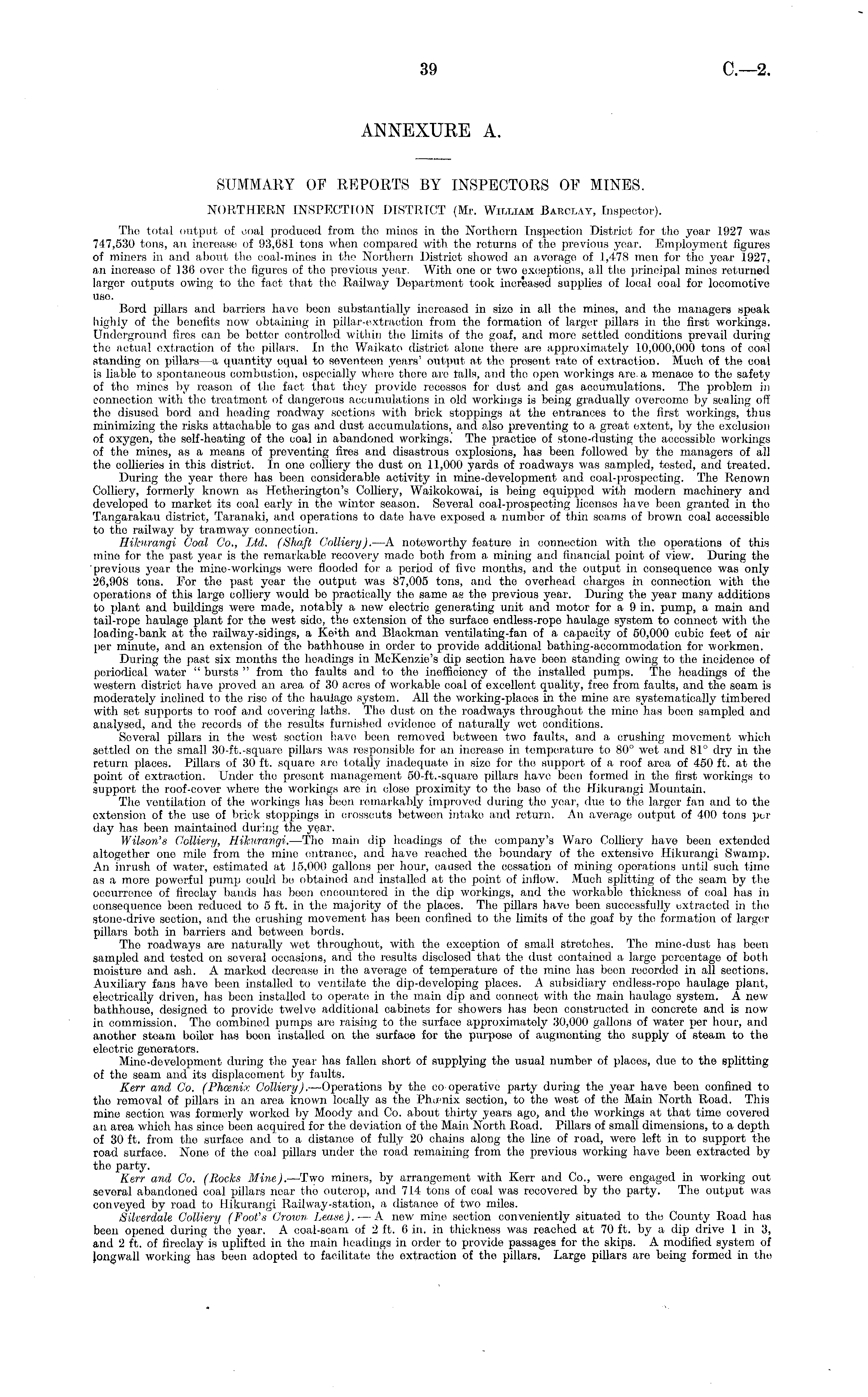 ANNEXURE A. SUMMARY OF REPORTS BY INSPECTORS OF MINES. NORTHERN INSPECTION DISTRIOT (Mr. William Baeolay, Inspector). Tho total output of coal produoed from tho mines in the Northern Inspection District for the year 1927 was 747,530 tons, an increase of 93,081 tons when compared with, the returns of the previous yoar. Employment figures of miners in and about the coal-mines in the Northern District showed an average of 1,478 men for the year 1.927, an inercaso of 136 over the figures of tho previous year. With one or two exceptions, all the principal mines returned largor outputs owing to the fact that the Railway Department took increased supplies of local coal for locomotive use. Bord pillars and barriers havo beon substantially increased in sizo in all the mines, and the managers speak highly of the benefits now obtaining in pillar-extraction from tho formation of larger pillars in the first workings. Underground fires can bo better controlled within the limits of tho goaf, and more settled conditions prevail during the actual extraction of the pillars. In the Waikato district alone there are approximately 10,000,000 tons of coal standing on pillars—a quantity equal to seventeen years' output at the present rate of extraction. Much of the coal is liable to spontaneous combustion, especially where thore are tails, and the open workings are a menace to the safety of tho mines by reason of the fact that they provide reeessos for dust and gas accumulations. The problem in connection with the trcatmont of dangerous accumulations in old workings is being gradually overcome by scaling off tho disusod bord and heading roadway sections with brick stoppings at the entrances to the first workings, thus minimizing the risks attachable to gas and dust accumulations, and also preventing to a great extent, by the exclusion of oxygen, the self-heating of tho coal in abandoned workings. The practice of stono-d listing the accessible workings of tho mines, as a means of preventing fires and disastrous explosions, has been followed by tho managers of all the collieries in this district. In one colliery tho dust on 11,000 yards of roadways was sampled, tested, and treated. During- the year there has been considerable activity in mine-development and coal-prospecting. The Renown Colliery, formerly known as lletherington's Colliory, Waikokowai, is being equipped with modern machinery and developed to market its coal early in tho winter season. Several coal-prospecting liconsos have been granted in tho Tangarakau distriot, Taranaki, and operations to date have exposed a numbor of thin seams of brown coal accessible to tho railway by tramway connection. Hikurangi Goal Co., Ltd. (Shaft Colliery). —A noteworthy feature in connection with the operations of this mine for the past year is the remarkable recovery made both from a. mining and financial point of view. During the previous year the mine-workings were flooded for a period of five months, and the output in consequence was only 20,908 tons. For the past year the output was 87,005 tons, and tho overhead charges in connection with the operations of this large colliery would bo practically the same as tho previous year. During the year many additions to plant and buildings were made, notably a new electric generating unit and motor for a 9 in. pump, a main and tail-rope haulage plant for the west side, the extension of the surface endless-rope haulage system to connect with the loading-bank at the railway-sidings, a Keith and Rlackman ventilating-fan of a capacity of 50,000 cubic feet of air per minute, and an extension of tho bathhouse in order to provide additional bathing-accommodation for workmen. During the past six months the headings in McKenzie's dip section havo boon standing owing to the incidence of periodical water " bursts " from tho faults and to the inefficiency of the installed pumps. The headings of the western district have proved an area of 30 acres of workable coal of excellent quality, free from faults, and the seam is moderately inclined to the rise of the haulage system. All the working-places in the mine are systematically timbered with set supports to roof and covering laths. The dust on the roadways throughout the mino has been sampled and analysed, and the records of the results furnished evidence of naturally wet conditions. Several pillars in the west soction have been removed between two faults, and a crushing movement which settled on the small 30-ft.-square pillars was responsible for an increase in temperature to 80° wet and 81° dry in the return places. Pillars of 30 ft. square are totally inadequate in size for tho support of a roof aroa of 450 ft. at the point of extraction. Under the present management 50-ft.-square pillars havo been formed in the first workings to support the roof-cover where the workings are in close proximity to the base of the Hikurangi Mountain. Tho ventilation of the workings has boon remarkably improved during tho year, due to the largor fan and to the oxtension of the use of brick stoppings in crosscuts between intake and return. An average output of 400 tons per day has been maintained during the year. Wilson's Colliery, Hikurangi. —The main dip headings of the company's Waro Colliory have beon extended altogether one mile from the mine entrance, and have reached the boundary of the extensive Hikurangi Swamp. An inrush of water, estimated at 15,000 gallons per hour, caused the cessation of mining operations until such time as a more powerful pump could be obtained and installed at tho point of inflow. Much splitting of the seam by the occurrence of fireclay bands has boen encountered in the dip workings, and the workable thickness of coal has in oonsequence beon reduced to 5 ft. in the majority of the places. The pillars have been successfully extracted in the stone-drive soction, and the crushing movement has been confined to the limits of the goaf by the formation of larger pillars bot