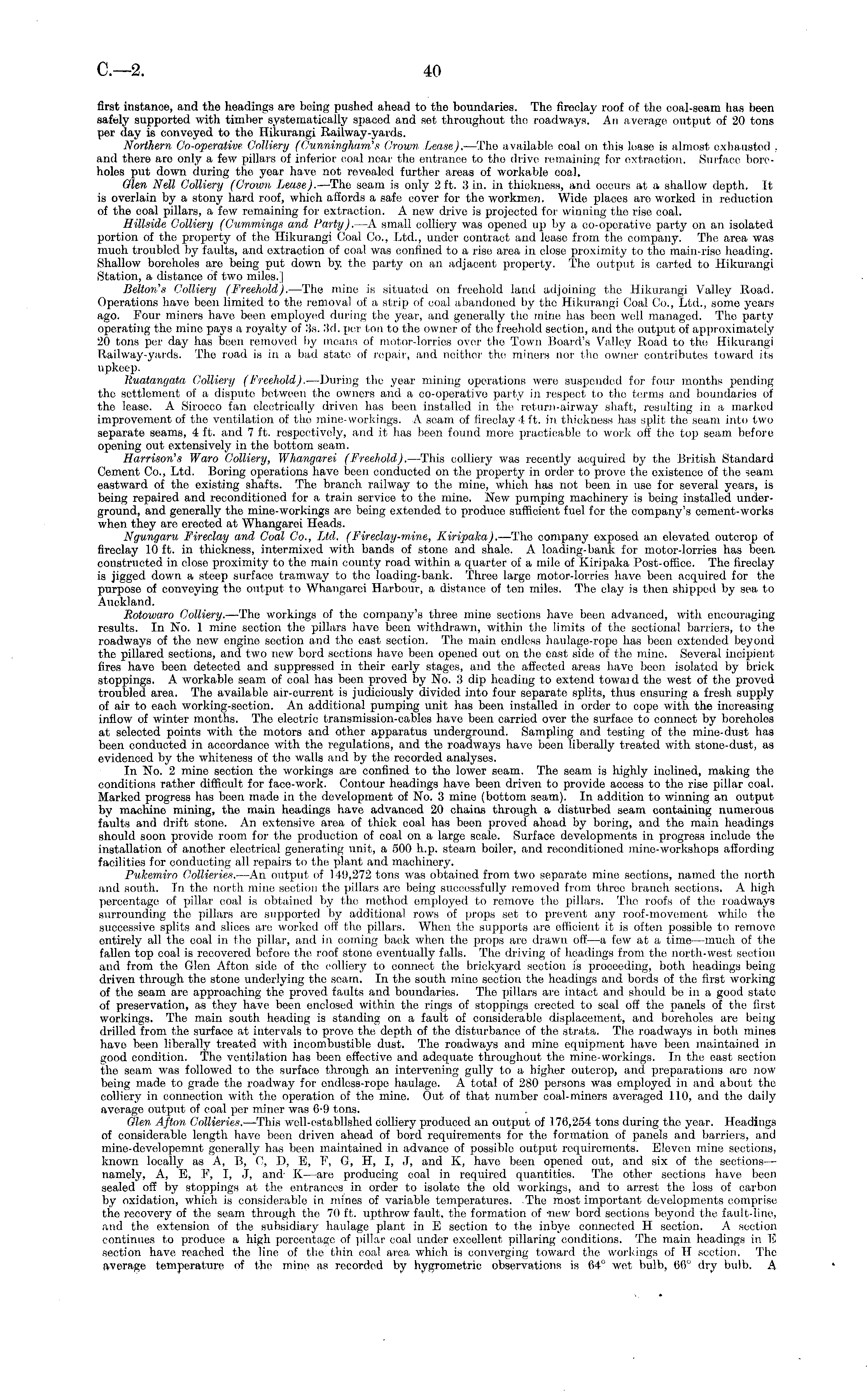 first instance, and the headings are boing pushed ahead to the boundaries. The fireclay roof of the coal-seam has been safely supported with timber systematically spaced and set throughout the roadways. An average output of 20 tons per day is conveyed to the Hikurangi Railway-yards. Northern Go-operative Colliery (Cunningham's Crown Lease). —The available coal on this lease is almost exhausted , and thoro are only a few pillars of inferior coal near the entrance to tho drive remaining for extraction. Surface boreholes put down during the year have not revealed further areas of workable coal. Glen Nell Colliery (Crown Lease). —The seam is only 2 ft. 3 in. in thickness, and occurs at a shallow depth. It is overlain by a stony hard roof, which allords a safe cover for the workmen. Wide places are worked in reduction of the coal pillars, a few remaining for extraction. A new drive is projoeted for winning tho rise coal. Hillside Colliery (Cummings and Party). —A small colliery was opened up by a co-operative party on an isolated portion of the property of the Hikurangi Coal Co., Ltd., under contract and lease from the company. The area was much troubled by faults, and extraction of coal was confined to a rise area in close proximity to tho main-rise heading. Shallow boreholes are being put down by. the party on an adjacent property. The output is carted to Hikurangi Station, a distance of two miles.] Belton's Colliery (Freehold). —The mine is situated on freehold laud adjoining the Hikurangi Valley Road. Operations have been limited to the removal of a strip of coal abandoned by tho Hikurangi Coal Co., Ltd., some years ago. Pour miners have been employed during the year, and generally the mine has been well managed. The party operating the mine pa3 7 s a royalty of 3s. 3d. per ton to the owner of the freehold section, and the output of approximately 20 tons per day has been removed by means of motor-lorries over the Town Hoard's Valley Road to the Hikurangi Railway-yards. The road is in a bad state of repair, and neither the miners nor the owner contributes toward its v pkeep. Ruatangata Colliery (Freehold). —During the year mining operations were suspended for four months pending the settlement of a dispute between the owners and a co-operativo party in respect to the terms and boundaries of tho lease. A Sirocco fan electrically driven has been installed in the return-airway shaft, resulting in a marked improvement of the ventilation of tho mine-workings. A scam of fireclay 4 ft. in thickness has split the seam into two separate seams, 4 ft. and 7 ft. respectively, and it has been found more practicable to work off the top seam before oponing out extensively in the bottom seam. Harrison's Waro Colliery, Whangarei (Freehold). —This colliery was recently acquired by the British Standard Cement Co., Ltd. Boring operations have been conducted on the property in order to prove the oxistenco of tho seam eastward of the existing shafts. The branch railway to the mine, which has not been in use for several years, is being repaired and reconditioned for a train sorvice to the mine. New pumping machinery is being installed underground, and generally the mine-workings are being extended to produco sufficient fuel for tho company's cement-works when they are erected at Whangarei Heads. Ngnngaru Fireclay and Coal Co., Ltd. (Fireclay-mine, Kiripaka). —Tho company exposed an elevated outcrop of fireclay 10 ft. in thickness, intermixed with bands of stone and shale. A loading-bank for motor-lorries has been constructed in close proximity to the main county road within a quarter of a mile of Kiripaka Post-office. Tho fireclay is jigged down a steep surface tramway to the loading-bank. Three largo motor-lorries have been acquired for the purpose of convoying the output to Whangarei Harbour, a distance of ten miles. The clay is then shipped by sea to Auckland. Rotowaro Colliery. —The workings of tho company's three mine sections have been advanced, with encouraging results. In No. 1 mine section the pillars have been withdrawn, within tho limits of the sectional barriers, to the roadways of tho new engine section and the oast section. The main endless haulage-rope has been extended beyond the pillared sections, and two new bord sections have been opened out on the oast side of the mine. Several incipient fires have been detected and suppressed in their early stages, and the affected areas have been isolated by brick stoppings. A workable seam of coal has been proved by No. 3 dip heading to extend towaid the west of the proved troubled area. The available air-current is judiciously divided into four separate splits, thus onsuring a fresh supply of air to each working-section. An additional pumping unit has been installed in order to cope with the increasing inflow of winter months. Tho electric transmission-cables have been carried over tho surface to connect by boreholes at selected points with tho motors and other apparatus underground. Sampling and testing of the mine-dust has been conducted in accordance with the regulations, and the roadways have boen liberally treated with stono-dust, as evidenced by tho whiteness of the walls and by the recorded analyses. In No. 2 mine section the workings are confined to the lower seam. The soam is highly inclined, making the conditions rather difficult for faco-work. Contour headings have been driven to provide access to the rise pillar coal. Marked progress has been made in tho development of No. 3 mine (bottom seam). In addition to winning an output by machine mining, the main headings have advanced 20 chains through a disturbed seam containing numerous faults and drift stone. An extensive area of thick coal has beon proved ahead by boring, and the main headings should soon provide room for tho production of coal on a large scale. Surface developments in progress include the installation of another electrical generating unit, a 500 h.p. steam boiler,