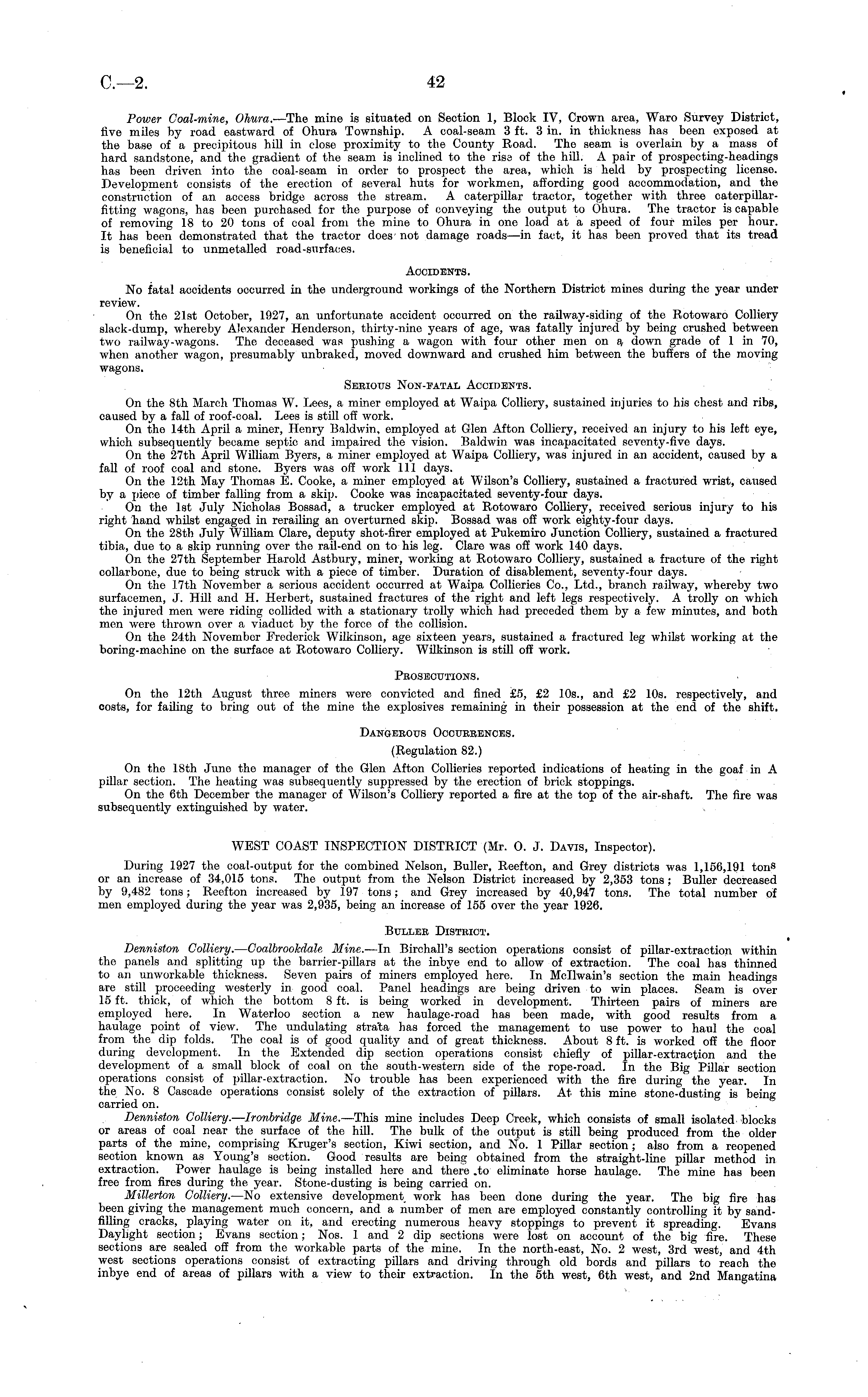 Power Coal-mine, Ohura.- —Tho mine is situated on Section 1, Block IV, Crown area, Waro Survey District, five miles by road eastward of Ohura Township. A coal-seam 3 ft. 3 in. in thickness has been exposed at the base of a precipitous hill in close proximity to the County Road. The seam is overlain by a mass of hard sandstone, and tho gradient of tho soam is inclined to tho rise of the hill. A pair of prospeeting-headings has been driven into the coal-seam in order to prospect the area, which is held by prospecting license. Development consists of the erection of several huts for workmen, affording good accommodation, and the construction of an access bridge across the stream. A caterpillar tractor, together with three caterpillarfitting wagons, has been purchased for the purpose of conveying the output to Ohura. The tractor is capable of removing 18 to 20 tons of coal from the mine to Ohura in one load at a speed of four miles per hour. It has been demonstrated that the tractor does' not damage roads —in fact, it has been proved that its tread is beneficial to unmetalled road-surfaces. Accidents. No fatal accidents occurred in the underground workings of the Northern District mines during the year under review. On the 21st October, 1927, an unfortunate accident occurred on the railway-siding of tho Rotowaro Colliery slack-dump, whereby Alexander Henderson, thirty-nine years of age, was fatally injured by being crushed between two railway-wagons. The deceased was pushing a wagon with four other men on a down grade of 1 in 70, when another wagon, presumably unbraked, moved downward and crushed him between the buffers of the moving wagons. Serious Non-fatal Accidents. .' On the Bth March Thomas W. Lees, a miner employed at Waipa Colliery, sustained injuries to his chest and ribs, caused by a fall of roof-coal. Lees is still off work. On the 14th April a miner, Henry Baldwin, employed at Glen Afton Colliery, received an injury to his left eye, which subsequently became septic and impaired the vision. Baldwin was incapacitated seventy-five days. On the 27th April William Byers, a miner employed at Waipa Colliery, was injured in an accident, caused by a fall of roof coal and stone. Byers was off work 111 days. On the 12th May Thomas E. Cooke, a miner employed at Wilson's Colliery, sustained a fractured wrist, caused by a piece of timber falling from a skip. Cooke was incapacitated seventy-four days. On the Ist July Nicholas Bossad, a trucker employed at Rotowaro Colliery, received serious injury to his right hand whilst engaged in rerailing an overturned skip. Bossad was off work eighty-four days. On the 28th July William Clare, deputy shot-firer employed at Pukemiro Junction Colliery, sustained a fractured tibia, due to a skip running over the rail-end on to his leg. Clare was off work 140 days. On the 27th September Harold Astbury, miner, working at Rotowaro Colliory, sustained a fracture of the right collarbone, due to being struck with a piece of timber. Duration of disablement, seventy-four days. On the 17th November a serious accident occurred at Waipa Collieries Co., Ltd., branch railway, whereby two surfacemen, J. Hill and H. Herbert, sustained fractures of the right and left legs respectively. A trolly on which the injured men were riding collided with a stationary trolly which had preceded them by a few minutes, and both men were thrown over a viaduct by the force of the collision. On the 24th November Frederick Wilkinson, age sixteen years, sustained a fractured leg whilst working at the boring-machine on the surface at Rotowaro Colliery. Wilkinson is still off work. Prosecutions. On the 12th August three miners were convicted and fined £5, £2 10s., and £2 10s. respectively, and costs, for failing to bring out of the mine the explosives remaining in their possession at the end of the shift. Dangerous Occurrences. (Regulation 82.) On the 18th June the manager of the Glen Afton Collieries reported indications of heating in the goaf in A pillar section. The heating was subsequently suppressed by the erection of brick stoppings. On the 6th December the manager of Wilson's Colliery reported a fire at the top of the air-shaft. The fire was subsequently extinguished by water. < WEST COAST INSPECTION DISTRICT (Mr. O. J. Davis, Inspector). During 1927 the coal-output for the combined Nelson, Bullor, Reefton, and Grey districts was 1,156,191 ton ß or an increase of 34,015 tons. The output from the Nelson District increased by 2,353 tons ; Buller decreased by 9,482 tons; Reefton increased by 197 tons; and Groy increased by 40,947 tons. The total number of men employed during the year was 2,935, being an increase of 155 over the year 1926. Buller District. Denniston Colliery. — Coalbrookdale Mine. —ln Birchall's section operations consist of pillar-extraction within the panels and splitting up the barrier-pillars at the inbye end to allow of extraction. The coal has thinned to an unworkable thickness. Seven pairs of miners employed here. In Mcllwain's section the main headings are still proceeding westerly in good coal. Panel headings are being driven to win places. Seam is over 15 ft. thick, of which the bottom 8 ft. is being worked in development. Thirteen pairs of miners are employed here. In Waterloo section a new haulage-road has been made, with good results from a haulage point of view. The undulating strata has forced the management to use power to haul the coal from the dip folds. The coal is of good quality and of great thickness. About 8 ft. is worked off the floor during development. In the Extended dip section operations consist chiefly of pillar-extraction and the development of a small block of coal on tho south-western side of the rope-road. In the Big Pillar section operations consist of pillar-extraction. No trouble has been experienced with the fire during the year. In the No. 8 Cascade operations consist solely of the extraction of pillars. At this mine stone-dus