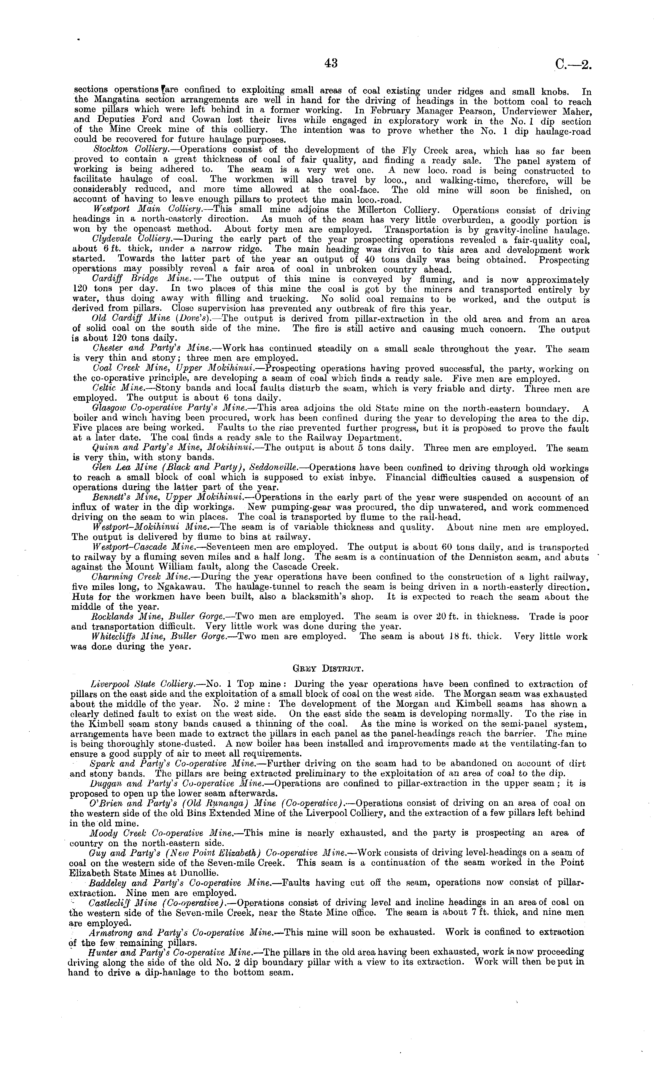 sections operations fare confined to exploiting small areas of coal existing under ridges and small knobs. In the Mangatina section arrangements are well in hand for the driving of headings in the bottom coal to reach some pillars which were left behind in a former working. In February Manager Pearson, Underviewer Maher, and Deputies Ford and Cowan lost their lives while engaged in exploratory work in the No. 1 dip section of tho Mine Creek mine of this colliery. The intention was to prove whether the No. 1 dip haulage-road could bo recovered for future haulage purposos. Stockton Colliery. —Operations consist of the development of the Fly Creek area, which has so far been proved to contain a great thickness of coal of fair quality, and finding a ready sale. The panel system of working is being adhered to. The seam is a very wet one. A new loco, road is being constructed to facilitate haulage of coal. The workmen will also travel by loco., and walking-time, therefore, will be considerably reduced, and more time allowed at the coal-face. The old mine will soon be finished, on account of having to leave enough pillars to protect the main loco.-road. Westport Main Colliery. —This small mine adjoins the Millerton Colliery. Operations consist of driving headings in a north-easterly direction. As much of the scam has very little overburden, a goodly portion is won by the opencast method. About forty men are employed. Transportation is by gravity-incline haulage. Clydevale Colliery. —During the early part of tho year prospecting operations revealed a fair-quality coal, about 6 ft. thick, under a narrow ridge. The main heading was driven to this area and development work started. Towards the latter part of the year an output of 40 tons daily was being obtained. Prospecting operations may possibly reveal a fair aroa of coal in unbroken country ahead. Cardiff Bridge Mine. —The output of this mine is conveyed by fluming, and is now approximately 120 tons per day. In two places of this mine the coal is got by the miners and transported entirely by water, thus doing away with filling and trucking. No solid coal remains to be worked, and the output is derived from pillars. Close supervision has prevented any outbreak of fire this year. Old Cardiff Mine (Dove's). —The output is derived from pillar-extraction in the old aroa and from an area of solid coal on the south side of the mine. The fire is still active and causing much concern. The output is about 120 tons daily. Chester and Party's Mine. —Work has continued steadily on. a small scale throughout the yoar. The seam is very thin and stony; three men are employod. Goal Greek Mine, Upper Mokihinui. —Prospecting operations having proved successful, the party, working on the co-operative principle, arc developing a seam of coal which finds a ready sale. Five men are employed. Celtic Mine. —Stony bands and local faults disturb the seam, which is very friable and dirty. Three men are employed. The output is about 0 tons daily. Glasgow Co-operative Party's Mine. —This area adjoins the old State mine on the north-eastern boundary. A boiler and winch having been procured, work has been confined during the year to developing the area to the dip. Five places are being worked. Faults to the rise prevented further progress, but it is proposed to prove the fault at a later date. The coal finds a ready sale to the Railway Department. Quinn, and Party's Mine, Mokihinui. —The output is about 5 tons daily. Three men are employed. The seam is very thin, with stony bands. Glen Lea Mine (Black and Party), Seddonville. —Operations have been confined to driving through old workings to reach a small block of coal which is supposed to exist inbye. Financial difficulties caused a suspension of operations during tho latter part of the year. Bennett's Mine, Upper Mokihinui. —Operations in the early part of the year were susponded on account of an influx of water in the dip workings. New pumping-gear was procured, the dip unwatered, and work commenced driving on tho seam to win places. The coal is transported by flume to the rail-head. Westport-Mokihinui Mine. —The seam is of variable thickness and quality. About nine men are employed. Tho output is delivered by flume to bins at railway. Westport-Cascade Mine. —Seventeen men are employed. The output is about 60 tons daily, and is transported to railway by a fluming seven miles and a half long. The seam is a continuation of the Denniston seam, and abuts against the Mount William fault, along the Cascade Creek. Charming Creek Mine. —During the year operations have been confined to the construction of a light railway, five miles long, to Ngakawau. The haulage-tunnel to reach the seam is being driven in a north-easterly direction. Huts for the workmen have been built, also a blacksmith's shop. It is expected to reach the seam about the middle of the year. Rocklands Mine, Buller Gorge. —Two men are employed. The seam is over 20 ft. in thickness. Trade is poor and transportation difficult. Very little work was done during the year. Whiiecliffs Mine, Buller Gorge. —Two men are employed. The seam is about 18 ft. thick. Very little work was done during the yoar. Grey District. Liverpool State Colliery. —No. 1 Top mine : During the year operations have been confined to extraction of pillars on the east side and the exploitation of a small block of coal on the west side. The Morgan seam was exhausted about the middle of the year. No. 2 mine : The development of the Morgan and Kimboll seams has shown a clearly defined fault to exist on the west side. On the east side the seam is developing normally. To the rise in tho Kimbell seam stony bands caused a thinning of the coal. As the mine is worked on the semi-panel system, arrangements have been made to extract the pillars in each panel as the panel-headings reach the barrier. The mine is being thoroughly stone-dusted. A new boiler has been installed and i