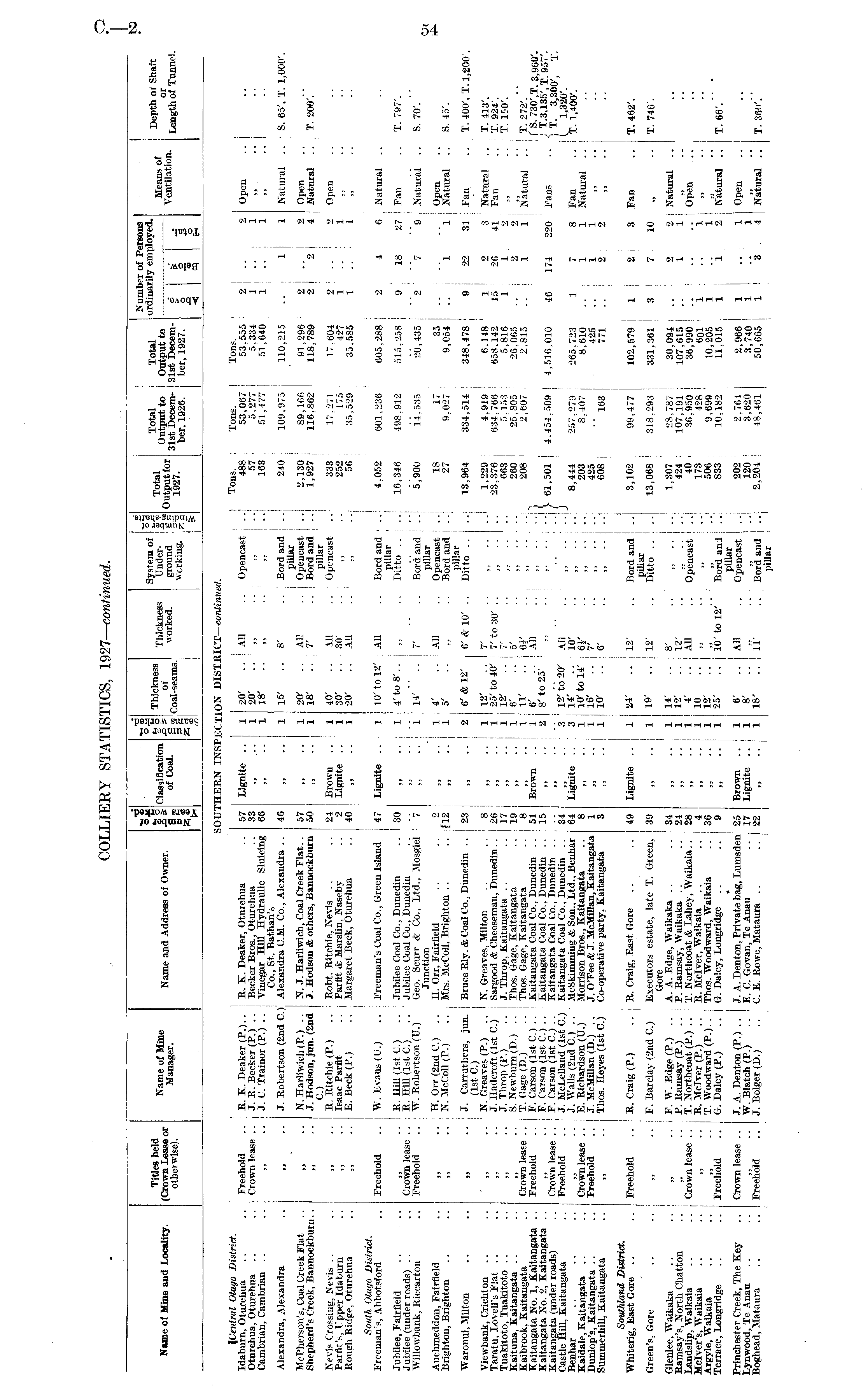 Name of Mine and Locality. Titles held (Crown Lease or otherwise). Name of Mine Manager. Name and Address of Owner. res — ai is r" Classification of Coal. |f| Thickness | S ~'j! 0u^_ or Out^to J g Coal-seam,' — —. Jj °"_._.'°' Decern- 31^Decem- ■"' ! L_ I Total Number of Persons ordinarily employed. Depth of Shaft Means of F or S I i I j Ventilation. Tj __ gtho£ Tannci s \ s \ s < I W | £ OU^ TIFRN INSPECT] ON DISTRICT— -continual. {Central Otago District. Idaburn, Oturehua Oturehua. Oturehua Cambrian, Cambrian Alexandra, Alexandra McVherrson's, Coal Creek Flat Shepherd's Creek, Bannockburn.. Freehold .. R. K. Deaker (P.).. R. K. Deaker, Oturehua .. 57 I Crown lease .. J. R. Becker (P.) .. Becker Bros., Oturehua .. 33 ..I J. C. Trainor (P.) .. Vinegar Hill Hydraulic Sluicing 66 Co., St. Bathan'.- „ .. J. Robertson (2nd C.) Alexandra CM. Co., Alexandra .. 46 „ .. N. Harliwich (P.) .. N. J. Harliwich, Coal Creek Flat.. 57 ,, J. Hodson, jun. (2nd J. Hodson & others. Bannockburn 50 C.) .. R. Ritchie (P.) .. Robt. Ritchie, Nevis .. ..24 ,, .. Isaac Parfit .. j Parfit & Marslin. Nasebv .. 2 .. E. Beck (P.) .. Margaret Beck, Otnrehiia ..40 57 66 46 57 50 Lignite .. 1 1 1 ..1 1 I Tons. Tons. Tons. 20' .. AH .. Opencast .. 488 53,067 53,555 I 2 I .. 20' .. „ .. 57 5,277 5.334 1 .. | 18' . . .. „ .. 163 51,477 51,640 1 .. 15' .. 8' .. Bordand .. 240 109.975 110,215 ! .. 1 pillar 20' .. Al! .. Opencast .. 2,130 89.166 91,296 2| .. 18' .. 1' .. Bordand .. 1,927 116,862 118,789 2 1 2 pillar 40' .. Al! .. Opencast .. 333 17.271 17.604 2 30' ..30' .. | „ .. 252 175 I 427 1 .. 20' .. All .. I ,, .. 56 35.529 35.585 1 2 Open 1 1 1 Natural .. S. 65', T. 1,000'. 2 Open 4 Natural .. T. 200'. 2 Open 1 1 Nevis Crossing, Nevis .. Parlit's, Upper Idaburn Rough Ridge, Oturehua 24 2 fu Brown .. j 1 Lignite .. j 1 i» .. i 1 South Otago District. Freeman's, Abbotsford Freehold .. W. Evans (U.) .. : Freeman's Coal Co.. Green Island 47 Lignite .. j 1 10' to 12' All .. Bord and .. 4,052 601,236 605,288 2 4 pillar 4'to8'.. „ .. ; Ditto .. .. 16,346 498.912 i 515,258 9 IS 14' .. T ... Bordand .. 5,900 14,535 20,435 2 7 pillar 4' .. All .. I Opencast .. 18 17 35 5' .. „ .. Bordand .. 27 9,027 9,054 .. ! 1 pillar 6'& 12' , 6'& 10' .. Ditto .. .. 13,964 334,514 348,478 9 22 12' .. ! 7' .. ,, .. .. 1.229 4.919 6.148 1 : 2 25'to40' 7'to30' .. „ .. .. 23.376 634.766 658,142 15 26 12' .. 7' .. ,,.... 663 5.153 5,816 1 1 6' ..5' .. ,,.... 260 25.805 20,065 I .. j 2 11' -.64' .. ...... 208 2.607 2,815 .. 1 6; _ _. . All .. __ .. ..1 8 t0 2 ° " •■ " '• ■■ > 61,501 4,454,509 4,516,010 46 174 12' to 20' All . . " . . * J U' -■ 10' .. .. .. 8,444 257.279 265.723 1 7 10' to 14' ; 64/ .. ,, .. .. 203 8.407 .. 1 16' •- | 7' .. „ .. .. 425 .. - '425 ... 1 10 . • 6' .. .. 608 163 771 .. i 2 2-1' .. j 12' .. Bordand .. 3,102 99,477 102,579 1 2 , pillar 19 - - I 12' .. Ditto .. .. 13,068 318,293 331,361 3 | 7 1*' ■• j 8' .. .. .. 1,307 2S.787 30,094 .. ' 2 12' .. 12' .. , 424: 107,191 107,615' .. 1 •4' ..All .. Opencast .. 40 36.950 36,990 10 •• „ .. | .. 173 428 601 j 1 12' .. ! „ .. .; .. 506 9.699 10.205 1 25' .. 10' to 12' j Bord an J .. 833 10,182 11,015 1 1 pillar 6' ..AH .. Opencast .. 202 2,764 2,966 1 8' .. ,, .- 120 3,620 3,740 1 18' .. 11' .. I Bordand .. 2,204 48,461 50,665 1 3 pillar 6 Natural 27 Fan . . T. 797'. "9 Natural .. S. 70'. " .. j Open 1 | Natural .. S. 4.V. 31 ; Fan ..IT. 400', T. 1,200'. 3 Natural .. T. 413'. 41 Fan . . T. 924'. 2 ,, . . T. 130'. 2 1 : Natural '. .' T. 272'. f S. 730',T. 3,960'. "■'0 Fan= .. T.3,135',T.957\ --" iaru ■• 1 T. 3,300', T. I 1,320'. 8 Fan .. T. 1,400'. 1 Natural 1 2 3 i Fan .. T. 462'. 10 .. T. 746'. 2 Natural 1 ; „ .. I Open ... I l\ :; :: 2 1 "Natural .. T. 66'. 1 Open 1 4 Natural .. T. 360'. Jubilee, 3*"airfield Jubilee (under roads) . . Willowbank, Riccarton Auchmeddon. Fairfield Brighton, Brighton Waronui, Milton Viewbank, Crichton Taratu, Lovell's Flat .. Tuakitoto, Tuakitoto Kaituna, Kaitangata Kaibrook, Kaitangata Kaitangata No. 1, Kaitangata .. Kaitangata No. 2, Kaitangata .. Kaitangata (under roads) Castle Hill, Kaitangata Benhar .. Kaidale, Kaitangata Dunlop's, Kaitangata .. .. i Summerhill, Kaitangata .. i R. Hill (1st C.) .. Jubilee Coal Co., Dunedin .. I 30 Crown lease .. R. Hill (1st C.) .. ! Jubilee Coal Co.. Dunedin Freehold .. W. Robertson (U.) j Geo. Scurr & Co., Ltd., Mosgiel 7 Junction .. H. Orr (2nd C.) .. i H. Orr. Fairfield .. .. 2 .. N. McColl(P.) .. j Mrs. McColl, Brighton .. .. {12 „ ..J. Carruthers, jun. Bruce Rlv. & Coal Co., Dunedin .. 23 (1st C.) ,, .. N. Greaves (P.) .. ; N. Greaves, Milton .. 8 ,, .. J. Hadcroft (1st C.) Sarsood & Cheeseniaii. Dunedin.. 26 .. J. Throp(P.) .. J. Throp, Kaitangata .. ..17 ,, .. S. Newuurn (D.) .. Thos. Gage, Kaitangata .. 19 Crown lease .. T. Gage (D.) .. Thos. Gage, Kaitangata .. 8 Freehold .. F. Carson (1st C.) .. Kaitangata Coal Co., Dunedin .. 51 ,, .. F. (arson (1st C.) .. Kaitangata Coal Co. j Dunedin .. 15 Crown lease .. F. Carson (1st C.) .. Kaitangata Coal Co., Dunedin .. Freehold .. J. McLelland (1st C.) Kaitangata Coal Co., Dunedin .. 34 .. J. Walls (2ud C.) .. McSkimming & Son., Ltd., Benhar 64 Crownlease .. E. Richardson (U.) Morrison Bros.. Kaitangata .. 8 Freehold .. J. McMillan (D.) .. J. O'Fee & J. McMillan, Kaitangata 1 „ .. Thos. Heyes (1st C.) Co-operative party, Kaitangata 3 Freehold .. K. Craig (P.) .. I R. Craig, East Gore .. .. 49 .. i i i i 2 1 1 1 1 1 Brown .. 1 2 Lignite .. 3 1 • • 1 Southland District. Whiterig, East Gore .. Lignite .. 1 j 49 .... Green's, Gore .. F. Barclay (2nd C.) Executors estate, late T. Gieen, 39 Gore .. I F. W. Edge (P.) .. A. A. Edge, Waikaka . . .. ' 34 ... P. Ramsav (P.) .. P. Ramsay, Waikaka .. ..24 Crown lease .. T. Northcoat (P.) .. T. Xorthcoat ft Lahev. Waikaia. . 28 .. R. McIver(P.) .. R. Mclver. Waikaia ' .. .. I 4 „ .. T. Woodward (P.).. Thos. Woodward. Waikaia ..36 Freehold .. G