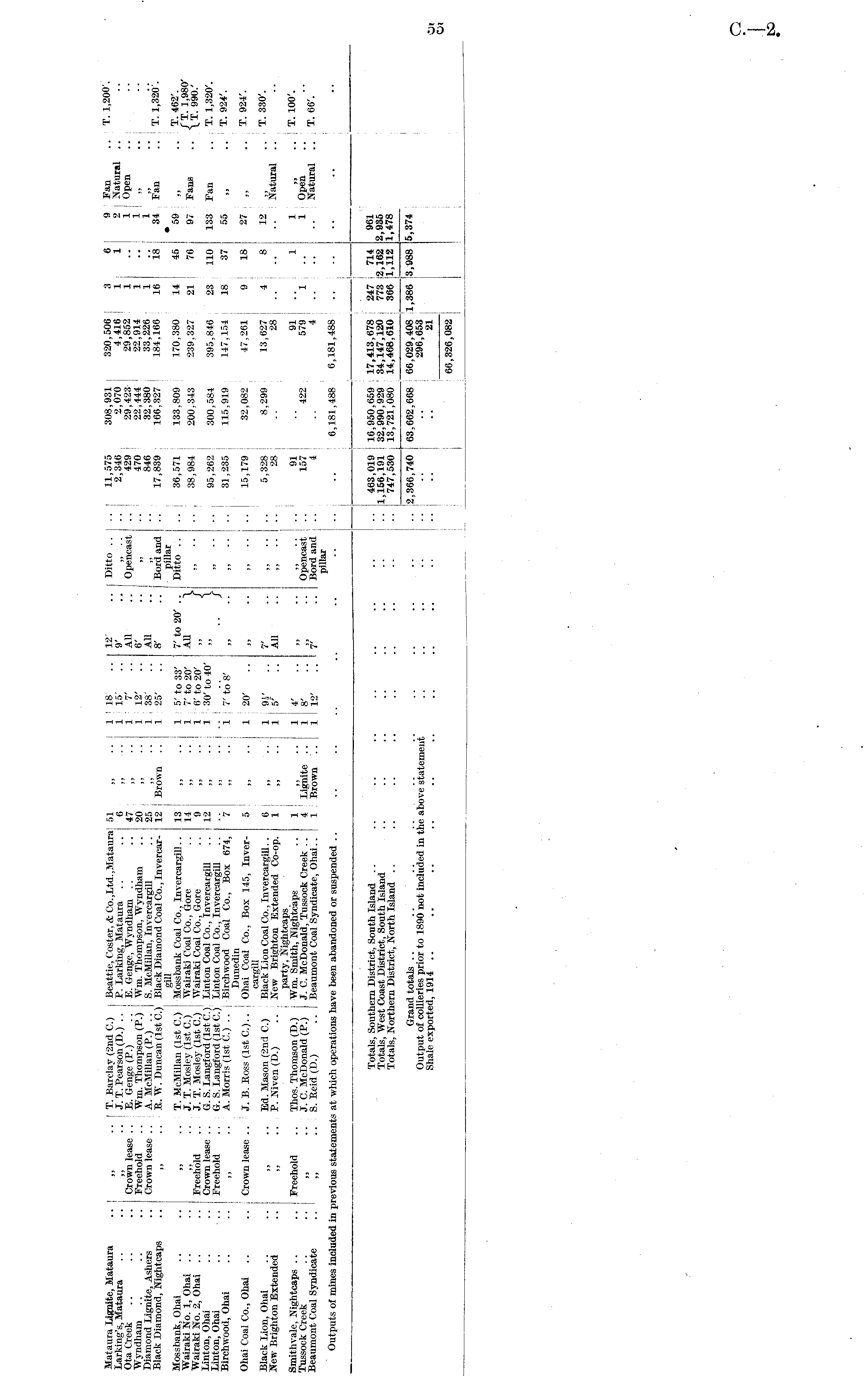 Mataura Lignite, Mataura Larking's, Mataura Ota Creek Diamond Lignite, Ashers Black Diamond, Nightcaps .. ! T. Barclav (2nd C.) j Beattie. Coster, A Co.,Ltd.. Mataura 51 ,, .. I 1 I 18 ..I J. T.Pearson (D.) .. ! P. Larking, Mataura .. .. 6 ,, .. 1 15 Crownlease.. E. Genge (P.) .. [ E. Genge, Wyndham .. ..47 ,, .. 1 T Freehold .. Wm. Thompson (P.) ! Win. Thompson, Wvndham ..20 ,. .. 1 12' Crown lease .. A. McMillan (P.) .. | S. McMillan, Invercargill 25 ! „ .. 1 38' ,, .. R. W. Duncan (1st C.) Black Diamond Coal Co., Invercar- 12 .. 1 25' gill .. T. McMillan (1st C.) Mossbank Coal Co., Invercargill.. 13 ,, .. 1 I 5' to 33' .. J. T. Moslev (1st C.) Wairaki Coal Co.. Gore .. 14 „ .. 1 7' to 20' Freehold .. J. T. Mosley (1st C.) Wairaki Coal Co., Gore .. 9 ,, .. 1 I'6' to 20' Crownlease .. G. S. Langford(lst C.) Linton Coal Co., Invercargill ..12 ,, .. 1 I -30' to 40' Freehold .. G. S. Langford(lst C.) Linton Coal Co., Invercargill .. .. ,, .. .. A. Morris (1st C.) .. ; Birchwood Coal Co., Box 674, 7 ,, .. 1 ! 7'to 8' Dunedin Crownlease.. J. B. Ross (1st C).. ! Ohai Coal Co., Box 145, Inver- 5 „ .. 1 20' eargill .. Ed. Mason (2nd C.) Black Lion Coal Co., Invercargill.. 6 „ .. 1 9J' P. Niven (D.) .. New Brighton Extended Co-op. 1 ,, ..115' partv. Nightcaps Freehold .. Thos. Thomson (D.) Wm. Smith. Nightcaps .. 1 ,, ..114' „ .. J. C. McDonald (P.) : J. C. McDonald, Tussock Creek .. 4 Lignite ..118' ,, .. S. Reid (D.) .. I Beaumont Coal Syndicate, Ohai.. 1 I Brown .. I 1 12' 12 9' All 6' All 8' Ditto Opencast Bord and pillar Ditto .. .. ( Opencast Bord and pillar 11,575 308,931 2,346 2,070 429 29,423 470 22,444 846 32.380 17,839 166,327 36,571 : 133,809 38,984 200.343 95,262 300,584 31,235 115,919 15,179 32,082 5,328 8.299 28 91 157 422 4 6,181,488 320.506 3 6 9 Fan .. T. 1,200-. 4.416 1 1 | 2 Natural 29,852 1 ..| 1 Open 22,914 1 .. ! 1 ' „ 33,226 1 .. j 1 „ 184,166 16 18 34 Fan .. T. 1,320'. 170,380 14 | 45 59 „ .. T. 462'. 239,327 21 76 97 Fans .. {£ 9 Q 8 ?' 395,846 23 110 133 Fan .. T. 1,320'. 147,154 18 37 55 „ .. T. 924'. 47,261 9 18 27 ,, .. T. 924'. 13.627 i 4 8 12 ., .. T. 330'. 28 .. ! .. .. Natural 91 .. 1 1 „ .. T. 100'. 579 1 i ■. 1 Open 4 ...... .. Natural .. T. 66'. 6,181,488 Mossbank, Ohai Wairaki No. 1, Ohai Wairaki No. 2, Ohai Linton, Ohai Linton, Ohai Birchwood, Ohai 7' to 20' . . All \ Ohai Coal Co., Ohai .. .. , Black Lion, Ohai New Brighton Extended Smithvaie, Nightcaps Tussock Creek .. Beaumont Coal Syndicate 7' All Outputs of mines included in pi ■evious statements at which operations have been abandoned or suspended Totals, Southern District, South Island Totals, West Coast Distriot, South Island Totals, Northern District, North Island .. 463,019 : 16,950.659 17,413,678 247 .. 1,156,191:32,990.929 34,147,120 773 747,530 13,721.080 14,468,610 366 714 2,162 1,112 714 961 2,162 2,935 5,112 1,478 ! 3,988 5,374 i Grand totals Output of collieries prior to 1890 not included in the above statement Shale exported, 1914 .. .. 2,366,740 : 63.662.668 66,029,408 1,386 ..' 296,653 21 66,326,082 ! I I I