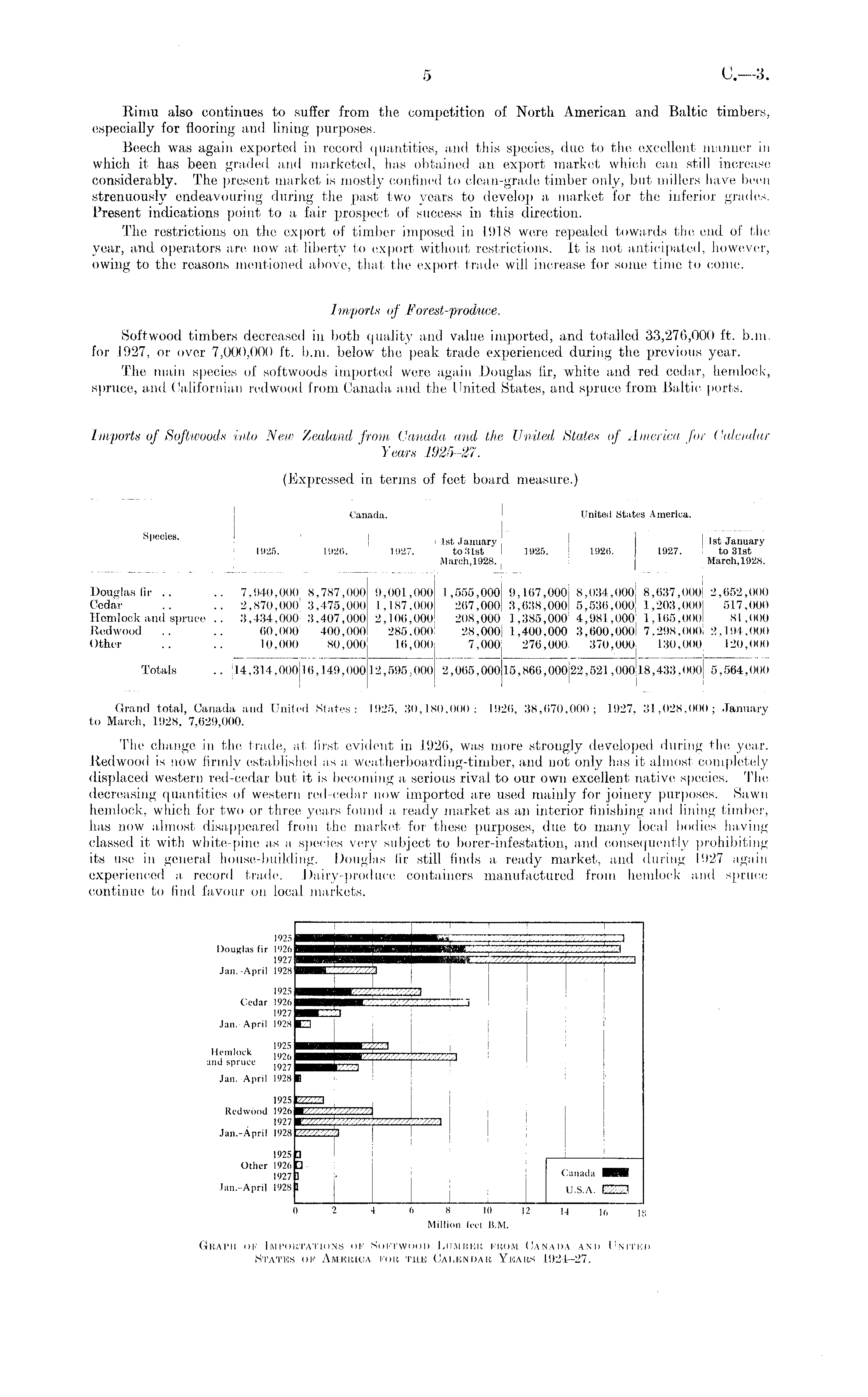 Rimu also continues to suffer from the competition of North American and Baltic timbers, especially for flooring and. lining purposes. Beech was again exported in record quantities, and this species, due to the excellent manner in which it has been graded and marketed, has obtained an export market which can still increase considerably. The present market is mostly confined to clean-grade timber only, but millers have been strenuously endeavouring during the past two years to develop a market for the inferior grades. Present indications point to a fair prospect of success in this direction. The restrictions on the export of timber imposed in 1918 were repealed towards the end of the year, and operators are now at liberty to export without restrictions. It is not anticipated, however, owing to the reasons mentioned above, that the export trade will increase for some time to come. Imports of Forest-produce. Softwood timbers decreased in both quality and value imported, and totalled 33,276,000 ft. b.m. for 1927, or over 7,000,000 ft. b.m. below the peak trade experienced during the previous year. The main species of softwoods imported were again Douglas fir, white and red cedar, hemlock', spruce, and Californian redwood from Canada and the United States, and spruce from Baltic ports. Imports of Softwoods into New Zealand from Canada and the United States of America for Calendar Years 1925-27.