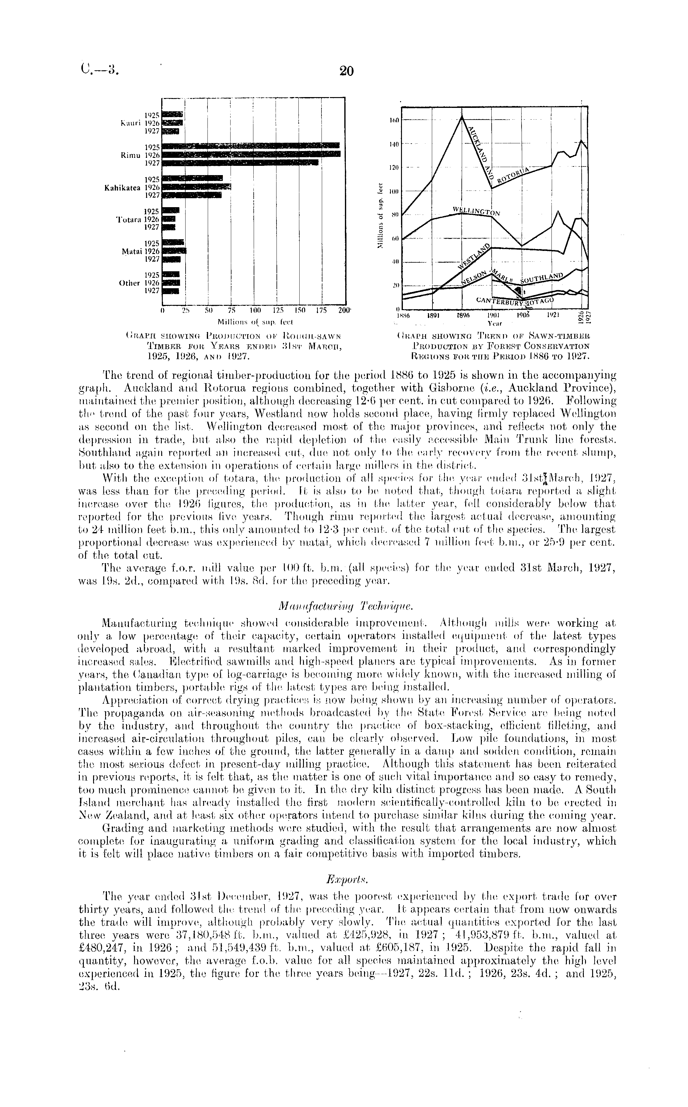 The trend of regional timber-production for the period 1886 to 1925 is shown in the accompanying graph. Auckland, and Rotorua regions combined, together with Gisborne (i.e., Auckland Province), maintained the premier position, although decreasing 12-6 per cent, in cut compared to 1926. Following the trend of the past four years, Westiand now holds second place, having firmly replaced Wellington as second on the list. Wellington decreased most of the major provinces, and reflects not only the depression in trade, but also the rapid depletion of the easily accessible Main Trunk line forests. Southland again reported an increased cut, due not only to the early recovery from the recent slump, but also to the extension in operations of certain large millers in the district. With the exception, of totara, the production of all species for the year ended 31stJMarch, 1927, was less than for the preceding period. It is also to be noted that, though totara reported a slight increase over the 1926 figures, the production, as in the latter year, fell considerably below that reported for the previous five years. Though rimu reported the largest actual decrease, amounting to 24 million feet b.m., this only amounted to 12-3 per cent, of the total cut of the species. The largest proportional decrease was experienced by matai, which decreased 7 million feet b.m., or 25-9 per cent, of the total cut. The average f.o.r. mill value per 100 ft. b.m. (all species) for the year ended 31st March, 1927, was 19s. 2d., compared with 19s. Bd. for the preceding year. Mm tufacturi'i i,g 1 'echnique. Manufacturing technique showed considerable improvement. Although mills were working at only a low percentage of their capacity, certain operators installed equipment of the latest types developed abroad, with a resultant marked improvement in their product, and correspondingly increased sales. Electrified sawmills and high-speed planers are typical improvements. As in former years, the Canadian type of log-carriage is becoming more widely known, with the increased milling of plantation timbers, portable rigs of the latest types are being installed. Appreciation of correct drying practices is now being shown by an increasing number of operators. The propaganda on air-seasoning methods broadcasted by the Stato Forest Service are being noted by the industry, and throughout the country the practice of box-stacking, efficient filleting, and increased air-circulation throughout piles, can be clearly observed. Low pile foundations, in most cases within a few inches of the ground, the latter generally in a damp and sodden condition, remain the most serious defect in present-day milling practice. Although this statement has been reiterated in previous reports, it is felt that, as the matter is one of such vital importance and so easy to remedy, too much prominence cannot be given to it. In the dry kiln distinct progress has been made. A. South Island merchant has already installed the first modern scientifically-controlled kiln to be erected in New Zealand, and at least six other operators intend to purchase similar kilns during the coining year. Grading and marketing methods were studied, with the result that arrangements are now almost complete for inaugurating a uniform grading and classification system for the local industry, which it is felt will place native timbers on a fair competitive basis with imported timbers. Exports. The. year ended 31st December, L 927, was the poorest experienced by the export trade for over thirty years, and followed the trend of the preceding year. It appears certain that from now onwards the trade will improve, although probably very slowly. The actual quantities exported for the last three years were 37,180,548 ft. b.m., valued at £425,928, in 1927; 41,953,879 ft. b.m., valued, at £480,247, in .1926; and 51,549,439 ft. b.m., valued at £605,187, in 1925. Despite the rapid fall in quantity, however, the average f.o.b. value for all species maintained approximately the high level experienced in 1925, the figure for the three years being—l 927, 225. lid. ; 1926, 235. 4d. ; and 1925, 235. 6d.