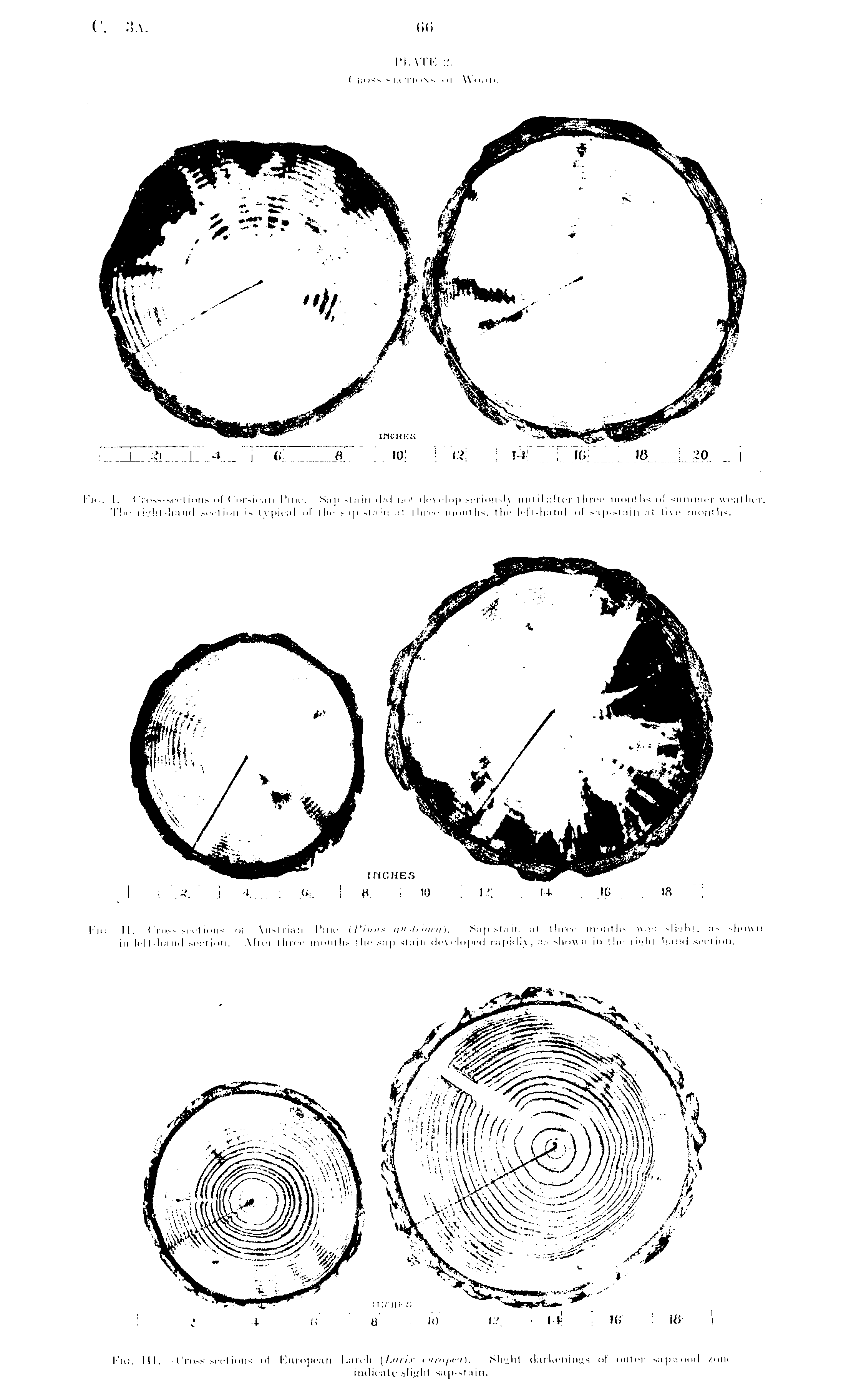 Fig. III.—Cross-sections of European Larch (Larix europea). Slight darkenings of outer sapwood zone indicate slight sap-stain.