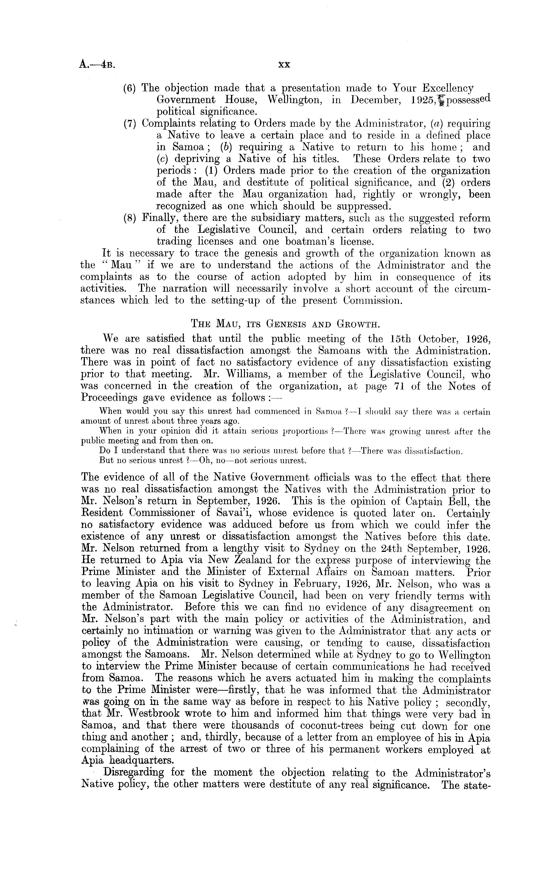 (6) The objection made that a presentation made to Your Excellency Government House, Wellington, in December, 1925, possessed political significance. (7) Complaints relating to Orders made by the Administrator, (a) requiring a Native to leave a certain place and to reside in a defined place in Samoa ; (b) requiring a Native to return to his home ; and (c) depriving a Native of his titles. These Orders relate to two periods : (1) Orders made prior to the creation of the organization of the Mau, and destitute of political significance, and (2) orders made after the Mau organization had, rightly or wrongly, been recognized as one which should be suppressed. (8) Finally, there are the subsidiary matters, such as the suggested reform of the Legislative Council, and certain orders relating to two trading licenses and one boatman's license. It is necessary to trace the genesis and growth of the organization known as the " Mau " if we are to understand the actions of the Administrator and the complaints as to the course of action adopted by him in consequence of its activities. The narration will necessarily involve a short account of the circumstances which led to the setting-up of the present Commission. The Mau, its Genesis and Growth. We are satisfied that until the public meeting of the 15th October, 1926, there was no real dissatisfaction amongst the Samoans with the Administration. There was in point of fact no satisfactory evidence of any dissatisfaction existing prior to that meeting. Mr. Williams, a member of the Legislative Council, who was concerned in the creation of the organization, at page 71 of the Notes of Proceedings gave evidence as follows : — When would you say this unrest had commenced in Samoa ?—I should say there was a certain amount of unrest about three years ago. When in your opinion did it attain serious proportions ? —There was growing unrest after the public meeting and from then on. Do I understand that there was no serious unrest before that ? —There was dissatisfaction. But no serious unrest ?—Oh, no —not serious unrest. The evidence of all of the Native Government officials was to the effect that there was no real dissatisfaction amongst the Natives with the Administration prior to Mr. Nelson's return in September, 1926. This is the opinion of Captain Bell, the Resident Commissioner of Savai'i, whose evidence is quoted later on. Certainly no satisfactory evidence was adduced before us from which we could infer the existence of any unrest or dissatisfaction amongst the Natives before this date. Mr. Nelson returned from a lengthy visit to Sydney on the 24th September, 1926. He returned to Apia via New Zealand for the express purpose of interviewing the Prime Minister and the Minister of External Affairs on Samoan matters. Prior to leaving Apia on his visit to Sydney in February, 1926, Mr. Nelson, who was a member of the Samoan Legislative Council, had been on very friendly terms with the Administrator. Before this we can find no evidence of any disagreement on Mr. Nelson's part with the main policy or activities of the Administration, and certainly no intimation or warning was given to the Administrator that any acts or policy of the Administration were causing, or tending to cause, dissatisfaction amongst the Samoans. Mr. Nelson determined while at Sydney to go to Wellington to interview the Prime Minister because of certain communications he had received from Samoa. The reasons which he avers actuated him in making the complaints to the Prime Minister were —firstly, that he was informed that the Administrator was going on in the same way as before in respect to his Native policy ; secondly, that Mr. Westbrook wrote to him and informed him that things were very bad in Samoa, and that there were thousands of coconut-trees being cut down for one thing and another ; and, thirdly, because of a letter from an employee of his in Apia complaining of the arrest of two or three of his permanent workers employed at Apia headquarters. Disregarding for the moment the objection relating to the Administrator's Native policy, the other matters were destitute of any real significance. The state-