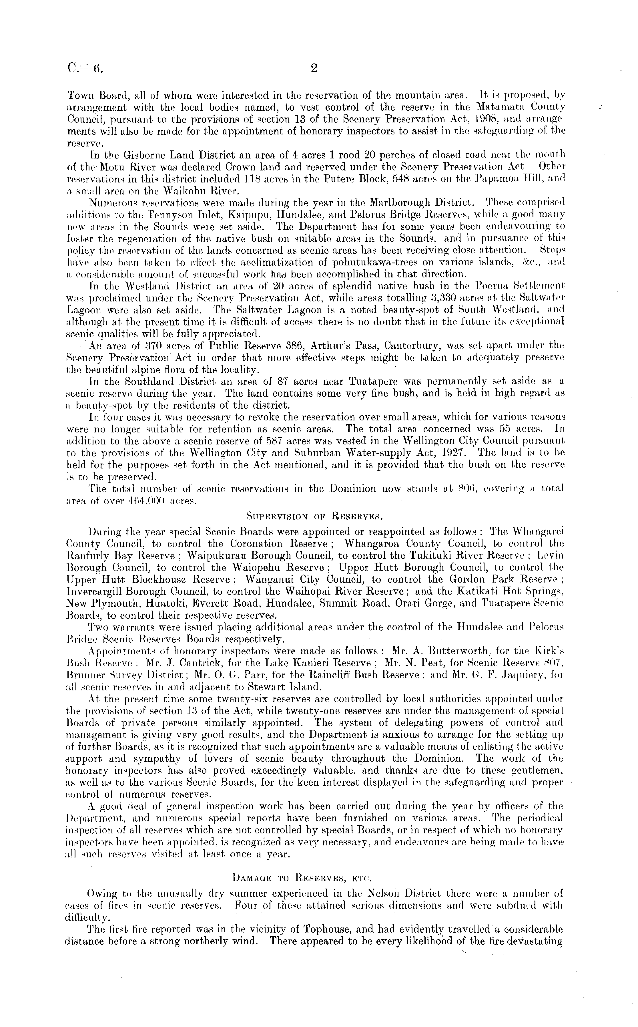 Town Board, all of whom were interested in the reservation of the mountain area. It is proposed, by arrangement with the local bodies named, to vest control of the reserve in the Matamata County Council, pursuant to the provisions of section 13 of the Scenery Preservation Act. 1908. and arrangements will also be made for the appointment of honorary inspectors to assist in the safeguarding of the reserve. In the Gisbornc Land District an area of 4 acres 1 rood 20 perches of closed road near the mouth of the Motu River was declared Crown land and reserved under the Scenery Preservation Act. Other reservations in this district included 118 acres in the Putere Block, 548 acres on the Papamoa Hill, and a small area on the Waikohu River. Numerous reservations were made during the year in the Marlborough District. These comprised additions to the Tennyson Inlet, Kaipupu, Hundalee, and Pelorus Bridge Reserves, while a good many new areas in the Sounds were set aside. The Department has for some years been endeavouring to foster the regeneration of the native bush on suitable areas in the Sounds, and in pursuance of this policy the reservation of the lands concerned as scenic areas has been receiving close attention. Steps have also been taken to effect the acclimatization of pohutukawa-trees on various islands, fcs., and a considerable amount of successful work has been accomplished in that direction. In the Westland District an area of 20 acres of splendid native bush in the Poerua Settlement was proclaimed under the Scenery Preservation Act, while areas totalling 3,330 acres at the Saltwater Lagoon were also set aside. The Saltwater Lagoon is a noted beauty-spot of South Westland, and although at the present time it is difficult of access there is no doubt that in the future its exceptional scenic qualities will be fully appreciated. An area of 370 acres of Public Reserve 386, Arthur's Pass, Canterbury, was set apart under the Scenery Preservation Act in order that more effective steps might be taken to adequately preserve the beautiful alpine flora of the locality. In the Southland District an area of 87 acres near Tuatapere was permanently set aside as a scenic reserve during the year. The land contains some very fine bush, and is held in high regard as a beauty-spot by the residents of the district. In four cases it was necessary to revoke the reservation over small areas, which for various reasons were no longer suitable for retention as scenic areas. The total area concerned was 55 acres. In addition to the above a scenic reserve of 587 acres was vested in the Wellington City Council pursuant to the provisions of the Wellington City and Suburban Water-supply Act, 1927. The land is to be held for the purposes set forth in the Act mentioned, and it is provided that the bush on the reserve is to be preserved. The total number of scenic reservations in the Dominion now stands at 806, covering a total area, of over 464,000 acres. Supervision of Reserves. During the year special Scenic Boards were appointed or reappointed as follows : The Whangarei County Council, to control the Coronation Reserve ; Whangaroa County Council, to control the Ranfurly Bay Reserve ; Waipukurau Borough Council, to control the Tukituki River Reserve ; Levin Borough Council, to control the Waiopehu Reserve ; Upper Hutt Borough Council, to control the Upper Hutt Blockhouse Reserve ; Wanganui City Council, to control the Gordon Park Reserve ; Invercargill Borough Council, to control the Waihopai River Reserve; and the Katikati Hot Springs, New Plymouth, Huatoki, Everett Road, Hundalee, Summit Road, Orari Gorge, and Tuatapere Scenic Boards, to control their respective reserves. Two warrants were issued placing additional areas under the control of the Hundalee and Pelorus Bridge Scenic Reserves Boards respectively. Appointments of honorary inspectors were made as follows : Mr. A. Butterworth, for the Kirk's Bush Reserve ; Mr. J. Cantrick, for the Lake Kanieri Reserve ; Mr. N. Peat, for Scenic Reserve 807, Brunner Survey District; Mi. 0. G. Parr, for the Rainclin' Bush Reserve; and Mr. U. F. Jaquiery, lor all scenic reserves in and adjacent to Stewart Island. At the present time some twenty-six reserves are controlled by local authorities appointed under the provisions of section 13 of the Act, while twenty-one reserves are under the management of special Boards of private persons similarly appointed. The system of delegating powers of control and management is giving very good results, and the Department is anxious to arrange for the setting-up of further Boards, as it is recognized that such appointments are a valuable means of enlisting the active support and sympathy of lovers of scenic beauty throughout the Dominion. The work of the honorary inspectors has also proved exceedingly valuable, and thanks are due to these gentlemen, as well as to the various Scenic Boards, for the keen interest displayed in the safeguarding and proper control of numerous reserves. A good deal of general inspection work has been carried out during the year by officers of the Department, and numerous special reports have been furnished on various areas. The periodical inspection of all reserves which are not controlled by special Boards, or in respect of which no honorary inspectors have been appointed, is recognized as very necessary, and endeavours are being made to have all such reserves visited at least once a year. Damage to Reserves, etc. Owing to the unusually dry summer experienced in the Nelson District there were a, number of cases of tires in scenic reserves. Four of these attained serious dimensions and were subdued with difficulty. The first fire reported was in the vicinity of Tophouse, and had evidently travelled a considerable distance before a strong northerly wind. There appeared to be every likelihood of the fire devastating