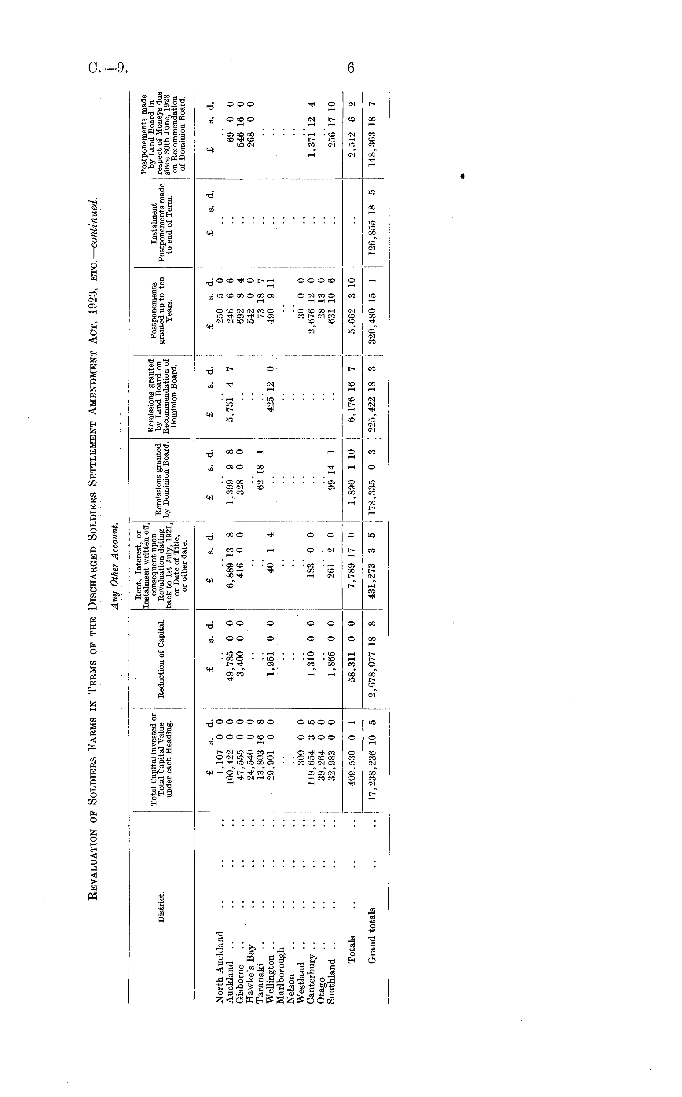 Any Other Account. District. Total Capital invested or Total Capital Value under each Heading. Reduction of Capital. Rent, Interest, or Instalment written off, consequent upon . . . . Revaluation dating Remissions granted back to lst July, 1921, b > r Dominion Board, or Date of Title, or other date. Remissions granted Postponements Instalment by Land Board on granted up to ten Postponements made Recommendation of t0 F end of T Dominion Board. Postponements made by Land Board in respect of Moneys due since 30th June, 1923 on Recommendation of Dominion Hoard. North Auckland Auckland Gisborne Hawke's Bay Taranaki Wellington Marlborough Nelson Westland Canterbury Otago Southland .. £ s. d. 1,107 0 0 100,422 0 0 47,555 0 0 24,540 0 0 13,803 16 8 29,901 0 0 £ s. d. 49,785 0 0 3,400 0 0 1,951 0 0 1,310 0 0 1,865 0 0 £ s. d. 6,889 13 8 416 0 0 40 1 4 1S3 0 0 261 2 0 £ s. d. 1,399 9 8 328 0 0 62 18 1 99 14 1 £ s. d. 5,751 4 7 425 12 0 £ s. d. 250 5 0 246 6 6 692 8 4 542 0 0 73 18 7 490 9 11 30 0 0 2,676 12 0 28 13 0 631 10 6 £ s. d. £ s. d. 69 0 0 546 16 0 268 0 0 300 0 0 119,654 3 5 39.264 0 0 32,983 0 0 1,371 12 4 256 17 10 - Totals 409,530 0 1 58,311 0 0 7,789 17 0 1,890 1 10 6,176 16 7 5,662 3 10 2,512 6 2 Grand totals 17,238,236 10 5 2,678,077 18 8 431,273 3 5 178,335 0 3 225,422 18 3 320,480 15 1 126,855 18 5 148,363 18 7 i