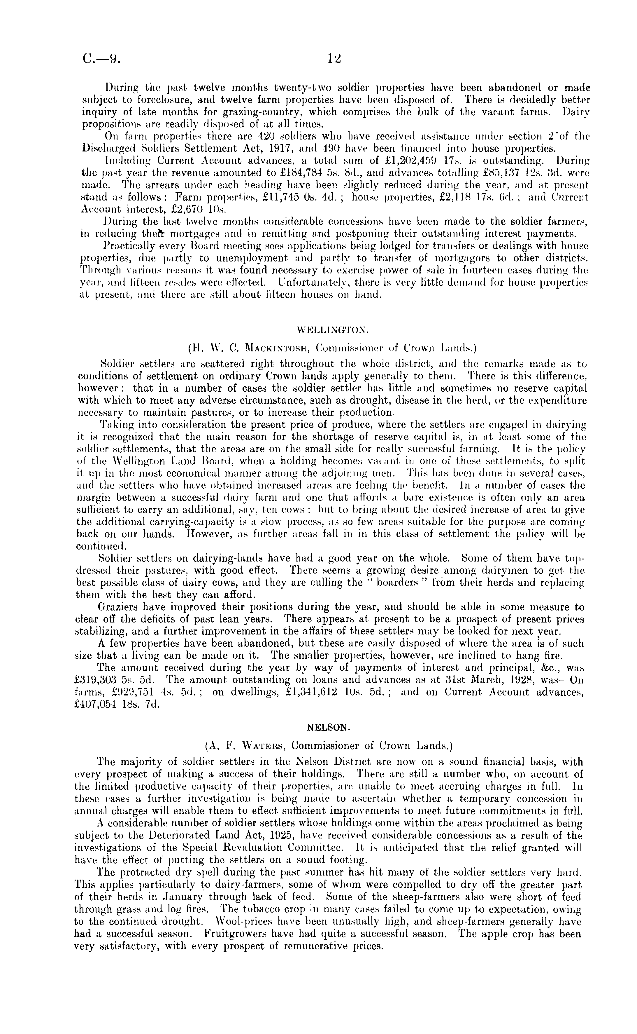 WELLINGTON. (H. W. C. Mackintosh, Commissioner of Crown Lands.) Soldier settlers are scattered riglit throughout the whole district, and the remarks made as to conditions of settlement on ordinary Crown lands apply generally to them. There is this difference, however : that in a number of cases the soldier settler has little and sometimes no reserve capital with which to meet any adverse circumstance, such as drought, disease in the herd, or the expenditure necessary to maintain pastures, or to increase their production. Taking into consideration the present price of produce, where the settlers are engaged in dairying it is recognized that the main reason for the shortage of reserve capital is, in at least some of the soldier settlements, that the areas are on the small side for really successful farming. It is the policy of the Wellington Land Board, when a holding becomes vacant in one of these settlements, to split it up in the most economical manner among the adjoining men. This has been done in several cases, and the settlers who have obtained increased areas are feeling the benefit. In a number of cases the margin between a successful dairy farm and one that affords a bare existence is often only an area sufficient to carry an additional, say, ten cows ; but to bring about the desired increase of area to give the additional carrying-capacity is a slow process, as so few areas suitable for the purpose are coining back on our hands. However, as further areas fall in in this class of settlement the policy will be continued. Soldier settlers on dairying-lands have had a good year on the whole. Some of them have topdressed their pastures, with good effect. There seems a growing desire among dairymen to get the best possible class of dairy cows, and they are culling the " boarders " from their herds and replacing them with the best they can afford. Graziers have improved their positions during the year, and should be able in some measure to clear off the deficits of past lean years. There appears at present to be a prospect of present prices stabilizing, and a further improvement in the affairs of these settlers may be looked for next year. A few properties have been abandoned, but these are easily disposed of where the area is of such size that a living can be made on it. The smaller properties, however, are inclined to hang fire. The amount received during the year by way of payments of interest and principal, &c., was £319,303 ss. sd. The amount outstanding on loans and advances as at 31st March, 1.928, was—On farms, £929,751 4s. sd. ; on dwellings, £1,341,612 10s. sd. ; and on Current Account advances, £407,054 18s. 7d. NELSON. (A. F. Waters, Commissioner of Crown Lands.) The majority of soldier settlers in the Nelson District are now on a sound financial basis, with every prospect of making a success of their holdings. There are still a number who, on account of the iimited productive capacity of their properties, are unable to meet accruing charges in full. In these cases a further investigation is being made to ascertain whether a temporary concession in annual charges will enable them to effect sufficient improvements to meet future commitments in full. A considerable number of soldier settlers whose holdings come within the areas proclaimed as being subject to the Deteriorated Land Act, 1925, have received considerable concessions as a result of the investigations of the Special Revaluation Committee. It is anticipated that the relief granted will have the effect of putting the settlers on a sound footing. The protracted dry spell during the past summer has hit many of the soldier settlers very hard. This applies particularly to dairy-farmers, some of whom were compelled to dry off the greater part of their herds in January through lack of feed. Some of the sheep-farmers also were short of feed through grass and log fires. The tobacco crop in many cases failed to come up to expectation, owing to the continued drought. Wool-prices have been unusually high, and sheep-farmers generally have had a successful season. Fruitgrowers have had quite a successful season. The apple crop has been very satisfactory, with every prospect of remunerative prices.