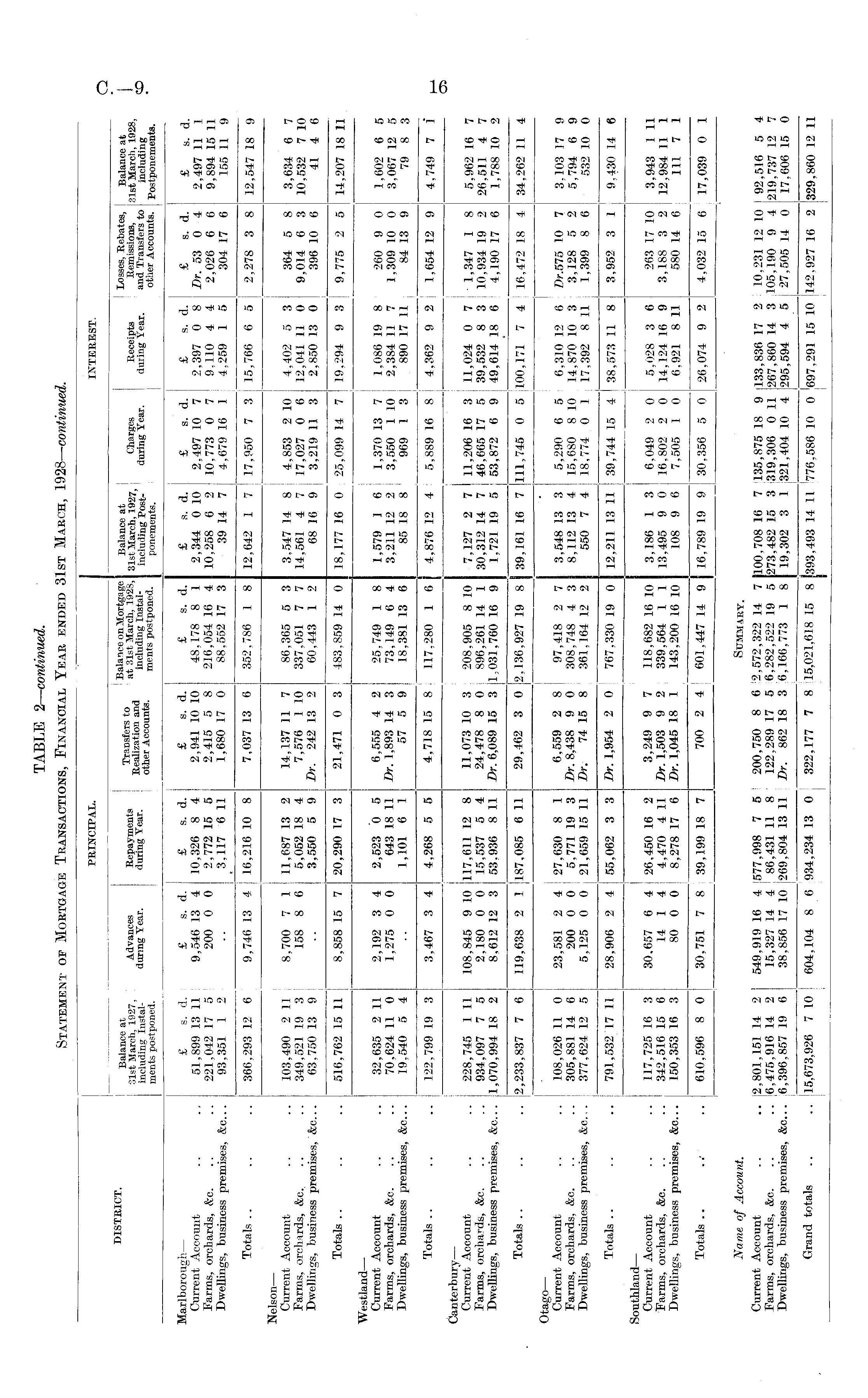 PRINCIPAL. INTEREST. DISTRICT. Balance at 31st March, 1927, including Instalments postponed. Advances during Year. Repayments daring Year. Transfers to Realization and other Accounts. Balance on Mortgage at 31st March, 1928, including Instalments postponed. Balance at 31st March, 1927, including Postponements. Charges during Year. Receipts during Year. Losses, Rebates, Balance at Remissions, 81st March. 1928, and Transfers to including other Accounts. Postponements. Marlborough — £ s. d. Current Account .. ., 51,899 13 11 Farms, orchards, &c. .. .. 221,042 17 5 Dwellings, business premises, &c... 93,351 1 2 £ s. d. £ s. d. 9,546 13 4 10,326 8 4 200 0 0 2,772 15 5 3.117 6 11 £ s. d. 2.941 10 10 2,415 5 8 1,680 17 0 £ s. d. 48,178 8 1 216,054 16 4 88,552 17 3 £ s. d. I £ s. d. 2,344 0 10 I 2.497 10 7 10,258 6 2 • 10.773 0 7 39 14 7 j 4.679 16 1 £ s. d. 2,397 0 8 9,110 4 4 4,259 1 5 £ s. d. Dr. 53 0 4 2,028 6 6 304 17 6 £ s. d. 2,497 11 1 9,894 15 11 155 11 9 Totals .. .. .. 366,293 12 6 366,293 12 6 9,746 13 4 16,216 10 8 9,746 13 4 | 16,216 10 8 7,037 13 6 352,786 1 8 12,642 1 7 : 17,950 7 3 15,766 6 5 2,278 3 8 12,547 18 9 Nelson — Current Account .. .. 103,490 2 11 Farms, orchards, &c. .. .. 349,521 19 3 Dwellings, business premises, &c . 63,750 13 9 103,490 2 11 349,521 19 3 63,750 13 9 8,700 7 1 158 8 6 8,700 7 1 11,687 13 2 158 8 6 5,052 18 4 : 3.550 5 9 11.887 13 2 5,052 18 4 3.550 5 9 14,137 11 7 7,576 1 10 Dr. 242 13 2 86,365 5 3 337,051 7 7 60,443 1 2 3.547 14 8 4.853 2 10 14.561 4 7 17,027 0 6 68 16 9 3,219 11 3 4,402 5 3 12,041 11 0 2,850 13 0 364 5 9,014 6 396 10 8 3 6 3,634 6 7 10,532 7 10 41 4 6 Totals .. .. .. 516,762 15 11 516,762 15 11 8,858 15 7 20,290 17 3 8,858 15 7 20,290 17 3 21,471 0 3 483,859 14 0 18,177 16 0 25,099 14 7 19,294 9 3 9,775 2 5 14,207 18 11 Westland — Current Account .. .. 32,635 2 11 Farms, orchards, &c. .. .. 70,624 11 0 Dwellings, business premises, &c... 19,540 5 4 32,635 2 11 70,624 11 0 19.540 5 4 2,192 3 4 2,523 0 5 1,275 0 0 643 18 11 1,101 6 1 2,192 3 4 1,275 0 0 2,523 0 5 643 18 11 1,101 6 1 6,555 4 2 Dr. 1,893 14 3 57 5 9 25.749 1 8 73.149 6 4 18,381 13 6 1,579 1 6 1,370 13 7 i 1,086 19 8 3,211 12 2 3,550 1 10 ! 2,384 11 7 85 18 8 969 1 3 890 17 11 260 9 0 1,309 10 0 84 13 9 1,602 6 5 3,067 12 5 79 8 3 Totals .. .. .. 122,799 19 3 122,799 19 3 3,467 3 4 4,268 5 5 3,467 3 4 4,268 5 5 4,718 15 8 117,280 1 6 4,876 12 4 5,889 16 8 4,362 9 2 1,654 12 9 4,749 7 1 Canterbury — Current'Account .. .. 228,745 1 11 Farms, orchards, &c. .. .. 934,097 7 5 Dwellings, business premises, &c... 4,070,994 18 2 108,845 9 10 117,611 12 8 2,180 0 0 15,537 5 4 8,612 12 3 53.936 8 11 108,845 9 10 2,180 0 0 8,612 12 3 117,611 12 8 15,537 5 4 53.936 8 11 11,073 10 3 208.905 8 10 24,478 8 0 896.261 14 1 Dr. 6,089 15 3 1.031,760 16 9 7,127 2 7 30,312 14 7 1.721 19 5 11,206 16 3 11,024 0 7 1,347 1 8 46,665 17 5 39,532 8 3 10,934 19 2 53,872 6 9 49,614 18 6 4,190 17 6 5,962 16 7 26,511 4 7 1,788 10 2 Totals .. .. .. 2,233, 837 7 6 119,638 2 1 487,085 6 11 119,638 2 1 187,085 6 11 29,462 3 0 2,136,927 19 8 39,161 16 7 111,745 0 5 100,171 7 4 16,472 18 4 34,262 11 4 Otago — Current Account .. .. 108,026 11 0 Farms, orchards, &c. .. ... 305,881 14 6 Dwellings, business premises, &e.. . 377,624 12 5 23,581 2 4 27,630 8 1 200 0 0 5,771 19 3 5,125 0 0 21.659 15 11 23,581 2 4 27,630 8 1 200 0 0 5,771 19 3 5,125 0 0 21.659 15 11 6,559 2 8 i Dr. 8,438 9 0 Dr. 74 15 8 97,418 2 7 308,748 4 3 361,164 12 2 3,548 13 3 8,112 13 4 550 7 4 5,290 6 5 15,680 8 10 18,774 0 1 6,310 12 6 Dr.575 10 7 14,870 10 3 3,128 5 2 17,392 8 11 1,399 8 6 3.103 17 9 5,794 6 9 532 10 0 ' Totals .. .. .. 791,532 17 11 791,532 17 11 28,906 2 4 55,062 3 3 28,906 2 4 55,062 3 3 Dr. 1,954 2 0 767,330 19 0 12,211 13 11 39,744 15 4 38,573 11 8 3,952 3 1 9,430 14 6 Southland — Current Account .. .. I 117,725 16 3 Farms, orchards, &e. .. .. j 342,516 15 6 j Dwellings, business premises, &c... j 150,353 16 3 117,725 16 3 342,516 15 6 150,353 16 3 30,657 6 4 26,450 16 2 14 1 4 4,470 4 11 80 0 0 8.278 17 6 „ — . i 30,657 6 4 26,450 16 2 14 1 4 4,470 4 11 80 0 0 8.278 17 6 3,249 9 7 Dr. 1.503 9 2 Dr. 1,045 18 1 118,682 16 10 339,564 1 1 143,200 16 10 3,186 1 3 13,495 9 0 108 9 6 6,049 2 0 16.802 2 0 7.505 1 0 5.028 3 6 14,124 16 9 6,921 8 11 263 17 10 3,188 3 2 580 14 6 3,943 1 11 12,984 11 1 111 7 1 Totals .. ..- .. 610,596 8 0 610,596 8 0 30,751 7 8 39,199 18 7 30,751 7 8 39,199 18 7 700 2 4 601,447 14 9 16,789 19 9 30,356 5 0 26,074 9 2 4,032 15 6 17,039 0 1 Name of Account. 2,801,151 14 2 ! 6,475, 916 14 2 6,396,857 19 6 15,673,926 7 10 Stjmmaky. 549,919 ] 15,327 : 38,856 : 604,104 16 4 '577,998 7 5 14 4 ! 86,431 11 8 17 10 '269,804 13 11 . 8 6 934,234 13 0 200,750 122.289 : Dr. 862 : 322,177 bTJMMAKY. 8 6 2,572,322 14 17 5 6,282,522 19 18 3 6,166,773 1 7 8 15,021,618 15 7 100,708 16 7 135,875 18 9 133,836 17 2 10,231 12 10 92,516 5 4 5 273.482 15 3 319,306 0 11 267,860 14 3 105,190 9 4 219,737 12 7 8 19,302 3 1 ,321,404 10 4 295,594 4 5 27,505 14 0 17,606 15 0 8 393.493 14 11 '776.586 10 0 '697,291 15 10 142,927 16 2 329,860 12 11 Current Account .. .. 12,801,151 14 2 Farms, orchards, &c. .. .. '6,475,916 14 2 Dwellings, business premises, &c... |6,396, 857 19 6 12,801,151 14 2 ! 6,475, 916 14 2 6,396.857 19 6 549,919 16 4 '577,998 7 5 200,750 8 6 2,572,322 14 7 100,708 16 7 135,875 18 9 15,327 14 4 I 86,431 11 8 122.289 17 5 6,282.522 19 5 273.482 15 3 319,306 0 11 38,856 17 10 '269,804 13 11 Dr. 862 18 3 6,166,773 1 8 19.302 3 1 321.404 10 4 549,919 16 4 '577,998 7 5 15,327 14 4 ! 86,431 11 8 38,856 17 10 '269,804 13 11 Grand totals .. .. 15,673,926 7 10 604,104 8 6 934,234 13 0