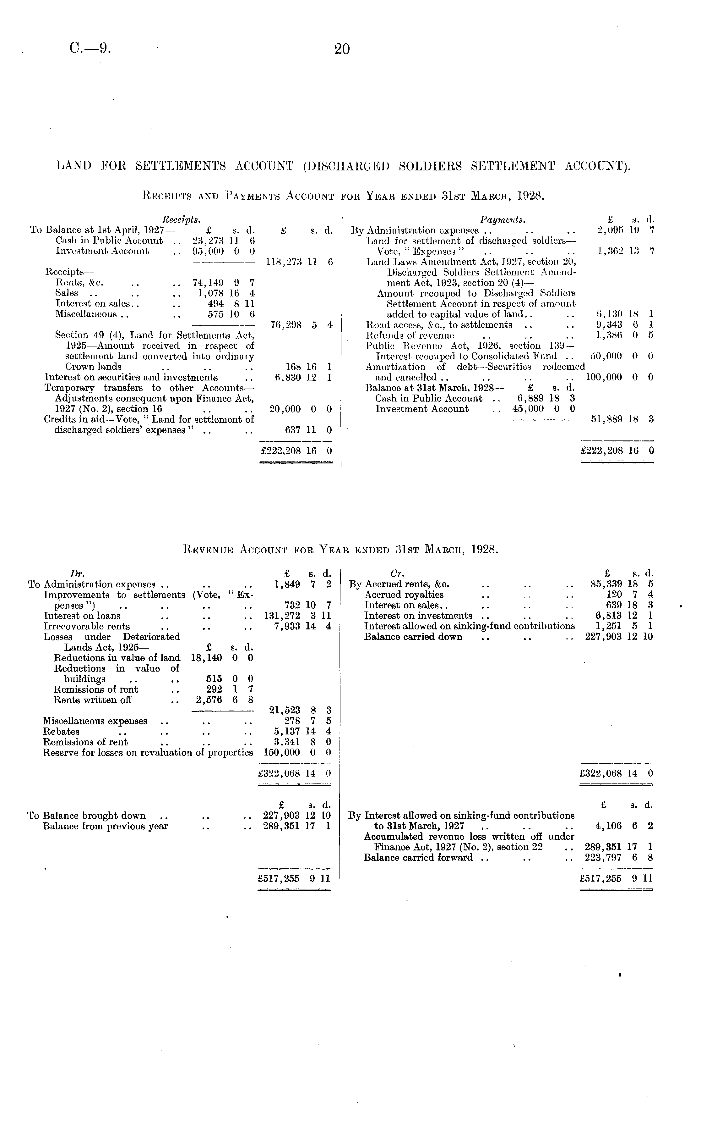 LAND FOR SETTLEMENTS ACCOUNT (DISCHARGED SOLDIERS SETTLEMENT ACCOUNT). Receipts and Payments Account for Year ended 31st March, 1928. Receipts. Payments. £ s. d. To Balance at Ist April, 1927— £ s. d. £ s. d. By Administration expenses .. .. .. 2,095 1!) 7 Cash in Public Account .. 23,273 II 6 Land for settlement of discharged soldiers — Investment Account .. 95,000 0 0 Vote, " Expenses" .. .. .. 1,362 13 7 118,273 11 6 hand Laws Amendment Act, 1927, section 20, Receipts— Discharged Soldiers Settlement AmendRents, &c. .. .. 74,149 9 7 ment Act, 1923, section 20 (4)— Sales .. .. .. 1,078 16 4 Amount recouped to Discharged Soldiers Interest on sales.. .. 494 8 11 Settlement Account in respect of amount Miscellaneous.. .. 575 10 6 added, to capital value of land.. .. 6,130 18 1 76,298 5 4 Road access, Sic., to settlements .. .. 9,343 6 1 Section 49 (4), Land for Settlements Act, Refunds of revenue . .. .. .. 1,386 0 5 1925 —Amount received in respect of Publio Revenue Act, 1926, section 139 — settlement land converted into ordinary Interest recouped to Consolidated Fund .. 50,000 0 0 Crown lands .. .. .. 168 16 1 Amortization of debt —Securities redeemed Interest on securities and investments .. 6,830 12 1 and cancelled .. .. .. .. 100,000 0 0 Temporary transfers to other Accounts— Balance at 31st March, 1928 — £ s. d. Adjustments consequent upon Finance Act, Cash in Public Account .. 6,889 18 3 1927 (No. 2), section 16 .. .. 20,000 0 0 Investment Account ~ 45,000 0 0 Credits in aid—Vote, "Land for settlement of 51,889 18 3 discharged soldiers'expenses " .. .. 637 II 0 £222,208 16 0 £222,208 16 0 Revenue Account for Year ended 31st March, 1928. Dr. £ s. d. Cr. £ s. d. To Administration expenses .. .. .. 1,849 7 2 By Accrued rents, &c. .. .. .. 85,339 18 5 Improvements to settlements (Vote, " Ex- Accrued royalties .. .. .. 120 7 4 penses") .. .. .. .. 732 10 7 Interest on sales.. .. .. .. 639 18 3 Interest on loans .. .. .. 131,272 3 11 Interest on investments .. .. .. 6,813 12 1 Irrecoverable rents .. .. .. 7,933 14 4 Interest allowed on sinking-fund contributions 1,251 5 1 Losses under Deteriorated Balance carried down .. .. .. 227,903 12 10 Lands Act, 1925— £ s. d. Reductions in value of land 18,140 0 0 Reductions in value of buildings .. .. 515 0 0 Remissions of rent .. 292 1 7 Rents written off .. 2,576 6 8 21,523 8 3 Miscellaneous expenses .. .. .. 278 7 5 Rebates .. .. .. .. 5,137 14 4 Remissions of rent .. .. .. 3,341 8 0 Reserve for losses on revaluation of properties 150,000 0 0 £322,068 14 0 £322,068 14 0 £ s. d. £ s. d. To Balance brought down .. .. .. 227,903 12 10 By Interest allowed on sinking-fund contributions Balance from previous year .. .. 289,35117 1 to 31st March, 1927 .. .. .. 4,106 6 2 Accumulated revenue loss written off under Finance Act, 1927 (No. 2), section 22 .. 289,35117 1 Balance carried forward .. .. .. 223,797 6 8 £517,255 9 11 £517,255 9 11 i