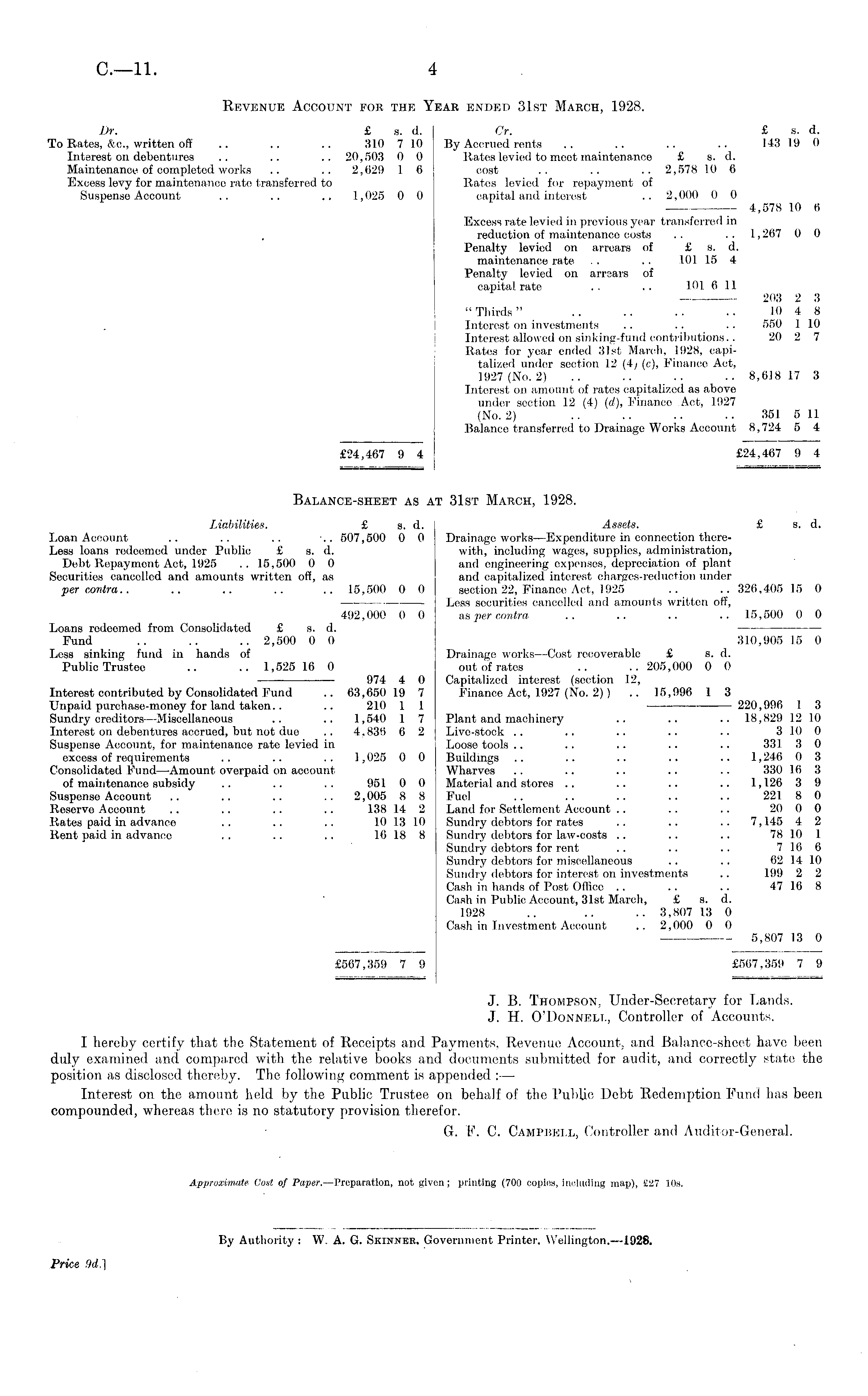 Revenue Account for the Year ended 3.1 st March, 1928. Dr. £ s. d. Cr. £ s. d. To Rates, &c, written off .. .. .. 310 710 By Accrued rents .. .. .. .. 143 19 0 Interest on debentures .. .. .. 20,503 0 0 Rates levied to moot maintenance £ s. d. Maintenance of completed works .. .. 2,629 1 6 cost .. .. .. 2,578 10 6 Excess levy for maintenance rate transferred to Rates levied for repayment of Suspense Account .. .. .. 1,025 0 0 capital and interest .. 2,000 0 0 4,578 10 6 Excess rate levied in previous year transferred in reduction of maintenance costs .. .. 1,267 0 0 Penalty levied on arrears of £ s. d. maintenance rate . . .. 101 15 4 Penalty lovied on arrears of capital rate .. .. 101 6 11 203 2 3 "Thirds" .. .. .. .. 10 4 8 Interest on investments .. .. .. 550 1 10 Interest allowed on sinking-fund contributions. . 20 2 7 Rates for year ended 31st March, 1928, capitalized under section 12 (4; (c), Finance Act, 1927 (No. 2) .. .. .. .. 8,618 17 3 Interest on amount of rates capitalized as above under section 12 (4) (d), Finance .Act, 1927 (No. 2) .. .. .. .. 351 5 11 Balance transferred to Drainage Works Account 8,724 5 4 £24,467 9 4 £24,467 9 4 Balance-sheet as at 31st March, 1928. Liabilities. £ s. A. Assets. £ s. d. Loan Account .. .. .. .. 507,500 0 0 Drainage works —Expenditure in connection thereLess loans redeemed under Public £ s. d. with, including wages, supplies, administration, Debt Repayment Act, 1925 .. 15,500 0 0 and engineering expenses, depreciation of plant Securities cancelled and amounts written off, as and capitalized interest charges-reduction under per contra.. .. .. .. .. 15,500 0 0 section 22, Finance Act, 1925 .. ..326,405 15 0 Less securities cancelled and amounts written off, 492,000 0 0 an per contra. .. .. .. .. 15,500 0 0 Loans rodeomed from Consolidated £ s. d. Fund .. .. .. 2,500 0 0 310,905 15 0 Less sinking fund in hands of Drainage works—Cost recoverable £ s. d. Public Trustee .. .. 1,525 16 0 out of rates .. ..205,000 0 0 974 4 0 Capitalized interest (section 12, Interest contributed by Consolidated Fund .. 63,650 19 7 Finance Act, 1927 (No. 2)) .. 15,996 I 3 Unpaid purchase-money for land taken. . .. 210 1 1 220,996 I 3 Sundry creditors —Miscellaneous .. .. 1,540 1 7 Plant and machinery .. .. .. 18,829 12 10 Interest on debentures accrued, but not due .. 4.836 6 2 Live-stock .. .. .. .. .. 3 10 0 Suspense Account, for maintenance rate levied in Loose tools .. .. .. .. .. 331 3 0 excess of requirements .. .. .. 1,025 0 0 Buildings .. .. .. .. .. 1,246 0 3 Consolidated Fund —Amount overpaid on account Wharves .. .. .. .. .. 330 16 3 of maintenance subsidy .. .. .. 951 0 0 Material and stores .. .. .. .. 1,126 3 9 Suspense Account .. .. .. .. 2,005 8 8 Fuel .. .. .. .. .. 221 8 0 Reserve Account .. .. .. .. 138 14 2 Land for Settlement Account .. . . .. 20 0 0 Rates paid in advance .. .. .. 10 13 10 Sundry debtors for rates .. .. .. 7,145 4 2 Rent paid in advanco .. .. .. 16 18 8 Sundry debtors for law-costs .. .. .. 78 10 1 Sundry debtors for rent .. .. .. 716 6 Sundry debtors for miscellaneous . . . . 62 14 10 Sundry debtors for interest on investments .. 199 2 2 Cash in hands of Post Office .. . . .. 47 16 8 Cash in Public Account, 31st March, £ s. d. 1928 .. .. .. 3,807 13 0 Cash in Investment Account . . 2,000 0 0 5,807 13 0 £567,359 7 9 £567,359 7 9 J. B. Thompson, Under-Secretary for Lands. J. H. O'Donnell, Controller of Accounts. I hereby certify that the Statement of Receipts and Payments, Revenue Account, and Balance-sheet have been duly examined and compared with the relative books and documents submitted for audit, and correctly state the position as disclosed thereby. The following comment is appended : — Interest on the amount held by the Public Trustee on behalf of the Public Debt Redemption Fund has been compounded, whereas there is no statutory provision therefor. G. F. C. Campbell, Controller and Auditor-General.