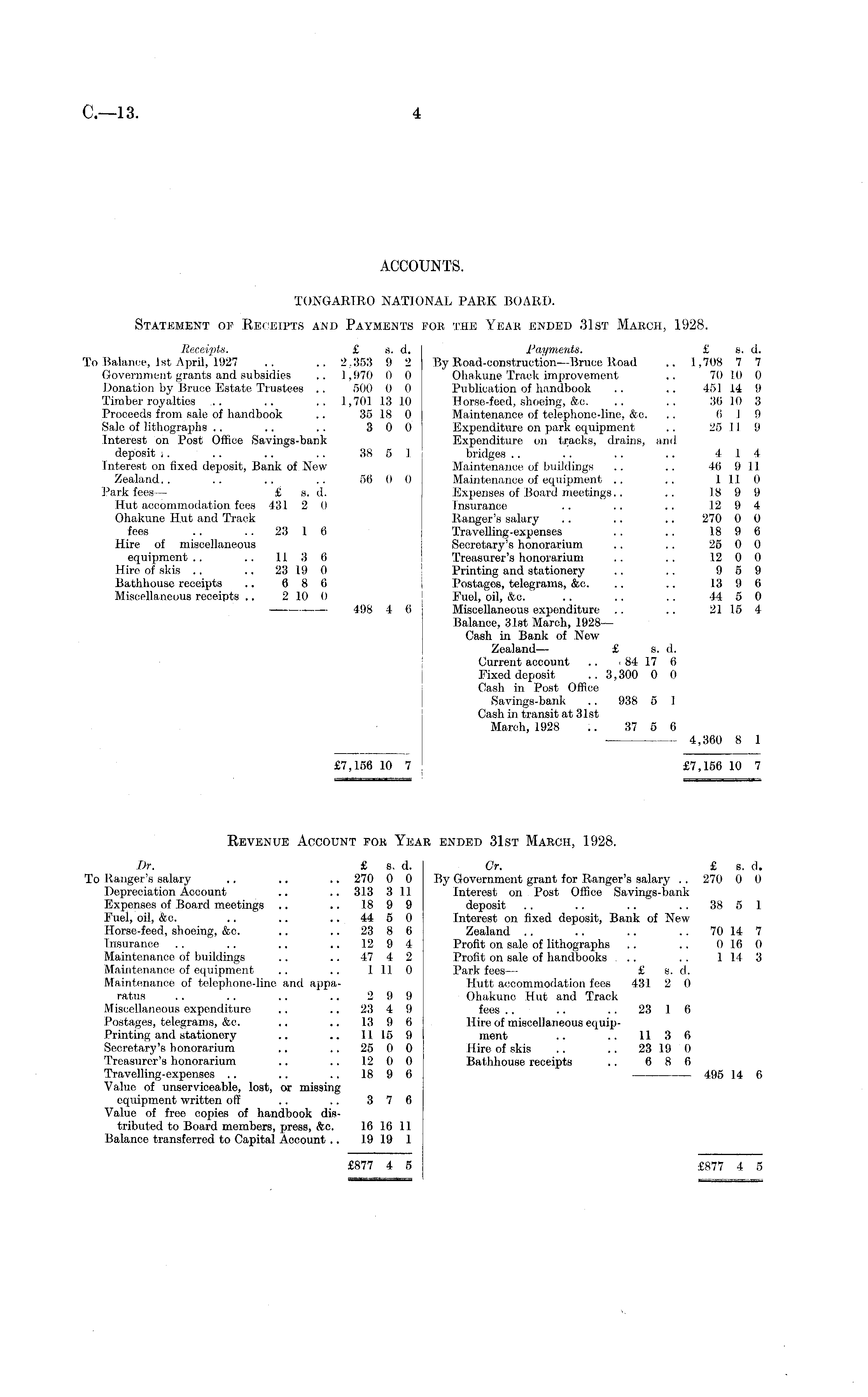 ACCOUNTS. TONGARIRO NATIONAL PARK BOARD. Statement op Receipts and Payments for the Year ended 31st March, 1928. Receipts. £ s. d. Payments. £ s. d. To Balance, Ist April, 1927 .. .. 2,863 9 2 By Road-construction—Bruce Road .. 1,708 7 7 Government grants and subsidies .. 1,970 0 0 Ohakune Track improvement .. 70 10 0 Donation by Bruce Estate Trustees .. 500 i) 0 Publication of handbook .. .. 451 14 9 Timber royalties .. .. .. 1,701 13 10 Horse-feed, shoeing, &o. .. .. 30 10 3 Proceeds from sale of handbook .. 35 18 0 Maintenance of telephone-line, __o. .. 6 19 Sale of lithographs .. .. .. 3 0 0 Expenditure on park equipment .. 25 II 9 Interest on Post Office Savings-bank Expenditure on tracks, drains, and deposit .. .. .. .. 38 5 1 bridges .. .. .. .. 4 14 Interest on fixed deposit, Bank of New Maintenance of buildings .. .. 40 9 11. Zealand.. .. .. .. 56 0 0 Maintenance of equipment .. .. 1 11 0 Park fees — £ s. d. Expenses of Board meetings.. .. 18 9 9 Hut accommodation fees 431 2 0 Insurance .. .. .. 12 9 4 Ohakune Hut and Track Ranger's salary .. .. .. 270 0 0 fees .. .. 23 1 0 Travelling-expenses . . .. 18 9 6 Hire of miscellaneous Secretary's honorarium .. .. 25 0 0 equipment.. .. 11 3 6' Treasurer's honorarium .. .. 12 0 0 Hire of skis .. .. 23 19 0 Printing and stationery .. .. 9 5 9 Bathhouse receipts .. 6 8 0 Postages, telegrams, __c. .. .. 13 9 6 Miscellaneous receipts .. 2 10 0 Puol, oil, &c. .. .. .. 44 5 0 498 4 6 | Miscellaneous expenditure .. .. 21 15 4 Balance, 3.lst March, 1928— Cash in Bank of New Zealand — £ s. d. Current account .. ■ 84 17 6 Fixed deposit .. 3,300 0 0 Cash in Post Office Savings-bank .. 938 6 1 Cash in transit at 3.lst March, 1928 .. 37 5 6 4,360 8 1 £7,156 10 7 £7,156 10 7 Revenue Account for Year ended 31st March, 1928. Dr. £ s. d. Cr. £ s. d. To Ranger's salary .. .. .. 270 0 0 By Government grant for Ranger's salary .. 270 0 0 Depreciation Account .. .. 313 3 11 Interest on Post Office Savings-bank Expenses of Board meetings .. .. 18 9 9 deposit .. .. .. 38 5 1 Fuel, oil, __c. .. .. .. 44 5 0 Interest on fixed deposit, Bank of New Horse-feed, shoeing, &o. .. .. 23 8 6 Zealand .. .. .. 70 14 7 Insurance .. .. .. 12 9 4 Profit on sale of lithographs .. .. 016 0 Maintenance of buildings .. .. 47 4 2 Profit on sale of handbooks .. .. 114 3 Maintenance of equipment .. .. 111 0 Park fees — £ s. d. Maintenance of telephone-line and appa- Hutt accommodation fees 431 2 0 ratus . . .. .. .. 2 9 9 Ohakune Hut and Track Miscellaneous expenditure .. .. 23 4 9 fees .. .. .. 23 1 6 Postages, telegrams, &c. .. .. 13 9 6 Hire of miscellaneous equipPrinting and stationery .. .. 11 15 9 ment .. .. 11 3 6 Secretary's honorarium .. .. 25 0 0 Hire of skis .. .. 23 19 0 Treasurer's honorarium .. .. 12 0 0 Bathhouse receipts .. 6 8 6 Travelling-expenses .. .. .. 18 9 6 495 14 6 Value of unserviceable, lost, or missing equipment written off .. .. 3 7 6 Value of free copies of handbook distributed to Board members, press, &c. 16 16 11 Balance transferred to Capital Account .. 19 19 1 £877 4 5 £877 4 5