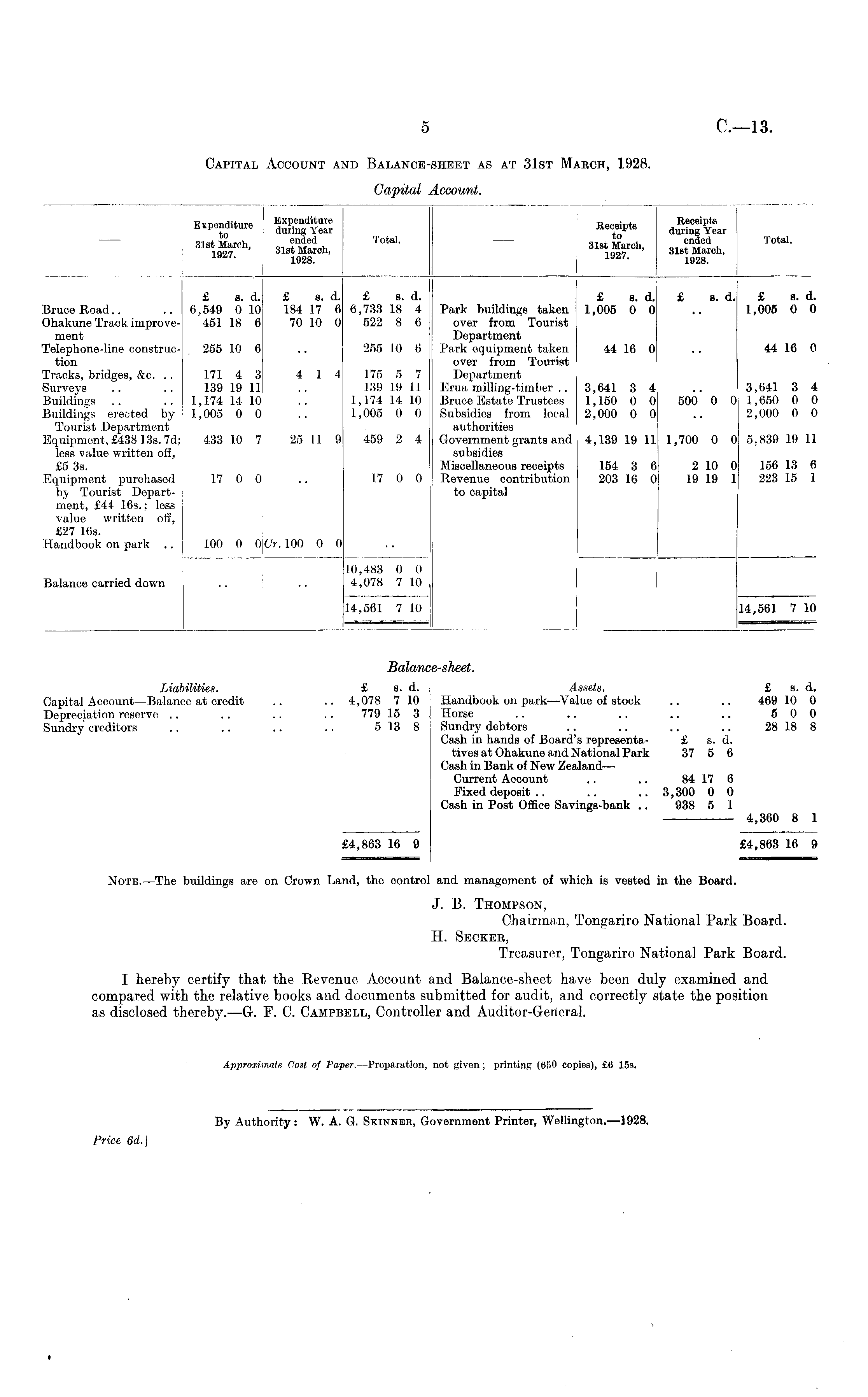 Balance-sheet. liabilities. £ s. d. Assets. £ s. d. Capital Account—Balance at credit .. .. 4,078 710 Handbook on park—Value of stock .. .. 469 10 0 Depreciation reserve .. .. .. . . 779 15 3 Horse .. .. .. .. .. 500 Sundry creditors .. .. .. .. 513 8 Sundry debtors .. .. .. .. 28 18 8 Cash in hands of Board's representa- £ s. d. tives at Ohakune and National Park 37 5 6 Cash in Bank of New Zealand— Current Account .. .. 84 17 6 Fixed deposit .. .. .. 3,300 0 0 Cash in Post Office Savings-bank .. 938 5 1 4,360 8 1 £4,863 16 9 £4,863 16 9 Note.—The, buildings are on Crown Land, the control and management of which is vested in the Board. J. B. Thompson, Chairman, Tongariro National Park Board. H. Seeker, Treasurer, Tongariro National Park Board. I hereby certify that the Revenue Account and Balance-sheet have been duly examined and compared with the relative books and documents submitted for audit, and correctly state the position as disclosed thereby.—Gr. F. C. Campbell, Controller and Auditor-General.