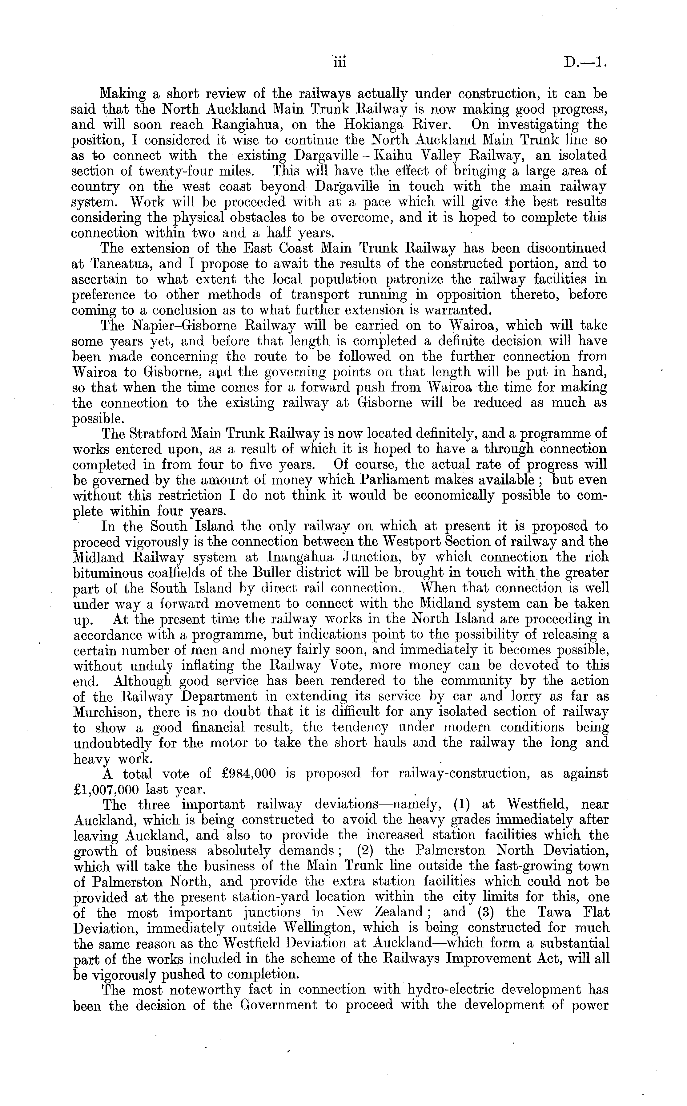 Making a short review of the railways actually under construction, it can be said that the North Auckland Main Trunk Railway is now making good progress, and will soon reach Rangiahua, on the Hokianga River. On investigating the position, I considered it wise to continue the North Auckland Main Trunk line so as to connect with the existing Dargaville - Kaihu Valley Railway, an isolated section of twenty-four miles. This will have the effect of bringing a large area of country on the west coast beyond Dargaville in touch with the main railway system. Work will be proceeded with at a pace which will give the best results considering the physical obstacles to be overcome, and it is hoped to complete this connection within two and a half years. The extension of the East Coast Main Trunk Railway has been discontinued at Taneatua, and I propose to await the results of the constructed portion, and to ascertain to what extent the local population patronize the railway facilities in preference to other methods of transport running in opposition thereto, before coming to a conclusion as to what further extension is warranted. The Napier-Gisborne Railway will be carried on to Wairoa, which will take some years yet, and before that length is completed a definite decision will have been made concerning the route to be followed on the further connection from Wairoa to Gisborne, and the governing points on that length will be put in hand, so that when the time comes for a forward push from Wairoa the time for making the connection to the existing railway at Gisborne will be reduced as much as possible. The Stratford Main Trunk Railway is now located definitely, and a programme of works entered upon, as a result of which it is hoped to have a through connection completed in from four to five years. Of course, the actual rate of progress will be governed by the amount of money which Parliament makes available ; but even without this restriction I do not think it would be economically possible to complete within four years. In the South Island the only railway on which at present it is proposed to proceed vigorously is the connection between the Westport Section of railway and the Midland Railway system at Inangahua Junction, by which connection the rich bituminous coalfields of the Buller district will be brought in touch with the greater part of the South Island by direct rail connection. When that connection is well under way a forward movement to connect with the Midland system can be taken up. At the present time the railway works in the North Island are proceeding in accordance with a programme, but indications point to the possibility of releasing a certain number of men and money fairly soon, and immediately it becomes possible, without unduly inflating the Railway Vote, more money can be devoted to this end. Although good service has been rendered to the community by the action of the Railway Department in extending its service by car and lorry as far as Murchison, there is no doubt that it is difficult for any isolated section of railway to show a good financial result, the tendency under modern conditions being undoubtedly for the motor to take the short hauls and the railway the long and heavy work. A total vote of £984,000 is proposed for railway-construction, as against £1,007,000 last year. The three important railway deviations —namely, (1) at Westfield, near Auckland, which is being constructed to avoid the heavy grades immediately after leaving Auckland, and also to provide the increased station facilities which the growth, of business absolutely demands ; (2) the Palmerston North Deviation, which will take the business of the Main Trunk line outside the fast-growing town of Palmerston North, and provide the extra station facilities which could not be provided at the present station-yard location within the city limits for this, one of the most important junctions in New Zealand; and (3) the Tawa Flat Deviation, immediately outside Wellington, which is being constructed for much the same reason as the Westfield Deviation at Auckland —which form a substantial part of the works included in the scheme of the Railways Improvement Act, will all De vigorously pushed to completion. The most noteworthy fact in connection with hydro-electric development has been the decision of the Government to proceed with the development of power