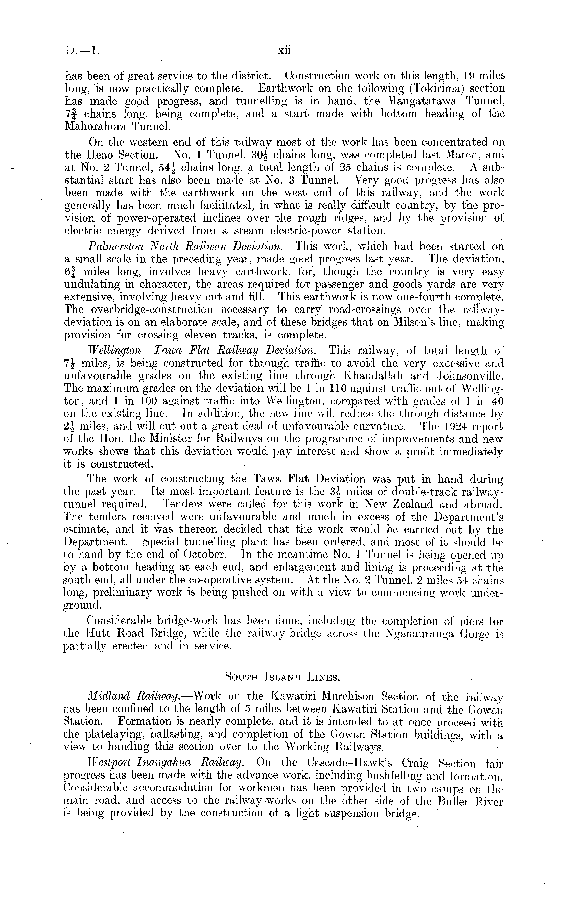 has been of great service to the district. Construction work on this length, 19 miles long, "is now practically complete. Earthwork on the following (Tokirima) section has made good progress, and tunnelling is in hand, the Mangatatawa Tunnel, 7f chains long, being complete, and a start made with bottom heading of the Mahorahora Tunnel. On the western end of this railway most of the work has been concentrated on the Heao Section. No. 1 Tunnel, 30| chains long, was completed last March, and at No. 2 Tunnel, 54| chains long, a total length of 25 chains is complete. A substantial start has also been made at No. 3 Tunnel. Very good progress has also been made with the earthwork on the west end of this railway, and the work generally has been, much facilitated, in what is really difficult country, by the provision of power-operated inclines over the rough ridges, and by the provision of electric energy derived from a steam electric-power station. Palmerston North Railway Deviation. —This work, which had been started on a small scale in the preceding year, made good progress last year. The deviation, 6f miles long, involves heavy earthwork, for, though the country is very easy undulating in character, the areas required for passenger and goods yards are very extensive, involving heavy cut and fill. This earthwork is now one-fourth complete. The overbridge-construction necessary to carry road-crossings over the railwaydeviation is on an elaborate scale, and of these bridges that on Milson's line, making provision for crossing eleven tracks, is complete. Wellington - Tawa Flat Railway Deviation. —This railway, of total length of 1\ miles, is being constructed for through traffic to avoid the very excessive and unfavourable grades on the existing line through Khandallah and Johnsonville. The maximum grades on the deviation will be 1 in 110 against traffic out of Wellington, and 1 in 100 against traffic into Wellington, compared with grades of 1 in 40 on the existing line. In addition, the new line will reduce the through distance by 2\ miles, and will cut out a great deal of unfavourable curvature. The 1924 report of the Hon. the Minister for Railways on the programme of improvements and new works shows that this deviation would pay interest and show a profit immediately it is constructed. The work of constructing the Tawa Flat Deviation was put in hand during the past year. Its most important feature is the 3__, miles of double-track railwaytunnel required, 'renders were called for this work in New Zealand and abroad. The tenders received were unfavourable and much in excess of the Department's estimate, and it was thereon decided that the work would be carried out by the Department. Special tunnelling plant has been ordered, and most of it should be to liand by the end of October. In the meantime No. 1 Tunnel is being opened up by a bottom heading at each end, and enlargement and lining.is proceeding at the south end, all under the co-operative system. At the No. 2 Tunnel, 2 miles 54 chains long, preliminary work is being pushed on with a view to commencing work underground. Considerable bridge-work has been done, including the completion of piers for the Hutt Road Bridge, while the railway-bridge across the Ngahauranga Gorge is partially erected and in .service. South Island Lines. Midland Railway. —Work on the Kawatiri-Murcliison Section of the railway has been confined to the length of 5 miles between Kawatiri Station and the Gowan Station. Formation is nearly complete, and it is intended to at once proceed with the piatelaying, ballasting, and completion of the Gowan Station buildings, with a view to handing this section, over to the Working Railways. Westport-Inangahua Railway. —On the Cascade-Hawk's Craig Section fair progress has been made with the advance work, including bushfelling and formation. Considerable accommodation for workmen has been provided in two camps on the main road, and access to the railway-works on the other side of the Buller River is being provided by the construction of a light suspension bridge.