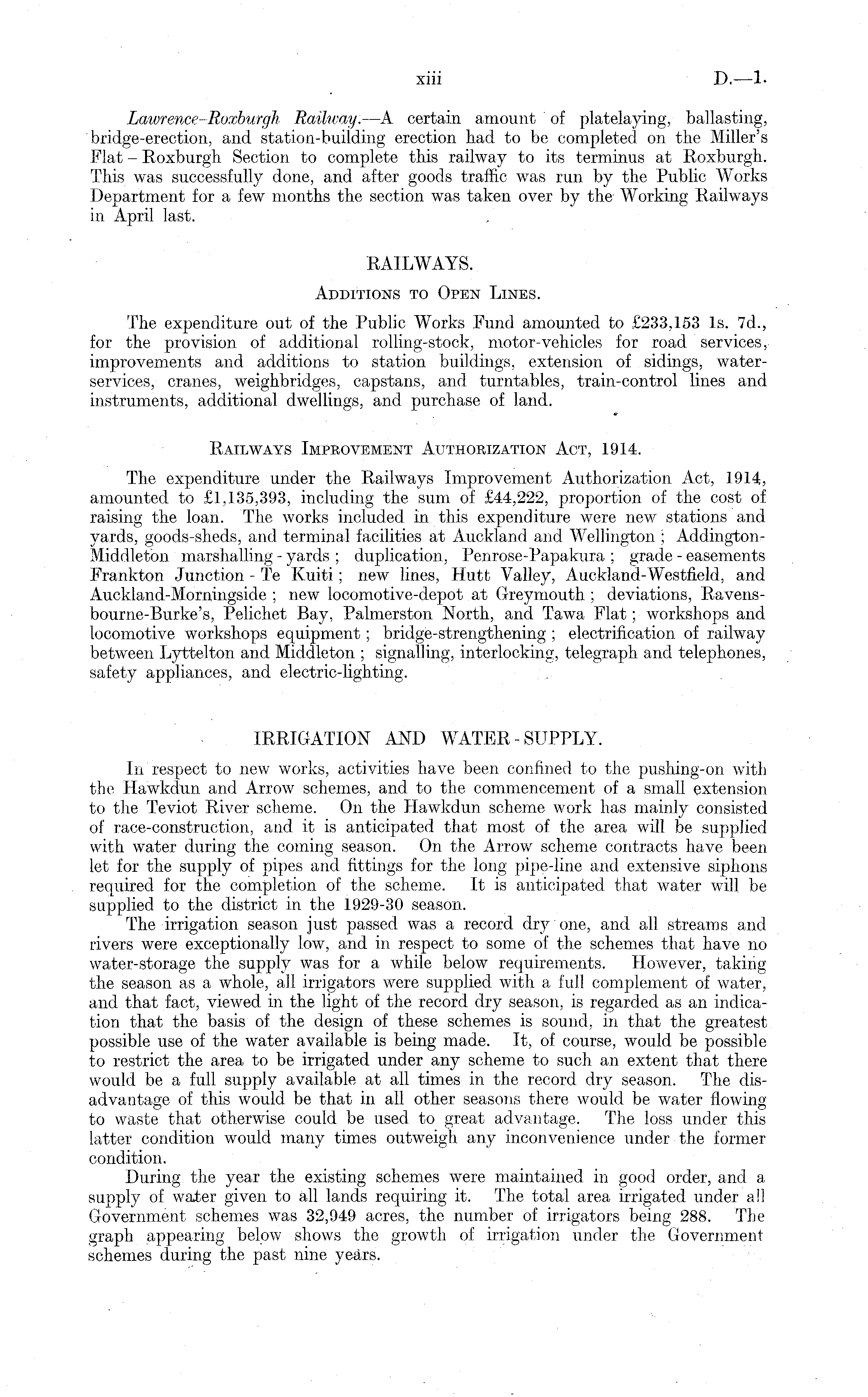 Lawrence-Roxburgh Railway. —A certain amount of platelaying, ballasting, bridge-erection, and station-building erection had to be completed on the Miller's Flat - Roxburgh. Section to complete this railway to its terminus at Roxburgh. This was successfully done, and after goods traffic was run by the Public Works Department for a few months the section was taken over by the' Working Railways in April last. RAILWAYS. Additions to Open Lines. The expenditure out of the Public Works Fund amounted to £233,153 Is. 7d., for the provision of additional rolling-stock, motor-vehicles for road services, improvements and additions to station buildings, extension of sidings, waterservices, cranes, weighbridges, capstans, and turntables, train-control lines and instruments, additional dwellings, and purchase of land. Railways Improvement Authorization Act, 1914. The expenditure under the Railways Improvement Authorization Act, 1914, amounted to £1,135,393, including the sum of £4.4,222, proportion of the cost of raising the loan. The works included in this expenditure were new stations and yards, goods-sheds, and terminal facilities at Auckland and Wellington ; AddingtonMiddleton marshalling - yards ; duplication, Penrose-Papakura ; grade - easements Frankton Junction -Te Kuiti; new lines, Hutt Valley, Auckland-Westfield, and Auckland-Morningside ; new locomotive-depot at Greymouth ; deviations, Ravens-bourne-Burke's, Pelichet Bay, Palmerstoji North, and Tawa Flat; workshops and locomotive workshops equipment; bridge-strengthening ; electrification of railway between. Lyttelton and Middleton ; signalling, interlocking, telegraph and telephones, safety appliances, and. electric-lighting. IRRIGATION AND WATER-SUPPLY. in respect to new works, activities have been confined to the pushing-on with the Hawkdun and Arrow schemes, and to the commencement of a small extension to the Teviot River scheme. On the Hawkdun scheme work has mainly consisted of race-construction, and it is anticipated that most of the area will be supplied with water during the coming season. On the Arrow scheme contracts have been let for the supply of pipes and fittings for the long pipe-line and extensive siphons required for the completion of the scheme. It is anticipated that water will be supplied to the district in the 1929-30 season. The irrigation season just passed was a record dry one, and all streams and rivers were exceptionally low, and in respect to some of the schemes that have no water-storage the supply was for a while below requirements. However, taking the season as a whole, all irrigators were supplied with a full complement of water, and that fact, viewed, in the light of the record dry season, is regarded as an indication that the basis of the design of these schemes is sound, in that the greatest possible use of the water available is being made. It, of course, would be possible to restrict the area to be irrigated under any scheme to such an extent that there would be a full supply available at all times in the record dry season. The disadvantage of this would be that in all other seasons there would be water flowing to waste that otherwise could be used to great advantage. The loss under this latter condition would many times outweigh any inconvenience under the former condition. During the year the existing schemes were maintained, in good order, and a supply of water given to all lands requiring it. The total area irrigated under all Government schemes was 32,949 acres, the number of irrigators being 288. The graph appearing below shows the growth of irrigation under the Government schemes during the past nine years.
