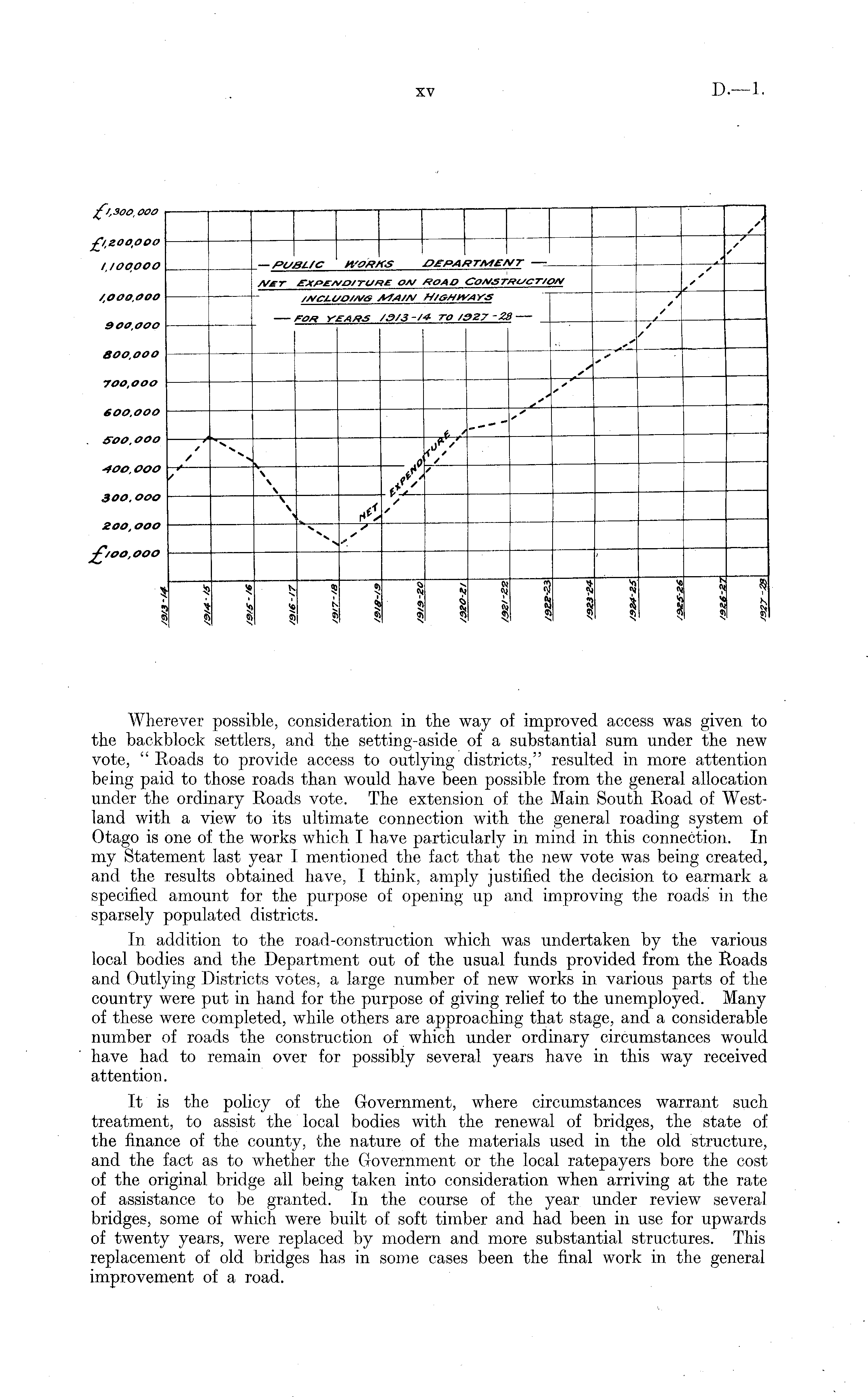 Wherever possible, consideration in the way of improved access was given to the backblock settlers, and the setting-aside of a substantial sum under the new vote, " Roads to provide access to outlying districts," resulted in more attention being paid to those roads than would have been possible from the general allocation under the ordinary Roads vote. The extension of the Main South Road of Westland with a view to its ultimate connection with the general roading system of Otago is one of the works which I have particularly in mind in this connection. In my Statement last year I mentioned the fact that the new vote was being created, and the results obtained have, I think, amply justified the decision to earmark a specified amount for the purpose of opening up and improving the roads in the sparsely populated districts. In addition to the road-construction which was undertaken by the various local bodies and the Department out of the usual funds provided from the Roads and Outlying Districts votes, a large number of new works in various paxts of the country were put in hand for the purpose of giving relief to the unemployed. Many of these were completed, while others are approaching that stage, and a considerable number of roads the construction of which under ordinary circumstances would have had to remain over for possibly several years have in this way received attention. It is the policy of the Government, where circumstances warrant such treatment, to assist the local bodies with the renewal of bridges, the state of the finance of the county, the nature of the materials used in the old structure, and the fact as to whether the Government or the local ratepayers bore the cost of the original bridge all being taken into consideration when arriving at the rate of assistance to be granted. In the course of the year under review several bridges, some of which were built of soft timber and had been in use for upwards of twenty years, were replaced by modern and more substantial structures. This replacement of old bridges has in some cases been the final work in the general improvement of a road.