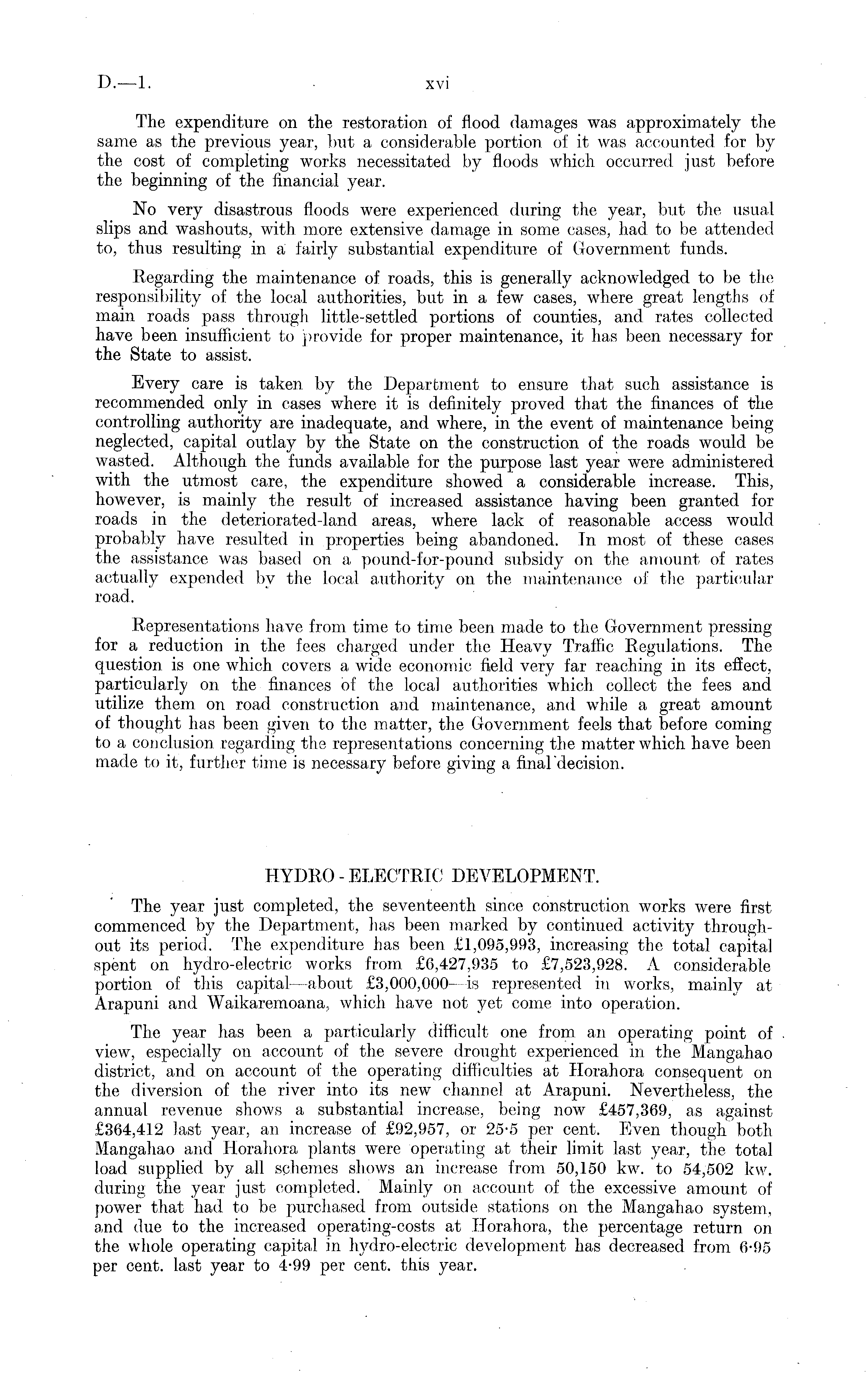 The expenditure on the restoration of flood damages was approximately the same as the previous year, but a considerable portion of it was accounted for by the cost of completing works necessitated by floods which occurred just before the beginning of the financial year. No very disastrous floods were experienced during the year, but the usual slips and washouts, with more extensive damage in some cases, had. to be attended to, thus resulting in a fairly substantial expenditure of Government funds. Regarding the maintenance of roads, this is generally acknowledged to be the responsibility of the local authorities, but in a few cases, where great lengths of main roads pass through little-settled portions of counties, and rates collected have been insufficient to provide for proper maintenance, it has been necessary for the State to assist. Every care is taken, by the Department to ensure that such assistance is recommended only in cases where it is definitely proved that the finances of the controlling authority are inadequate, and where, in the event of maintenance being neglected, capital outlay by the State on the construction of the roads would be wasted. Although the funds available for the purpose last year were administered with the utmost care, the expenditure showed a considerable increase. This, however, is mainly the result of increased assistance having been granted for roads in the deteriorated-land areas, where lack of reasonable access would probably have resulted in properties being abandoned. In most of these cases the assistance was based on a pound-for-pound subsidy on the amount of rates actually expended by the local authority on the maintenance of the particular road. Representations have from time to time been made to the Government pressing for a reduction in the fees charged under the Heavy Traffic Regulations. The question is one which covers a wide economic field very far reaching in its effect, particularly on the finances of the local authorities which collect the fees and utilize them on road construction and maintenance, and while a great amount of thought has been given to the matter, the Government feels that before coming to a conclusion regarding the representations concerning the matter which have been made to it, further time is necessary before giving a final'decision. HYDRO - ELECTRIC DEVELOPMENT. The year just completed, the seventeenth since construction works were first commenced, by the Department, has been marked by continued activity throughout its period. The expenditure has been £1,095,993, increasing the total capital spent on hydro-electric works from £6,427,935 to £7,523,928. A considerable portion of this capital —about £3,000,000- is represented in works, mainly at Arapuni and Waikaremoana, which have not yet come into operation. The year has been a particularly difficult one from an operating point of view, especially on account of the severe drought experienced in the Mangahao district, and on account of the operating difficulties at Horahora consequent on the diversion of the river into its new channel at Arapuni. Nevertheless, the annual revenue shows a substantial increase, being now £457,369, as against £364,412 last year, an increase of £92,957, or 25-5 per cent. Even though both Mangahao and Horahora plants were operating at their limit last year, the total load supplied by all schemes shows an increase from 50,150 kw. to 54,502 kw. during the year just completed. Mainly on account of the excessive amount of power that had to be purchased from outside stations on the Mangahao system, and due to the increased operating-costs at Horahora, the percentage return on the whole operating capital in hydro-electric development has decreased from 6-95 per cent, last year to 4-99 per cent, this year.