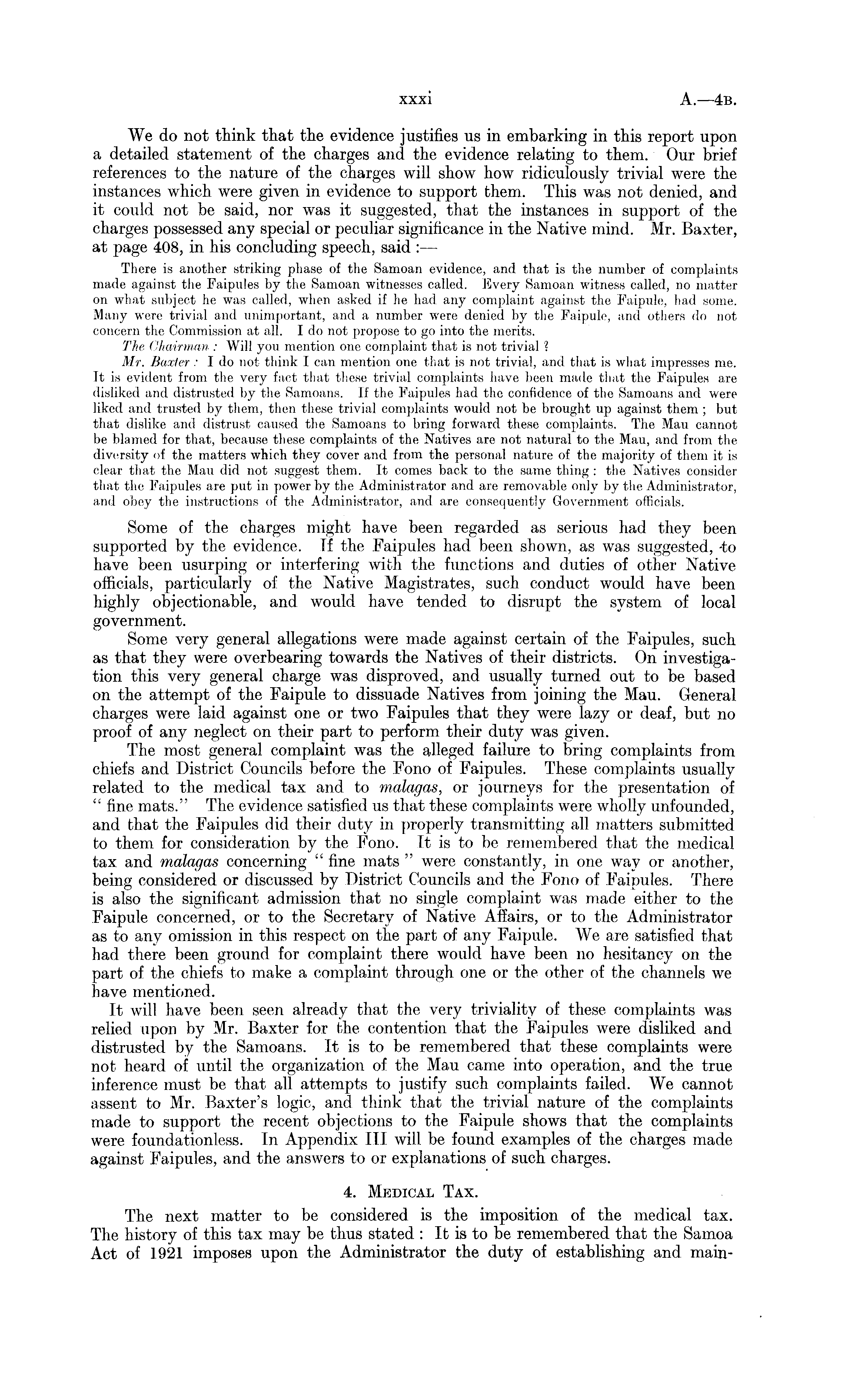 We do not think that the evidence justifies us in embarking in this report upon a detailed statement of the charges and the evidence relating to them. Our brief references to the nature of the charges will show how ridiculously trivial were the instances which were given in evidence to support them. This was not denied, and it could not be said, nor was it suggested, that the instances in support of the charges possessed any special or peculiar significance in the Native mind. Mr. Baxter, at page 408, in his concluding speech, said: — There is another striking phase of the Samoan evidence, and that is the number of complaints made against the Faipules by the Samoan witnesses called. Every Samoan witness called, no matter on what subject he was called, when asked if he had. any complaint against the Faipule, had some. Many were trivial and unimportant, and a number were denied by the Faipule, and others do not concern the Commission at all. Ido not propose to go into the merits. The Chairman : Will you mention one complaint that is not trivial ? Mr. Baxter: Ido not think I can mention one that is not trivial, and that is what impresses me. It is evident from the very fact that these trivial complaints have been made that the Faipules are disliked and distrusted by the Samoans. If the Faipules had the confidence of the Samoans and were liked and trusted by them, then these trivial complaints would not be brought up against them ; but that dislike and distrust caused the Samoans to bring forward these complaints. The Mau cannot be blamed for that, because these complaints of the Natives are not natural to the Mau, and from the diversity of the matters which they cover and from the personal nature of the majority of them it is clear that the Mau did not suggest them. It comes back to the same thing : the Natives consider that the Faipules are put in power by the Administrator and are removable only by the Administrator, and obey the instructions of the Administrator, and are consequently Government officials. Some of the charges might have been regarded as serious had they been supported by the evidence. If the Faipules had been shown, as was suggested, -to have been usurping or interfering with the functions and duties of other Native officials, particularly of the Native Magistrates, such conduct would have been highly objectionable, and would have tended to disrupt the system of local government. Some very general allegations were made against certain of the Faipules, such as that they were overbearing towards the Natives of their districts. On investigation this very general charge was disproved, and usually turned out to be based on the attempt of the Faipule to dissuade Natives from joining the Mau. General charges were laid against one or two Faipules that they were lazy or deaf, but no proof of any neglect on their part to perform their duty was given. The most general complaint was the alleged failure to bring complaints from chiefs and District Councils before the Fono of Faipules. These complaints usually related to the medical tax and to malagas, or journeys for the presentation of " fine mats." The evidence satisfied us that these complaints were wholly unfounded, and that the Faipules did their duty in properly transmitting all matters submitted to them for consideration by the Fono. It is to be remembered that the medical tax and malagas concerning " fine mats " were constantly, in one way or another, being considered or discussed by District Councils and the Fono of Faipules. There is also the significant admission that 110 single complaint was made either to the Faipule concerned, or to the Secretary of Native Affairs, or to the Administrator as to any omission in this respect on the part of any Faipule. We are satisfied that had there been ground for complaint there would have been 110 hesitancy on the part of the chiefs to make a complaint through one or the other of the channels we have mentioned. It will have been seen already that the very triviality of these complaints was relied upon by Mr. Baxter for the contention that the Faipules were disliked and distrusted by the Samoans. It is to be remembered that these complaints were not heard of until the organization of the Mau came into operation, and the true inference must be that all attempts to justify such complaints failed. We cannot assent to Mr. Baxter's logic, and think that the trivial nature of the complaints made to support the recent objections to the Faipule shows that the complaints were foundationless. In Appendix 111 will be found examples of the charges made against Faipules, and the answers to or explanations of such charges. 4. Medical Tax. The next matter to be considered is the imposition of the medical tax. The history of this tax may be thus stated : It is to be remembered that the Samoa Act of 1921 imposes upon the Administrator the duty of establishing and main-