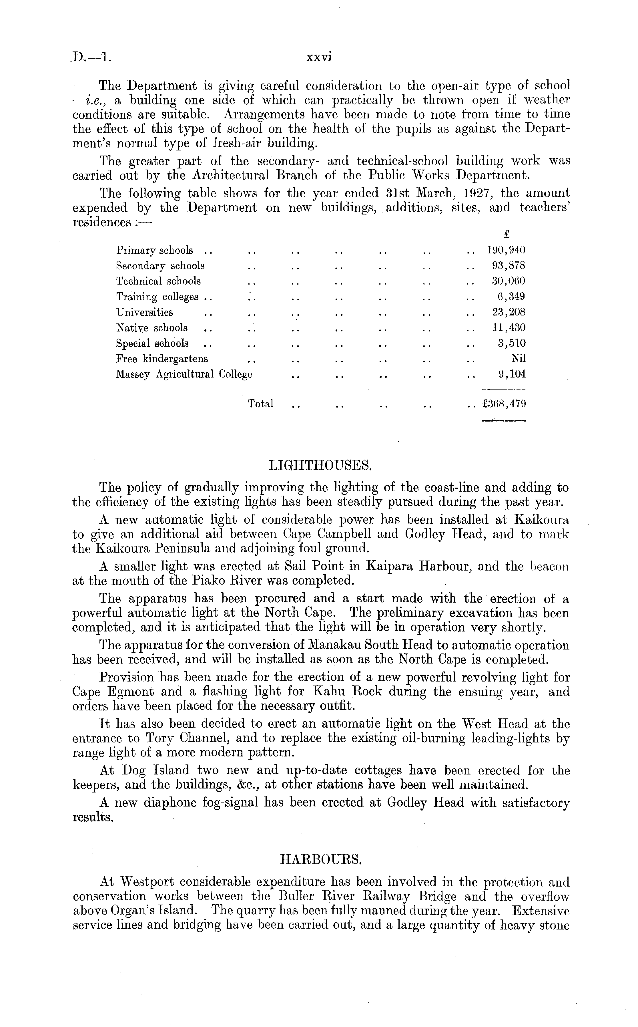 The Department is giving careful consideration to the open-air type of school — i.e., a building one side of which can practically be thrown open if weather conditions are suitable. Arrangements have been made to note from time to time the effect of this type of school on the health of the pupils as against the Department's normal type of fresh-air building. The greater part of the secondary- and technical-school building work was carried out by the Architectural Branch of the Public Works Department. The following table shows for the year ended 31st March, 1927, the amount expended by the Department on new buildings, additions, sites, and teachers' residences: —■ £ Primary schools .. .. .. .. .. .. .. 190,940 Secondary schools .. .. .. .. .. .. 93,878 Technical schools .. .. .. .. .. .. 30,060 Training colleges .. .'. .. .. .. .. .. 6,349 Universities .. .. .. .. .. .. .. 23,208 Native schools .. ... .. .. .. .. .. 11,430 Special schools .. .. .. .. .. .. .. 3,510 Free kindergartens .. .. .. .. .. .. Nil Massey Agricultural College .. .. .. .. .. 9,104 Total .... .. .. .. .. £368,479 LIGHTHOUSES. The policy of gradually improving the lighting of the coast-line and adding to the efficiency of the existing lights has been steadily pursued during the past year. A new automatic light of considerable power has been installed at Kaikoura to give an additional aid between (Jape Campbell and Godley Head, and to mark the Kaikoura Peninsula and adjoining foul ground. A smaller light was erected at Sail Point in Kaipara Harbour, and the beacon at the mouth of the Piako River was completed. The apparatus has been procured and a start made with the erection of a powerful automatic light at the North Cape. The preliminary excavation has been completed, and it is anticipated that the light will be in operation very shortly. The apparatus for the conversion of Manakau South Head to automatic operation has been received, and will be installed as soon as the North Cape is completed. Provision has been made for the erection of a new powerful revolving light for Cape Egmont and a flashing light for Kahu Rock during the ensuing year, and orders have been placed for the necessary outfit. It has also been decided to erect an automatic light on the West Head at the entrance to Tory Channel, and to replace the existing oil-burning leading-lights by range light of a more modern pattern. At Dog Island two new and up-to-date cottages have been erected for the keepers, and the buildings, &c, at other stations have been well maintained. A new diaphone fog-signal has been erected at Godley Head with satisfactory results. HARBOURS. At Westport considerable expenditure has been involved in the protection and conservation works between the Buller River Railway Bridge and the overflow above Organ's Island. The quarry has been fully manned during the year. Extensive service lines and bridging have been carried out, and a large quantity of heavy stone