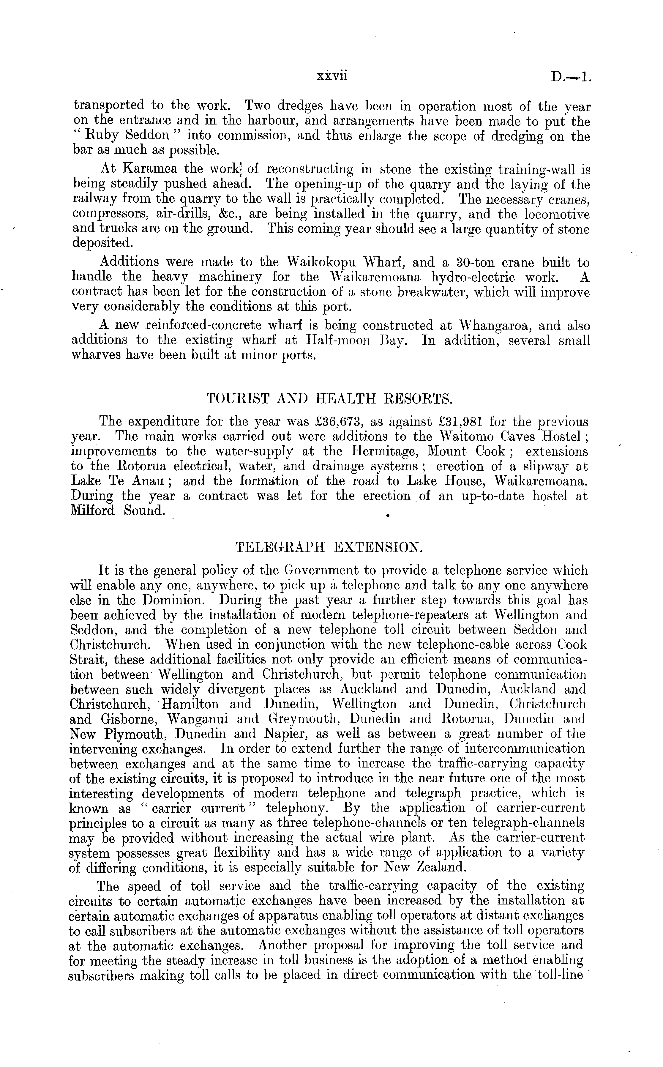 transported to the work. Two dredges have been in operation most of the year on the entrance and in the harbour, and arrangements have been made to put the " Ruby Seddon " into commission, and thus enlarge the scope of dredging on the bar as much as possible. At Karamea the work] of reconstructing in stone the existing training-wall is being steadily pushed ahead. The opening-up of the quarry and the laying of the railway from the quarry to the wall is practically completed. The necessary cranes, compressors, air-drills, &c, are being installed in the quarry, and the locomotive and trucks are on the ground. This coming year should see a large quantity of stone deposited. Additions were made to the Waikokopu Wharf, and a 30-ton crane built to handle the heavy machinery for the Waikaremoana hydro-electric work. A contract has been let for the construction of a stone breakwater, which will improve very considerably the conditions at this port. A new reinforced-concrete wharf is being constructed at Whangaroa, and also additions to the existing wharf at Half-moon Bay. In addition, several small wharves have been built at minor ports. TOURIST AND HEALTH RESORTS. The expenditure for the year was £36,673, as against £31,981 for the previous year. The main works carried out were additions to the Waitomo Caves Hostel ; improvements to the water-supply at the Hermitage, Mount Cook ; extensions to the Rotorua electrical, water, and drainage systems ; erection of a slipway at Lake Te Anau ; and the formation of the road to Lake House, Waikaremoana. During the year a contract was let for the erection of an up-to-date hostel at Milford Sound. TELEGRAPH EXTENSION. It is the general policy of the Government to provide a telephone service which will enable any one, anywhere, to pick up a telephone and talk to any one anywhere else in the Dominion. During the past year a further step towards this goal has been achieved by the installation of modern telephone-repeaters at Wellington and Seddon, and the completion of a new telephone toll circuit between Seddon and Christchurch. When used in conjunction with the new telephone-cable across Cook Strait, these additional facilities not only provide an efficient means of communication between Wellington and Christchurch, but permit telephone communication between such widely divergent places as Auckland and Dunedin, Auckland and Christchurch, Hamilton and Dunedin, Wellington and Dunedin, Christchurch and Gisborne, Wanganui and Greymouth, Dunedin and Rotorua, Dunedin and New Plymouth, Dunedin and Napier, as well as between a great number of the intervening exchanges. In order to extend further the range of intercommunication between exchanges and at the same time to increase the traffic-carrying capacity of the existing circuits, it is proposed to introduce in the near future one of the most interesting developments of modern telephone and telegraph practice, which is known as " carrier current" telephony. By the application of carrier-current principles to a circuit as many as three telephone-channels or ten telegraph-channels may be provided without increasing the actual wire plant. As the carrier-current system possesses great flexibility and has a wide range of application to a variety of differing conditions, it is especially suitable for New Zealand. The speed of toll service and the traffic-carrying capacity of the existing circuits to certain automatic exchanges have been increased by the installation at certain automatic exchanges of apparatus enabling toll operators at distant exchanges to call subscribers at the automatic exchanges without the assistance of toll operators at the automatic exchanges. Another proposal for improving the toll service and for meeting the steady increase in toll business is the adoption of a method enabling subscribers making toll calls to be placed in direct communication with the toll-line