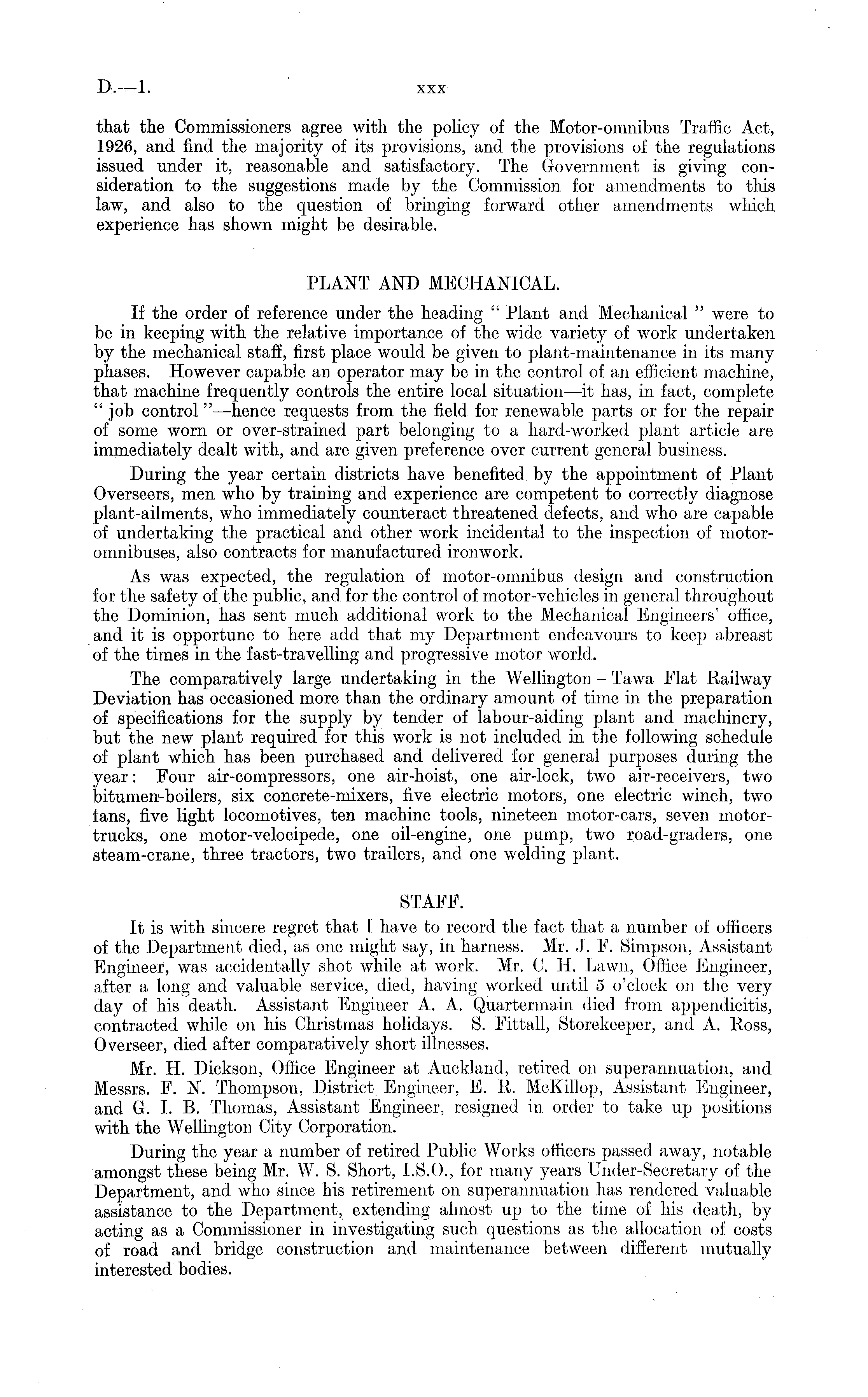 that the Commissioners agree with the policy of the Motor-omnibus Traffic Act, 1926, and find the majority of its provisions, and the provisions of the regulations issued under it, reasonable and satisfactory. The Government is giving consideration to the suggestions made by the Commission for amendments to this law, and also to the question of bringing forward other amendments which experience has shown might be desirable. PLANT AND MECHANICAL. If the order of reference under the heading " Plant and Mechanical " were to be in keeping with the relative importance of the wide variety of work undertaken by the mechanical staff, first place would be given to plant-maintenance in its many phases. However capable an operator may be in the control of an efficient machine, that machine frequently controls the entire local situation—it has, in fact, complete "job control" —hence requests from the field for renewable parts or for the repair of some worn or over-strained part belonging to a hard-worked plant article are immediately dealt with, and are given preference over current general business. During the year certain districts have benefited by the appointment of Plant Overseers, men who by training and experience are competent to correctly diagnose plant-ailments, who immediately counteract threatened, defects, and who are capable of undertaking the practical and other work incidental to the inspection of motoromnibuses, also contracts for manufactured ironwork. As was expected, the regulation of motor-omnibus design and construction for the safety of the public, and for the control of motor-vehicles in general throughout the Dominion, has sent much additional work to the Mechanical Engineers' office, and it is opportune to here add that my Department endeavours to keep abreast of the times in the fast-travelling and progressive motor world. The comparatively large undertaking in the Wellington - Tawa Flat Railway Deviation has occasioned more than the ordinary amount of time in the preparation of specifications for the supply by tender of labour-aiding plant and machinery, but the new plant required for this work is not included in the following schedule of plant which has been purchased and delivered for general purposes during the year: Four air-compressors, one air-hoist, one air-lock, two air-receivers, two bitumen-boilers, six concrete-mixers, five electric motors, one electric winch, two tans, five light locomotives, ten machine tools, nineteen motor-cars, seven motortrucks, one motor-velocipede, one oil-engine, one pump, two road-graders, one steam-crane, three tractors, two trailers, and one welding plant. STAFF. It is with sincere regret that L have to record the fact that a number of officers of the Department died, as one might say, in harness. Mr. ,1. F. Simpson, Assistant Engineer, was accidentally shot while at work. Mr. C. 11. Lawn, Office Engineer, after a long and valuable service, died, having worked until 5 o'clock on the very day of his death. Assistant Engineer A. A. Quartermain died from appendicitis, contracted while on his Christmas holidays. S. Fittall, Storekeeper, and A. Ross, Overseer, died after comparatively short illnesses. Mr. H. Dickson, Office Engineer at Auckland, retired on superannuation, and Messrs. F. N. Thompson, District Engineer, E. R. Mc.Killop, Assistant Engineer, and G. I. B. Thomas, Assistant Engineer, resigned in order to take up positions with the Wellington City Corporation. During the year a number of retired Public Works officers passed away, notable amongst these being Mr. W. S. Short, 1.5.0., for many years Under-Secretary of the Department, and who since his retirement on superannuation has rendered valuable assistance to the Department, extending almost up to the time of his death, by acting as a Commissioner in investigating such questions as the allocation of costs of road and bridge construction and maintenance between different mutually interested bodies.