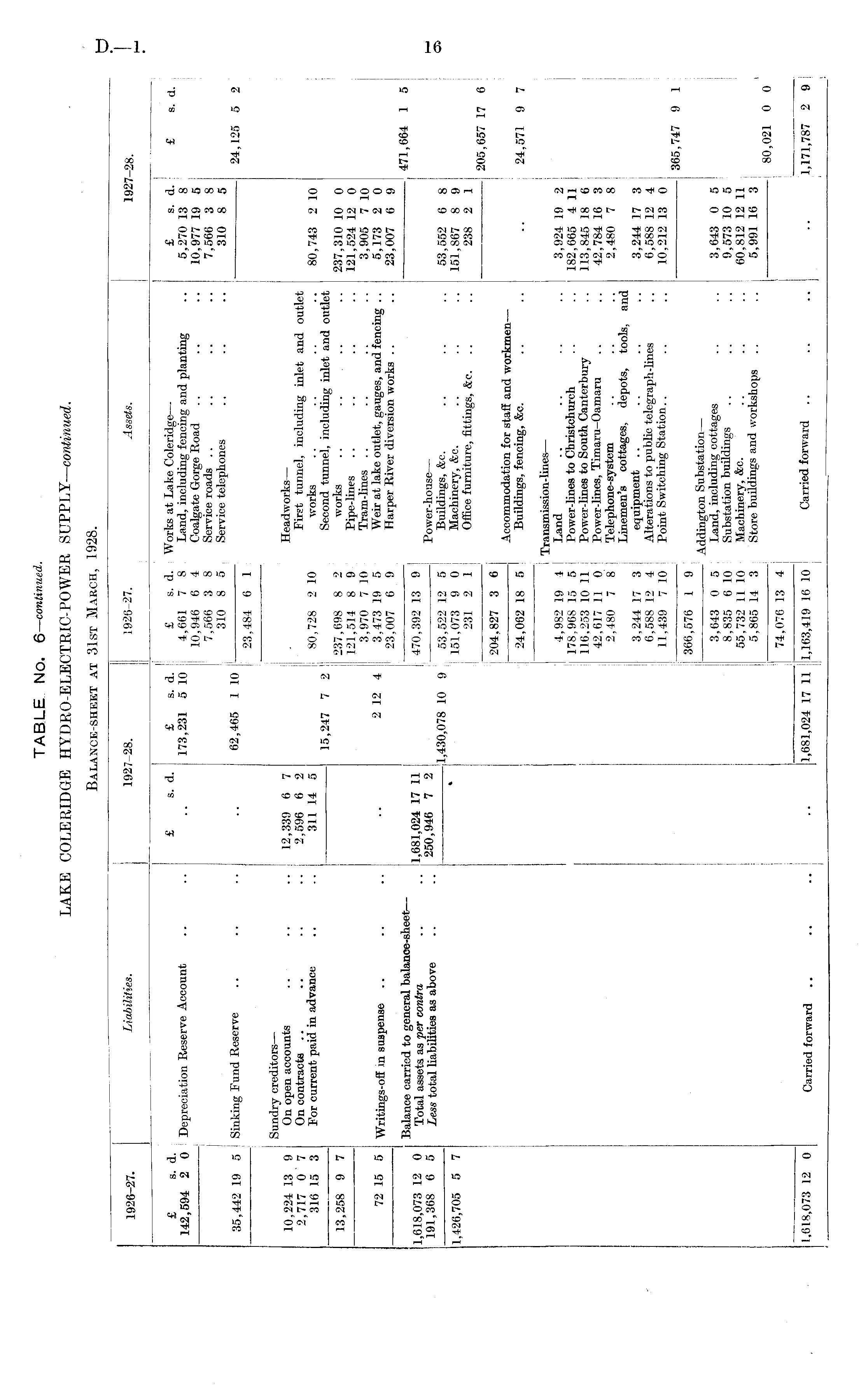 TABLE No. 6— continued. LAKE COLERIDGE HYDRO-ELECTRIC-POWER SUPPLY— continued. Balance-sheet at 31st March, 1928.