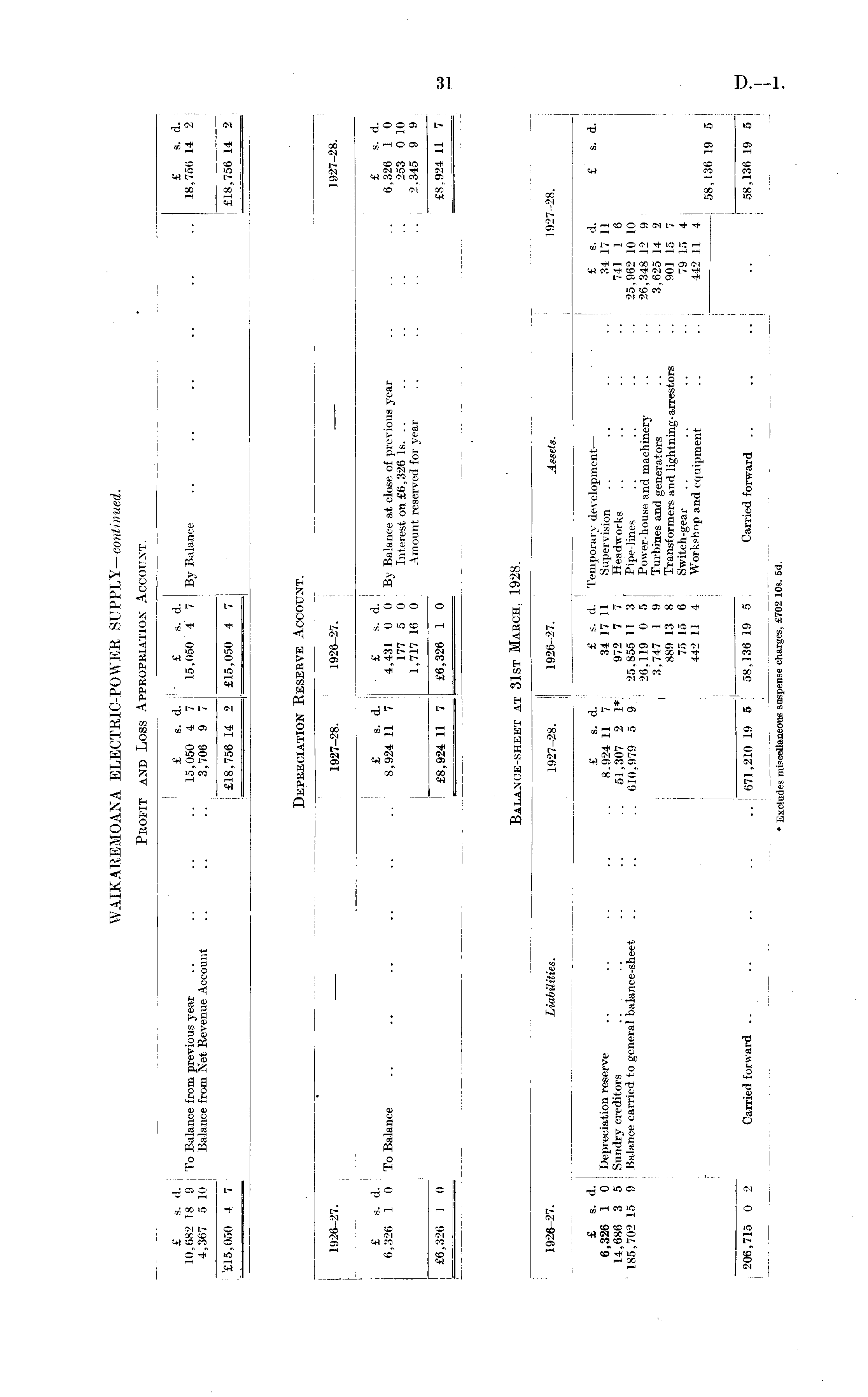 £ s. d. £ s. d. ' £ s. d. ! £ s. d. 10,682 18 9 To Balance from previous year .. .. .. .. 15,050 4 7 j 15,050 4 7 j By Balance .. .. .. .. .. .. 18,756 14 2 4,367 5 10 Balance from Net Revenue Account .. .. .. 3,706 9 7 j ! '£15,050 4 7 | £18,756 14 2 j £15,050 4 7 | £18,756 14 2 Depreciation Reserve Account. . _ j : - | 1926-27. 1927-28. 1926-27. 1927-28. I I I ' £ s. d. £ s. d. £ s. d. £ s. d. 6,326 1 0 To Balance .. .. .. .. .. .. 8,924 11 7 4.431 0 0 By Balance at close of previous year .. .. .. 6.326 1 0 177 5 0 Interest on £6,326 Is. .. .. .. .. .. 253 0 10 1,717 16 0 Amount reserved for year .. .. .. .. 2.345 9 9 £6,326 1 0 £8,924 11 7 £6,326 1 0 £8,924 11 7 Balance-sheet at 31st March. 1928. 1926-27. Liabilities. 1927-28. 1926-27. Assets. 1927-28. I £ s. d. £ s . d. £ s. d. Temporary development — £ s. d. £ s. d. 6,326 1 0 Dejireciation reserve .. .. .. .. .. 8.924 11 7 , 34 ]7 11 Supervision .. .. .. .. 34 17 11 14,686 3 5 Sundry creditors .. .. .. .. 51,307 2 1*1 972 7 7 Headworks .. .. .. .. 741 1 6 185,702 15 9 Balance carried to general balance-sheet .. .. .. 610,979 5 9 j 25.855 11 3 Pipe-lines .. .. .. .. 25,962 10 10 26,119 0 5 Power-house and machinery .. •• 26,348 12 9 3,747 1 9 Turbines and generators •• -■ 3,625 14 2 889 13 8 Transformers and lightning-arrestors .. 901 15 7 75 15 6 Switch-gear .. .. .. .. 79 15 4 442 11 4 Workshop and equipment .. ■■ 442 11 4 1 ; 1 58,136 19 5 206,715 0 2 Carried forward .. .. .. .. .. 671,210 19 5 58,136 19 5 ; Carried forward .. .. .. ... 58,136 19 5 * Excludes miscellaneous suspense charges, £702 10s. 5d.