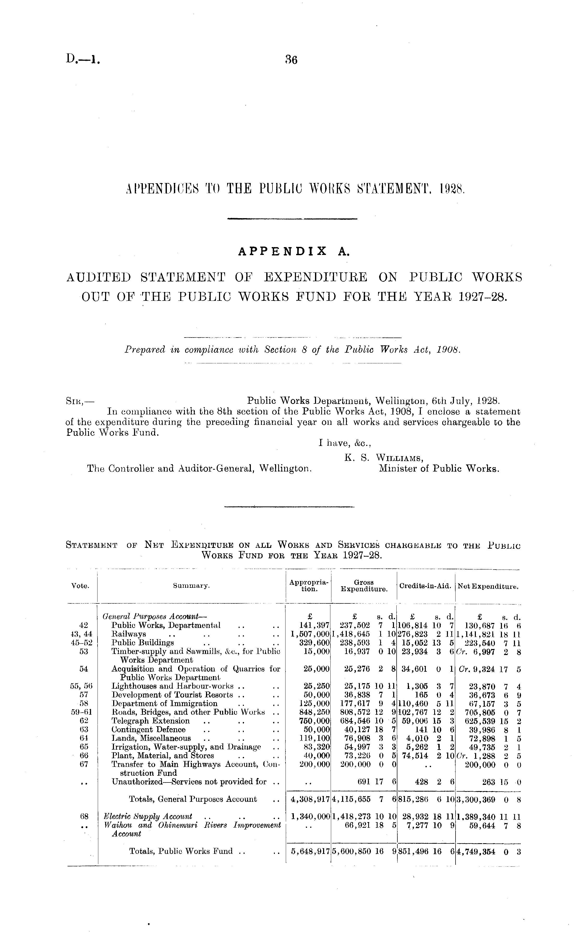 Sib, — Public Works Department, Wellington, 6th July, 1928. In compliance with the Bth section of the Public Works Act, 1908, I enclose a statement of the expenditure during the preceding financial year on all works and services chargeable to the Public Works Fund. I have, &c, K. S. Williams, The Controller and Auditor-General, Wellington. Minister of Public Works.