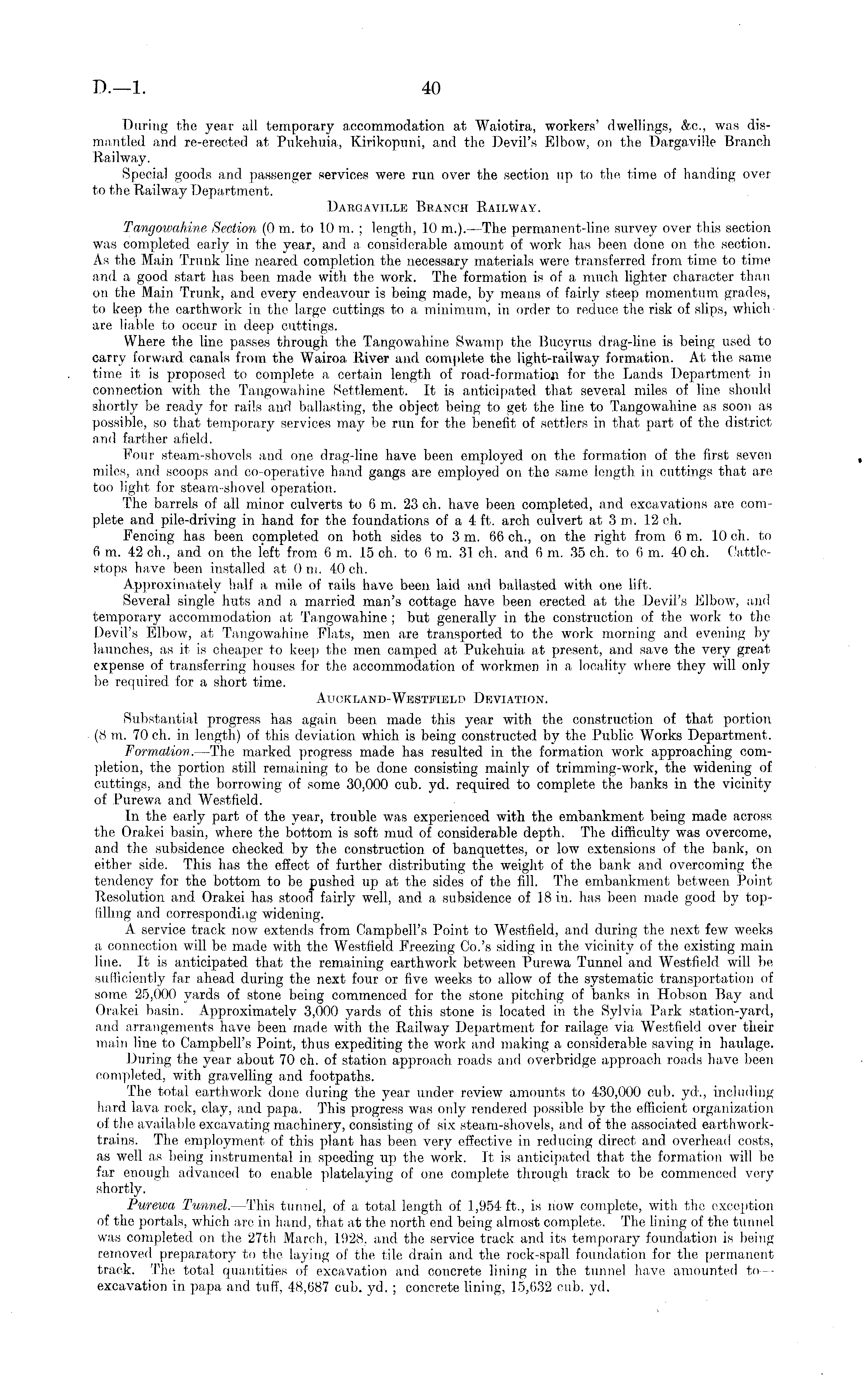 During the year all temporary accommodation at Waiotira, workers' dwellings, &c, was dismantled and re-erected at Pukehuia, Kirikopuni, and the Devil's Elbow, on the Dargaville Branch Railway. Special goods and passenger services were run over the section up to the time of handing over to the Railway Department. Dargaville Branch Railway. Tangowahine Section (0 m. to 10 m. ; length, 10 m.). —The permanent-line survey over this section was completed early in the year, and a considerable amount of work has been done on the section. As the Main Trunk line neared completion the necessary materials were transferred from time to time and a good start has been made with the work. The formation is of a. much lighter character than on the Main Trunk, and every endeavour is being made, by means of fairly steep momentum grades, to keep the earthwork in the large cuttings to a minimum, in order to reduce the risk of slips, whichare liable to occur in deep cuttings. Where the line passes through the Tangowahine Swamp the Bucyrus drag-line is being used to carry forward canals from the Wairoa River and complete the light-railway formation. At the same time it is proposed to complete a certain length of road-formation for the Lands Department in connection with the Tangowahine Settlement. It is anticipated that several miles of line should shortly be ready for rails and ballasting, the object being to get the line to Tangowahine as soon as possible, so that temporary services may be run for the benefit of settlers in that part of the district and farther afield. Four steam-shovels and one drag-line have been employed on the formation of the first seven miles, and scoops and co-operative hand gangs are employed on the same length in cuttings that are too light for steam-shovel operation. The barrels of all minor culverts to 6 m. 23 eh. have been completed, and excavations are complete and pile-driving in hand for the foundations of a 4 ft. arch culvert at 3 m. 12 eh. Fencing has been completed on both sides to 3 m. 66 oh., on the right from 6 m. 10 eh. to 6m. 42 eh., and on the left from 6m. 15 eh. to 6m. 31 eh. and 6m. 35 eh. to 6m. 40 eh. Cattlestops have been installed at 0 m. 40 eh. Approximately half a mile of rails have been laid and ballasted with one lift. Several single huts and a married man's cottage have been erected at the Devil's Elbow, and temporary accommodation at Ta.ngowahine ; but generally in the construction of the work to the Devil's Elbow, at Tangowahine Flats, men are transported to the work morning and evening by launches, as it is cheaper to keep the men camped at Pukehuia at present, and save the very great expense of transferring houses for the accommodation of workmen in a locality where they will only be required, for a short time. Auckland-Westfield Deviation. Substantial progress has again been made this year with the construction of that portion (8 m. 70 eh. in length) of this deviation which is being constructed by the Public Works "Department. Formation. —The marked progress made has resulted in. the formation work approaching completion, the portion, still remaining to be done consisting mainly of trimming-work, the widening of cuttings, and the borrowing of some 30,000 cub. yd. required to complete the banks in the vicinity of Purewa and Westfield. In the early part of the year, trouble was experienced with the embankment being made across the Orakei basin, where the bottom is soft mud of considerable depth. The difficulty was overcome, and the subsidence checked, by the construction of banquettes, or low extensions of the bank, on either side. This has the effect of further distributing the weight of the bank and. overcoming the tendency for the bottom to be pushed up at the sides of the fill. The embankment between Point Resolution and Orakei has stood fairly well, and. a subsidence of 18 in. has been made good by topfilling and corresponding widening. A. service track now extends from Campbell's Point to Westfield, and during the next few weeks a connection will be made with the Westfield Freezing Co.'s siding in the vicinity of the existing main line. It is anticipated that the remaining earthwork between Purewa Tunnel and Westfield will be sufficiently far ahead during the next four or five weeks to allow of the systematic transportation of some 25,000 yards of stone being commenced for the stone pitching of banks in Hobson Bay and Orakei basin. Approximately 3,000 yards of this stone is located in the Sylvia Park station-yard, and arrangements have been made with the Railway Department for railage via Westfield over their main line to Campbell's Point, thus expediting the work and making a considerable saving in haulage. During the year about 70 eh. of station approach roads and overbridge approach roads have been completed, with gravelling and footpaths. The total earthwork done during the year under review amounts to 430,000 cub. yd., including hard lava rock, clay, and papa. This progress was only rendered possible by the efficient organization of the available excavating machinery, consisting of six steam-shovels, and of the associated earthworktrains. The employment of this plant has been very effective in reducing direct and overhead costs, as well as being instrumental in speeding up the work. It is anticipated that the formation will be far enough advanced to enable platelaying of one complete through track to be commenced very shortly. Purewa Tunnel. —This tunnel, of a total length of f,954 ft., is now complete, with, the exception of the portals, which are in hand, that at the north end being almost complete. The lining of the tunnel was completed on the 27th March, 1928, and the service track and its temporary foundation is being removed preparatory to the laying of the tile drain and the rock-spall foundation for the permanent track. The total quantities of excavation and concrete lining in the tunnel have amounted to — excavation in papa an