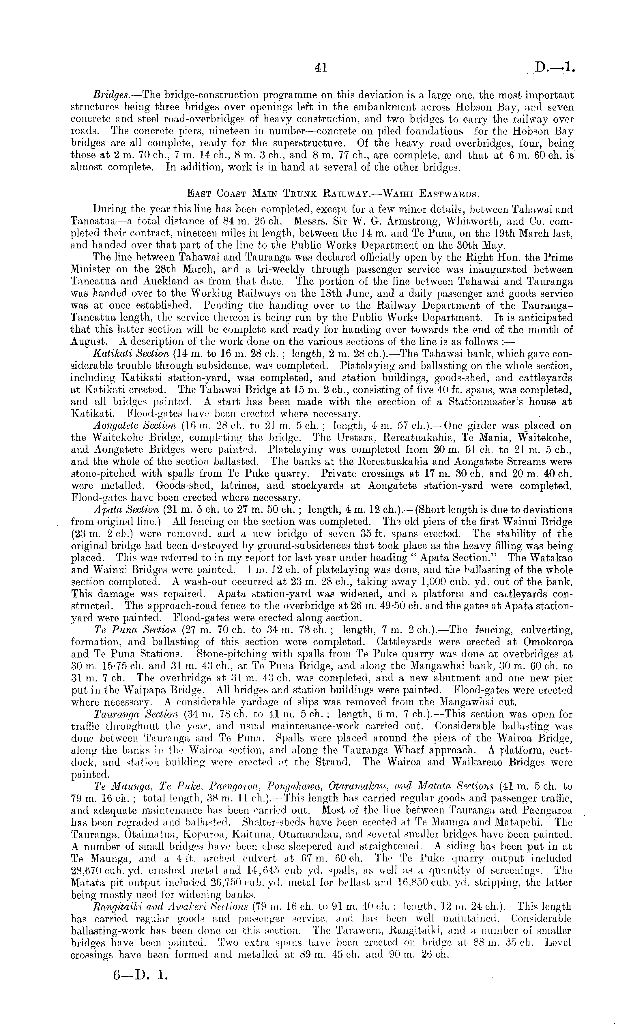 Bridges. —The bridge-construction programme on this deviation is a large one, the most important structures being three bridges over openings left in the embankment across Hobson Bay, and seven concrete and steel road-ovcrbridges of heavy construction, and two bridges to carry the railway over roads. The concrete piers, nineteen in number—concrete on piled foundations—for the Hobson Bay bridges are all complete, ready for the superstructure. Of the heavy road-overbridges, four, being those at 2 m. 70 eh., 7 m. 14 eh., 8 m. 3 eh., and 8 m. 77 eh., are complete, and that at 6 m. 60 eh. is almost complete. In addition, work is in hand at several of the other bridges. East Coast Main Trunk Railway.—Waihi Eastwards. During the year this line has been completed, except for a few minor details, between Tahawai and Taneatua —a total distance of 84 m. 26 eh. Messrs. Sir W. G. Armstrong, Whitworth, and Co. completed their contract, nineteen miles in length, between the 14 m. and Te Puna, on the 19th March last, and handed over that part of the line to the Public Works Department on the 30th May. The line between Tahawai and Tauranga was declared officially open by the Right Hon. the Prime Minister on the 28th March, and a tri-weekly through passenger service was inaugurated between Taneatua and Auckland as from that date. The portion of the line between Tahawai and Tauranga was handed over to the Working Railways on the 18th June, and a daily passenger and goods service was at once established. Pending the handing over to the Railway Department of the TaurangaTaneatua length, the service thereon is being run by the Public Works Department. It is anticipated that this latter section will be complete and ready for handing over towards the end of the month of August. A description of the work done on the various sections of the line is as follows : — Katikati Section (14 m. to 16 m. 28 eh. ; length, 2 m. 28 eh.). —The Tahawai bank, which gave considerable trouble through subsidence, was completed. Platelaying and ballasting on the whole section, including Katikati station-yard, was completed, and station buildings, goods-shed, and cattleyards at Katikati erected. The Tahawai Bridge at 15 m. 2 eh., consisting of five 40 ft. spans, was completed, and all bridges painted. A start has been made with the erection of a Stationmaster's house at Katikati. Flood-gates have been erected where necessary. Aongatete Section (16 m. 28 eh. to 21 m. 5 eh. ; length, 4m. 57 eh.). —One girder was placed on the Waitekohe Bridge, completing the bridge. The Uretara, Rereatuakahia, Te Mania, Waitekohe, and Aongatete Bridges were painted. Platelaying was completed from 20 m. 51 eh. to 21m. 5 eh., and. the whole of the section ballasted. The banks at the Rereatuakahia and Aongatete Streams were stone-pitched with spalls from Te Puke quarry. Private crossings at 17 m. 30 eh. and 20 m. 40 eh. were metalled. Goods-shed, latrines, and stockyards at Aongatete station-yard were completed. Flood-gates have been erected where necessary. Apata Section (21 m. 5 eh. to 27 m. 50 eh. ; length, 4 m. 12 eh.). —(Short length is due to deviations from original line.) All fencing on the section was completed. Th-s- old piers of the first Wainui Bridge (23 m. 2 eh.) were removed, and a new bridge of seven 35 ft. spans erected. The stability of the original bridge had been destroyed by ground-subsidences that took place as the heavy filling was being placed. This was referred to in my report for last year under heading " Apata Section." The Watakao and Wainui Bridges were painted. Im. 12 eh. of platelaying was done, and the ballasting of the whole section completed. A wash-out occurred at 23 m. 28 eh., taking away 1,000 cub. yd. out of the bank. This damage was repaired. Apata station-yard was widened, and a platform and cattleyards constructed. The approach-road fence to the overbridge at 26 m. 49-50 eh. and the gates at Apata stationyard were painted. Flood-gates were erected along seotion. Te Puna Section (27 m. 70 eh. to 34 in. 78 eh. ; length, 7m. 2ch.). —The fencing, culverting, formation, and ballasting of this section were completed. Cattleyards were erected at Omokoroa and Te Puna Stations. Stone-pitching with spalls from Te Puke quarry was done at overbridges at 30 m. 15-75 eh. and 31 m. 43 eh., at Te Puna Bridge, and along the Mangawhai bank, 30 m. 60 eh. to 31 m. 7 eh. The overbridge at 31 m. 43 eh. was completed, and a new abutment and one new pier put in the Waipapa Bridge. All bridges and station buildings were painted. Flood-gates were erected where necessary. A considerable yardage of slips was removed from the Mangawhai cut. Tauranga Section (34 m. 78 eh. to 41m. 5 eh. ; length, 6m. 7 eh.). —This section was open for traffic throughout the year, and usual maintenance-work carried out. Considerable ballasting was done between Tauranga and Te Puna,. Spalls were placed around the piers of the Wairoa Bridge, along the banks in the Wairoa section, and along the Tauranga Wharf approach. A platform, cartdock, and station building were erected at the Strand. The Wairoa and Waikareao Bridges were painted. Te Maunga, Te, Puke, Paengaroa, Pongakawa, Otaramakau, and Matata Sections (41 m. 5 eh. to 79 m. 16 eh. ; total length, 38 m. 11 eh.). —This length has carried regular goods and passenger traffic, and adequate maintenance has been carried out. Most of the line between Tauranga. and Paengaroa, has been regraded and ballasted. Shelter-sheds have been erected at Te Maunga and Matapehi. The Tauranga, Otaimatua, Kopuroa, Kaituna, Otamarakau, and several smaller bridges have been painted. A number of small bridges have been close-sleepered and straightened. A siding has been put in at Te Maunga, and a 4 ft. arched culvert at 67 m. 60 eh. The Te Puke quarry output included. 28,670 cub. yd. crushed metal and 1.4,645 cub yd. spalls, as well as a quantity of screenings. The Matata pit output included 26,750 cub. yd. meta