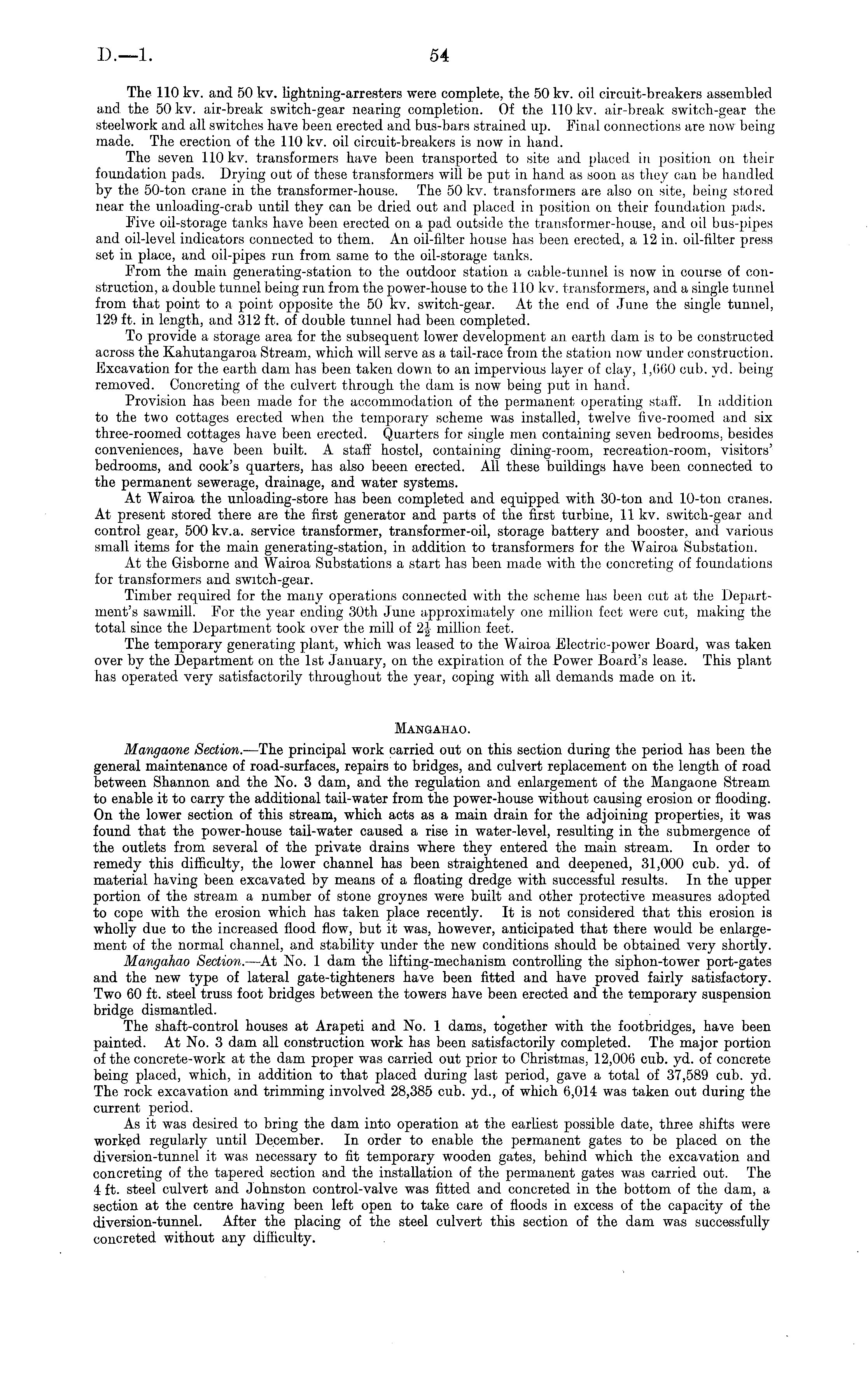 The 110 kv. and 50 kv. lightning-arresters were complete, the 50 kv. oil circuit-breakers assembled and the 50 kv. air-break switch-gear Hearing completion. Of the 110 kv. air-break switch-gear the steelwork and all switches have been erected and bus-bars strained up. Final connections are now being made. The erection of the 110 kv. oil circuit-breakers is now in hand. The seven 110 kv. transformers have been transported to site and placed in position on their foundation pads. Drying out of those transformers will be put in hand as soon as they can be handled by the 50-ton crane in the transformer-house. The 50 kv. transformers are also on site, being stored near the unloading-crab until they can be dried out and placed in position on their foundation pads. Five oil-storage tanks have been erected on a pad outside the transformer-house, and oil bus-pipes and oil-level indicators connected to them. An oil-filter house has been erected, al2 in. oil-filter press set in place, and. oil-pipes run from same to the oil-storage tanks. From the main generating-station to the outdoor station a cable-tunnel is now in course of construction, a double tunnel being run from the power-house to the 110 kv. transformers, and a single tunnel from that point to a point opposite the 50 kv. switch-gear. At the end of June the single tunnel, 129 ft. in length, and 312 ft. of double tunnel had been completed. To provide a storage area for the subsequent lower development an earth dam is to be constructed across the Kahutangaroa Stream, which will serve as a tail-race from the station now under construction. Excavation for the earth, dam has been taken down to an impervious layer of clay, 1,660 cub. yd. being removed. Concreting of the culvert through the dam is now being put in hand. Provision has been made for the accommodation of the permanent operating staff. In addition to the two cottages erected when the temporary scheme was installed, twelve five-roomed and six three-roomed cottages have been erected. Quarters for single men containing seven bedrooms, besides conveniences, have been built. A staff hostel, containing dining-room, recreation-room, visitors' bedrooms, and cook's quarters, has also beeen erected. All these buildings have been connected to the permanent sewerage, drainage, and water systems. At Wairoa the unloading-store has been completed and equipped with 30-ton and 10-ton cranes. At present stored there are the first generator and parts of the first turbine, 11 kv. switch-gear and control gear, 500 kv.a. service transformer, transformer-oil, storage battery and booster, and various small items for the main generating-station, in addition to transformers for the Wairoa Substation. At the Gisborne and Wairoa Substations a start has been made with the concreting of foundations for transformers and switch-gear. Timber required for the many operations connected with the scheme has been out at the Department's sawmill. For the year ending 30th June approximately one million feet were cut, making the total since the Department took over the mill of 2|- million feet. The temporary generating plant, which was leased to the Wairoa Electric-power Board, was taken over by the Department on the Ist January, on the expiration of the Power Board's lease. This plant has operated very satisfactorily throughout the year, coping with all demands made on it. Mangahao. Mangaone Section. —The principal work carried out on this section during the period has been the general maintenance of road-surfaces, repairs to bridges, and culvert replacement on the length of road between Shannon and the No. 3 dam, and the regulation and enlargement of the Mangaone Stream to enable it to carry the additional tail-water from the power-house without causing erosion or flooding. On the lower section of this stream, which acts as a main drain for the adjoining properties, it was found that the power-house tail-water caused a rise in water-level, resulting in the submergence of the outlets from several of the private drains where they entered the main stream. In order to remedy this difficulty, the lower channel has been straightened and deepened, 31,000 cub. yd. of material having been excavated by means of a floating dredge with successful results. In the upper portion of the stream a number of stone groynes were built and other protective measures adopted to cope with the erosion which has taken place recently. It is not considered that this erosion is wholly due to the increased flood flow, but it was, however, anticipated that there would be enlargement of the normal channel, and stability under the new conditions should be obtained very shortly. Mangahao Section. —At No. 1 dam the lifting-mechanism controlling the siphon-tower port-gates and the new type of lateral gate-tighteners have been fitted and have proved fairly satisfactory. Two 60 ft. steel truss foot bridges between the towers have been erected and the temporary suspension bridge dismantled. The shaft-control houses at Arapeti and No. 1 dams, together with the footbridges, have been painted. At No. 3 dam all construction work has been satisfactorily completed. The major portion of the concrete-work at the dam proper was carried out prior to Christmas, 12,006 cub. yd. of concrete being placed, which, in addition to that placed during last period, gave a total of 37,589 cub. yd. The rock excavation and trimming involved 28,385 cub. yd., of which 6,014 was taken out during the current period. As it was desired to bring the dam into operation at the earliest possible date, three shifts were worked regularly until December. In order to enable the permanent gates to be placed on the diversion-tunnel it was necessary to fit temporary wooden gates, behind which the excavation and concreting of the tapered section and the installation of the permanent gates was carried out. The 4 ft. steel culvert and Johnston control-valve was fitted and concreted in the bottom of t