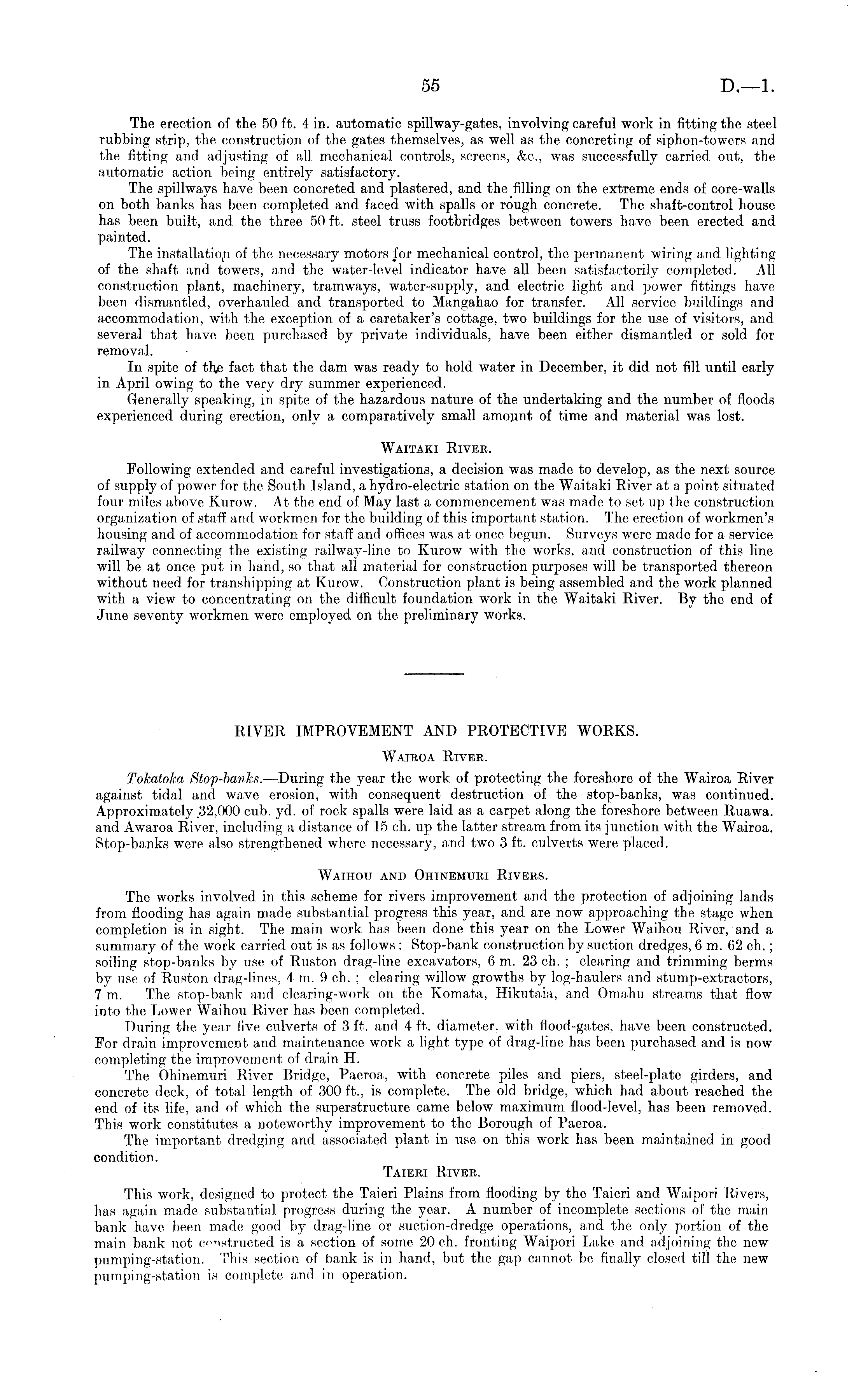The erection of the 50 ft. 4 in. automatic spillway-gates, involving careful work in fitting the steel rubbing strip, the construction of the gates themselves, as well as the concreting of siphon-towers and the fitting and adjusting of all mechanical, controls, screens, &c, was successfully carried, out, the automatic action being entirely satisfactory. The spillways have been concreted and plastered, and the filling on the extreme ends of core-walls on both banks has been completed and faced with spalls or rough concrete. The shaft-control house has been built, and the three 50 ft. steel truss footbridges between towers have been erected and painted. The installation of the necessary motors for mechanical control, the permanent wiring and lighting of the shaft and towers, and the water-level indicator have all been satisfactorily completed. All construction plant, machinery, tramways, water-supply, and electric light and power fittings have been dismantled, overhauled and transported to Mangahao for transfer. All service buildings and accommodation, with the exception of a, caretaker's cottage, two buildings for the use of visitors, and. several that have been purchased by private, individuals, have been either dismantled or sold for removal. In spite of th,e fact that the dam was ready to hold water in December, it did not fill until early in April owing to the very dry summer experienced. Generally speaking, in spite of the hazardous nature of the undertaking and the number of floods experienced during erection, only a comparatively small amount of time and material was lost. Waitaki River. Following extended and careful investigations, a decision was made to develop, as the next source of supply of power for the South Island, a hydro-electric station on the Waitaki River at a point situated four miles above Kurow. At the end of May last a commencement was made to set up the construction organization of staff and workmen for the building of this important station. The erection of workmen's housing and of accommodation for staff and offices was at once begun. Surveys were made for a service railway connecting the existing railway-line to Kurow with the works, and construction of this line will be at once put in hand, so that all material for construction purposes will be transported thereon without need for transhipping at Kurow. Construction plant is being assembled and the work planned with a view to concentrating on the difficult foundation work in the Waitaki River. By the end of June seventy workmen were employed on the preliminary works. RIVER IMPROVEMENT AND PROTECTIVE WORKS. Wairoa River. Tokatoka Stop-banks. —During the year the work of protecting the foreshore of the Wairoa River against tidal and wave erosion, with consequent destruction of the stop-banks, was continued. Approximately 32,000 cub. yd. of rock spalls were laid as a carpet along the foreshore between Ruawa. and Awaroa River, including a distance of 15 oh. up the latter stream from its junction with the Wairoa. Stop-banks were also strengthened where necessary, and two 3 ft. culverts were placed. Waihou and Ohinemuri Rivers. The works involved in this scheme for rivers improvement and the protection of adjoining lands from flooding has again, made substantial progress this year, and are now approaching the stage when completion is in sight. The main work has been done this year on the Lower Waihou River, and a summary of the work carried out is as follows : Stop-bank construction by suction dredges, 6 m. 62 eh.; soiling stop-banks by use of Ruston drag-line excavators, 6 m. 23 eh. ; clearing and trimming berms by use of Ruston, drag-lines, 4 m. 9 eh. ; clearing willow growths by log-haulers and stump-extractors, 7m. The stop-bank and clearing-work on the Komata, Hikutaia, and Omahu streams that flow into the Lower Waihou River has been completed. During the year five culverts of 3 ft. and 4 ft. diameter, with flood-gates, have been constructed. For drain improvement and maintenance work a light type of drag-line has been purchased and is now completing the improvement of drain H. The Ohinemuri River Bridge, Paeroa, with concrete piles and piers, steel-plate girders, and concrete deck, of total length of 300 ft., is complete. The old bridge, which had about reached the end of its life, and of which the superstructure came below maximum flood-level, has been removed. This work constitutes a noteworthy improvement to the Borough of Paeroa. The important dredging and associated plant in use on this work has been maintained, in good condition. Tateri River. This work, designed to protect the Taieri Plains from flooding by the Taieri and Waipori Rivers, has again made substantial progress during the year. A number of incomplete sections of the main bank have been made good by drag-line or suction-dredge operations, and the only portion of the main bank not constructed is a section of some 20 eh. fronting Waipori Lake and adjoining the new pumping-station. This section of bank is in hand, but the gap cannot be finally closed till the new pumping-station is complete and in operation.