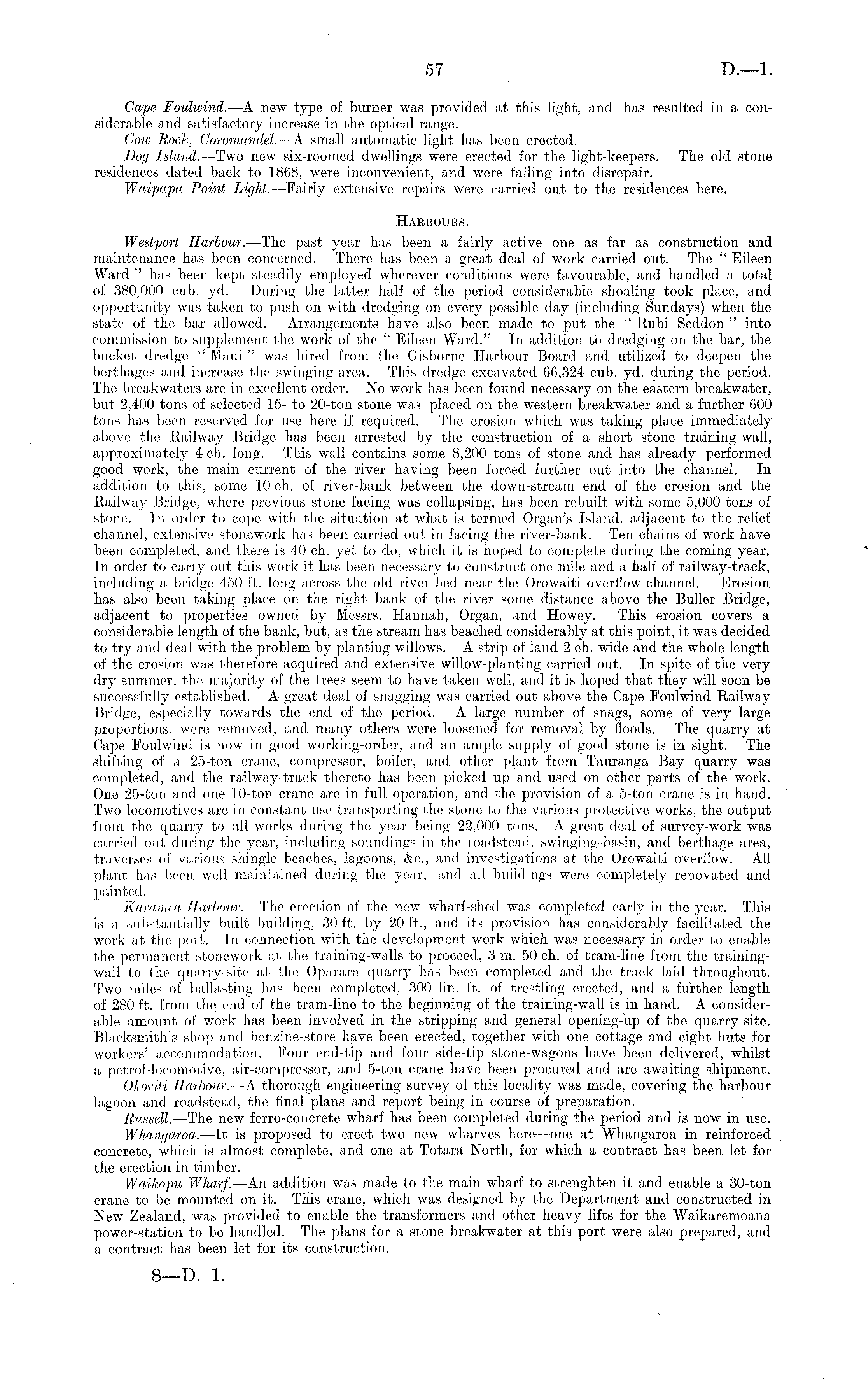 Cape Foulwind. —A new type of burner was provided at this light, and has resulted in a considerable and satisfactory increase in the optical range. Cow Rock, Coromandel. —A small automatic light has been erected. Dog Island. —Two new six-roomed dwellings were erected for the light-keepers. The old stone residences dated back to 1868, were inconvenient, and were falling into disrepair. Waipapa Point Light. —Fairly extensive repairs were carried out to the residences hero. Harbours. Westport Harbour. —The past year has been a fairly active one as far as construction and maintenance has been concerned. There has been a great deal of work carried out. The " Eileen Ward " has been kept steadily employed wherever conditions were favourable, and handled a total of 380,000 cub. yd. During the latter half of the period considerable shoaling took place, and opportunity was taken to push on with dredging on every possible day (including Sundays) when the state of the bar allowed. Arrangements have also been made to put the " Rubi Seddon " into commission to supplement the work of the " Eileen Ward." In addition to dredging on the bar, the bucket dredge " Maui " was hired from the Gisborne Harbour Board and utilized to deepen the berthages and increase the swinging-area. This dredge excavated 66,324 cub. yd. during the period. The breakwaters are in excellent order. No work has been found necessary on the eastern breakwater, but 2,400 tons of selected 15- to 20-ton stone was placed on the western, breakwater and a further 600 tons has been reserved for use here if required. The erosion which was taking pla.ee immediately above the Railway Bridge has been arrested by the construction of a short stone training-wall, approximately 4 eh. long. This wall contains some 8,200 tons of stone and has already performed good work, the main current of the river having been forced further out into the channel. In addition to this, some 10 eh. of river-bank between the down-stream end of the erosion and the Railway Bridge, where previous stone facing was collapsing, has been rebuilt with some. 5,000 tons of stone. In order to cope with the situation at what is termed Organ's Island, adjacent to the relief channel, extensive stonework has been carried out in facing the river-bank. Ten chains of work have been completed, and there is 40 eh. yet to do, which it is hoped to complete during the coming year. In order to carry out this work it has been necessary to construct one miie and a half of railway-track, including a bridge 450 ft. long across the old river-bed near the Orowaiti overflow-channel. Erosion has also been taking place on the right bank of the river some distance above the Buller Bridge, adjacent to properties owned by Messrs. Hannah, Organ, and Howey. This erosion covers a considerable length of the bank, but, as the stream has beached considerably at this point, it was decided to try and deal with the problem by planting willows. A strip of land, 2 eh. wide and the whole length of the erosion was therefore acquired and extensive willow-planting carried out. In spite of the very dry summer, the majority of the trees seem to have taken well, and it is hoped that they will soon be successfully established. A great deal of snagging was carried out above the Cape Foulwind Railway Bridge, especially towards the end of the period. A large number of snags, some of very large proportions, were removed, and many others were loosened for removal by floods. The quarry at Cape Foulwind is now in good working-order, and an ample supply of good stone is in sight. The shifting of a 25-ton crane, compressor, boiler, and other plant from Tauranga Bay quarry was completed, and the railway-track thereto has been picked up and used on other parts of the work. One 25-ton and one 10-ton crane are in full operation, and the provision of a 5-ton crane is in hand. Two locomotives are in constant use transporting the stone to the various protective works, the output from the quarry to all works during the yea,r being 22,000 tons. A great deal of survey-work was carried out during the year, including soundings in the roadstead, swinging-basin, and berthage area, traverses of various shingle beaches, lagoons, &c, and investigations at the Orowaiti overflow. All plant has been well maintained during the year, and ail buildings were completely renovated and painted. Karamea Harbour. —The erection of the new wharf-shed was completed early in the year. This is a, substantially built building, 30 ft. by 20 ft., and its provision has considerably facilitated the work sit the port. In connection with the development work which was necessary in order to enable the permanent stonework at the training-walls to proceed, 3 m. 50 eh. of tram-line from the trainingwall to the quarry-site ■at the Oparara quarry has been completed and the track laid throughout. Two miles of ballasting has been completed, 300 lin. ft. of trestling erected, and a further length of 280 ft. from the end of the tram-line to the beginning of the training-wall is in hand. A considerable amount of work has been involved in the stripping and general opening-up of the quarry-site. Blacksmith's shop and benzine-store have been erected, together with one cottage and eight huts for workers' accommodation. Four end-tip and four side-tip stone-wagons have been delivered, whilst a petrol-locomotive, air-compressor, and 5-ton crane have been procured and are awaiting shipment. Okoriti Harbour. —A thorough engineering survey of this locality was made, covering the harbour lagoon and roadstead, the final plans and report being in course of preparation. Russell. —The new ferro-concrete wharf has been completed, during the period and is now in. use. Whangaroa. —lt is proposed to erect two new wharves here —one at Whangaroa in reinforced concrete, which is almost complete, and one at Totara North, for which a contract has been let for the erection in timber. Wa