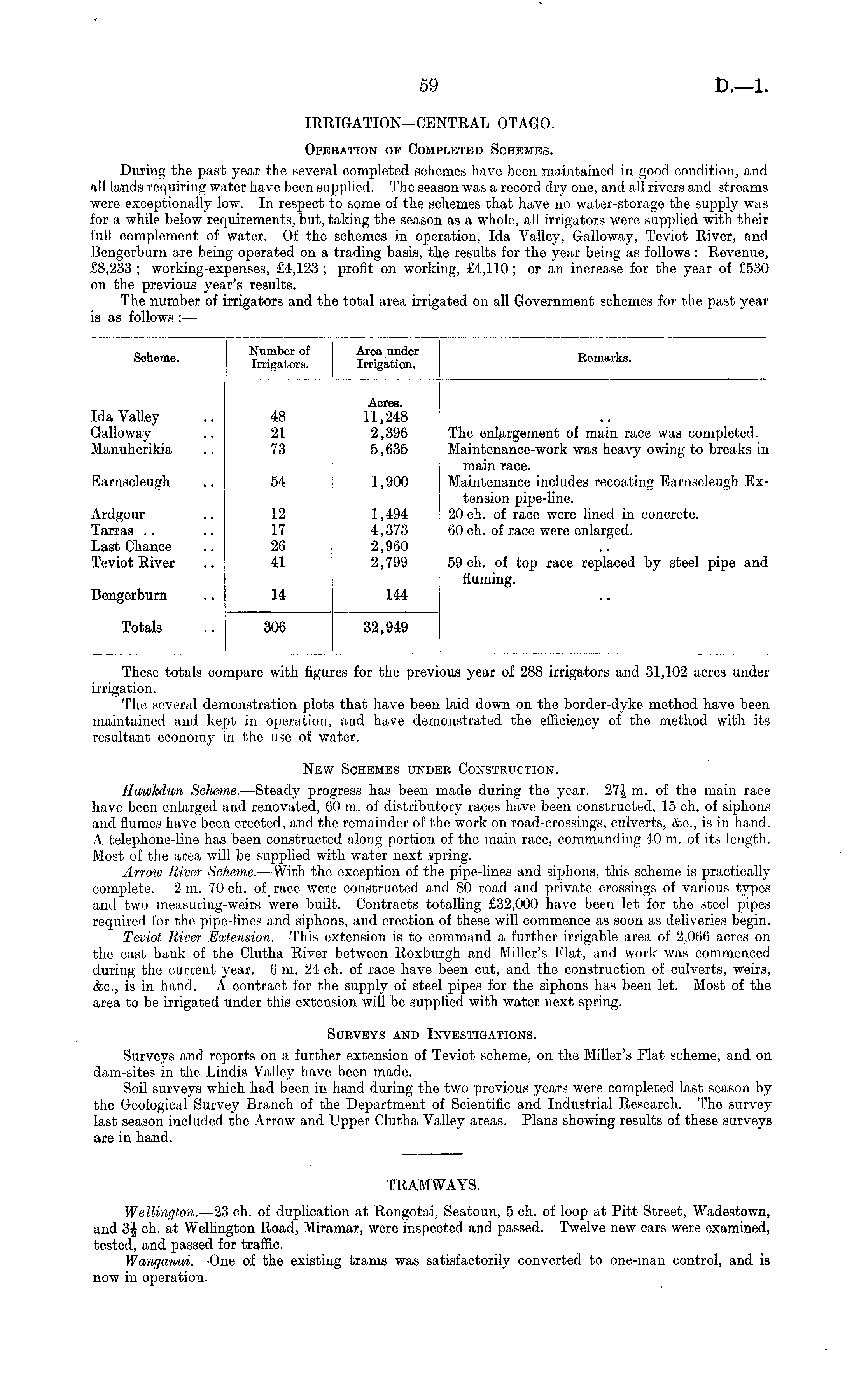 IRRIGATION-CENTRAL OTAGO. Operation op Completed Schemes. During the past year the several completed schemes have been maintained in good condition, and all hinds requiring water have been supplied. The season was a record, dry one, and. all rivers and streams were exceptionally low. In respect to some of the schemes that have no water-storage the supply was for a while below requirements, but, taking the season as a whole, all irrigators were supplied with their full complement of water. Of the schemes in operation, Ida Valley, Galloway, Teviot River, and Bengerburn are being operated on a trading basis, the results for the year being as follows : Revenue, £8,233 ; working-expenses, £4,123 ; profit on working, £4,110; or an increase for the year of £530 on the previous year's results. The number of irrigators and the total area irrigated on all Government schemes for the past year is as follows :—