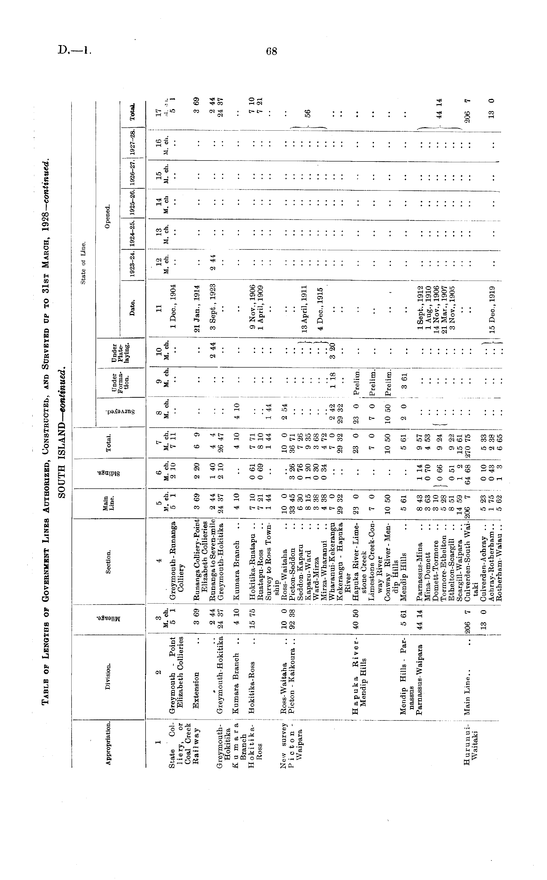 Table of Lengths of Government Lines Authorized, Constructed, and Surveyed up to 31st March, 1928— continued. SOUTH ISLAND— continued.