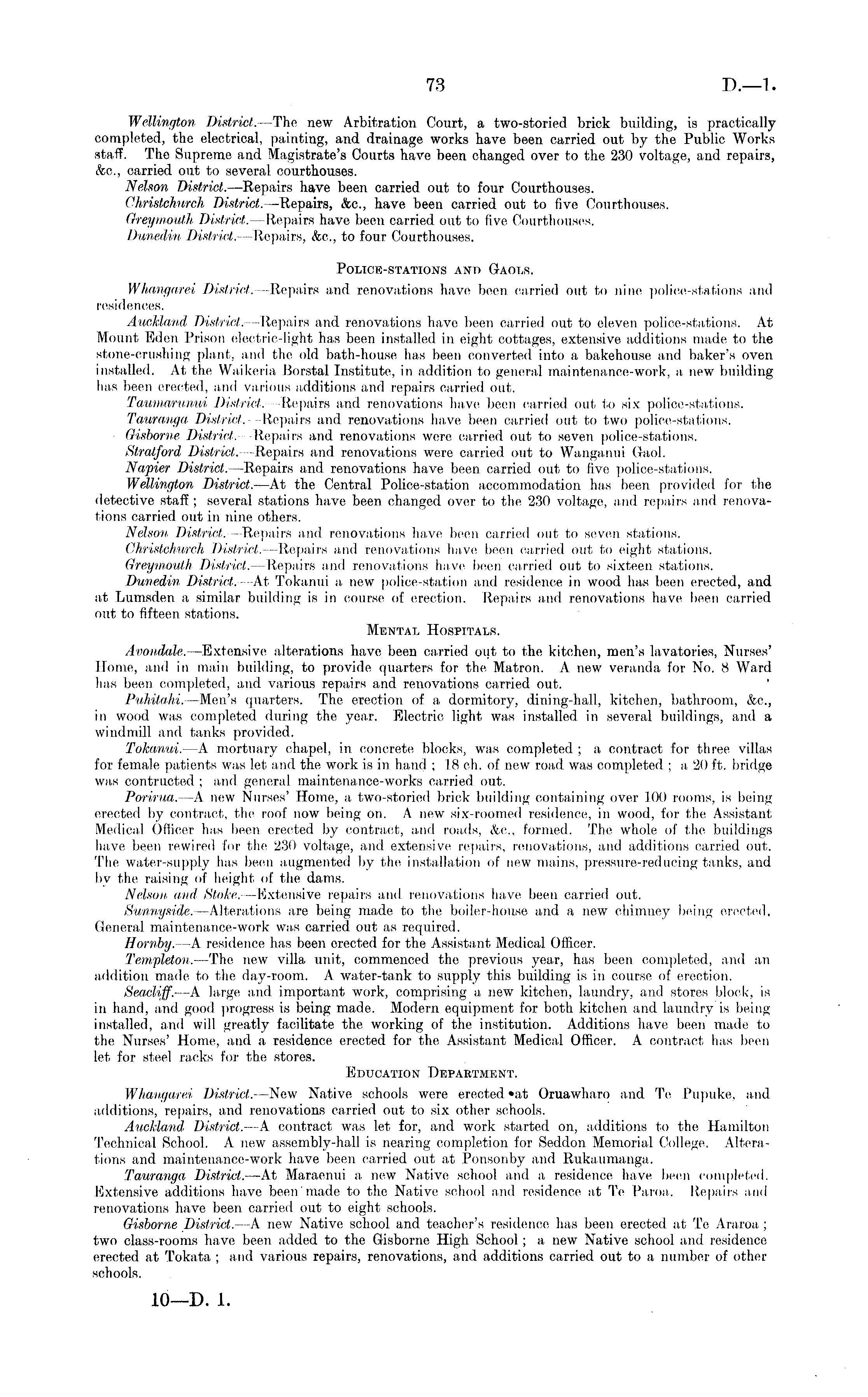 Wellington District. —The new Arbitration Court, a two-storied brick building, is practically completed, the electrical, painting, and drainage works have been carried out by the Public Works staff. The Supreme and Magistrate's Courts have been changed over to the 230 voltage, and repairs, &c, carried out to several, courthouses. Nelson District. —Repairs have been carried out to four Courthouses. Christchurch District. —Repairs, &c, have been carried out to five Courthouses. Greyinouth District. —Repairs have been carried out to five Courthouses. Dunedin District. Repairs, &c, to four Courthouses. Police-stations and Gaols. Whangarei District. —Repairs and renovations have been, carried out to nine police-stations and residences. Auckland District. -Repairs and renovations have been carried out to eleven police-stations, At Mount Eden Prison electric-light has been installed in eight cottages, extensive additions nia.de to the stone-crushing plant, and the old bath-house has been converted into a bakehouse and baker's oven installed. At the Waikeria Borstal Institute, in addition to general maintenance-work, a new building has been erected, and various additions and repairs carried out. Taumarunui District. -Repairs and renovations have been carried out to six police-stations. Tauraitga, District. - Repairs and renovations ha.ye been carried out to two police-stations. Gisborne District.- Repairs and renovations were carried out to seven police-stations. Stratford District. -Repairs and renovations were carried out to Wanganui Gaol. Napier District. —Repairs and. renovations have been, carried out to five police-stations. Wellington District. —At the Central Police-station accommodation has been provided for the detective staff ; several stations have been changed over to the 230 voltage, and repairs and renovations carried out in nine others. Nelson District. —Repairs and renovations have been carried out to seven stations. Christchurch District. —Repairs and renovations have been carried out to eight stations. Greymouth District. — Repairs and renovations have been carried out to sixteen stations. Dunedin District. —At Tokanui a new police-station and residence in wood has been erected, and at Numsden a, similar building is in course of erection. Repairs and renovations have been carried out to fifteen stations. Mental Hospitals. Avoudale. —Extensive alterations have been carried out to the kitchen, men's lavatories, Nurses' Home, anil in main building, to provide quarters for the. Matron. A new veranda for No. 8 Ward has been completed, and various repairs and renovations carried out. Puhitahi. —Men's quarters. The erection of a, dormitory, dining-hall, kitchen, bathroom, &c, in wood was completed during the year. Electric light was installed in several buildings, and a windmill, and tanks provided. Tokanui. —A mortuary chapel, in concrete blocks, was completed ; a contract for three villas for female patients was let and the work is in hand ; 18 eh. of new road, was completed ; a, 20 ft. bridge was contracted ; and general maintenance-works carried out. Porirua. —A new Nurses' Home, a. two-storied brick building containing over 100 rooms, is being erected by contract, the roof now being on. A new six-roomed residence, in wood, for the Assistant Medical Officer has been erected by contract, and roads, &c, formed. The whole of the, buildings have been rewired for the 230 voltage, and extensive repairs, renovations, and additions carried out. The water-supply has been augmented by the installation of new mains, pressure-reducing tanks, and by the raising of height of the dams. Nelson and Stoke. —Extensive repairs and renovations have been carried out. Sunnyside. —Alterations are being made to the boiler house and a new chimney being erected. General maintenance-work wa.s carried out as required. Hornby. —A residence has been erected for the Assistant Medical Officer. Templeton. —The new villa, unit, commenced the previous year, has been completed, and an addition made, to the day-room. A water-tank to supply this building is in course of erection. Seacliff. -A large and. important work, comprising a, new kitchen, laundry, and stores block, is in hand, and good progress is being made. Modern equipment for both kitchen and laundry is being installed, and will greatly facilitate the working of the institution. Additions have been made to the Nurses' Home, and a residence erected for the Assistant Medical Officer. A contract has been let for steel racks for the stores. Education Department. Whangarei District. —New Native schools were erected »at Oruawharo and Te I'upuke, and additions, repairs, and renovations carried out to six other schools. Auckland, District. —A contract was let for, and work started on, additions to the Hamilton Technical School. A new assembly-hall is nearing completion for Seddon Memorial College. Alterations and maintenance-work have been carried out at Ponsonby and Rukaumanga. Tauranga, District. —At Maraenui a new Native school and a residence have been completed. Extensive additions have been'made to the Native school and residence at Te Paroa, Repairs and renovations have been carried out to eight schools. Gisborne District. —A new Native school and teacher's residence has been erected at Te Araroa ; two class-rooms have been added to the Gisborne High School ; a, new Native school and residence erected at Tokata ; and various repairs, renovations, and additions carried out to a number of other schools.