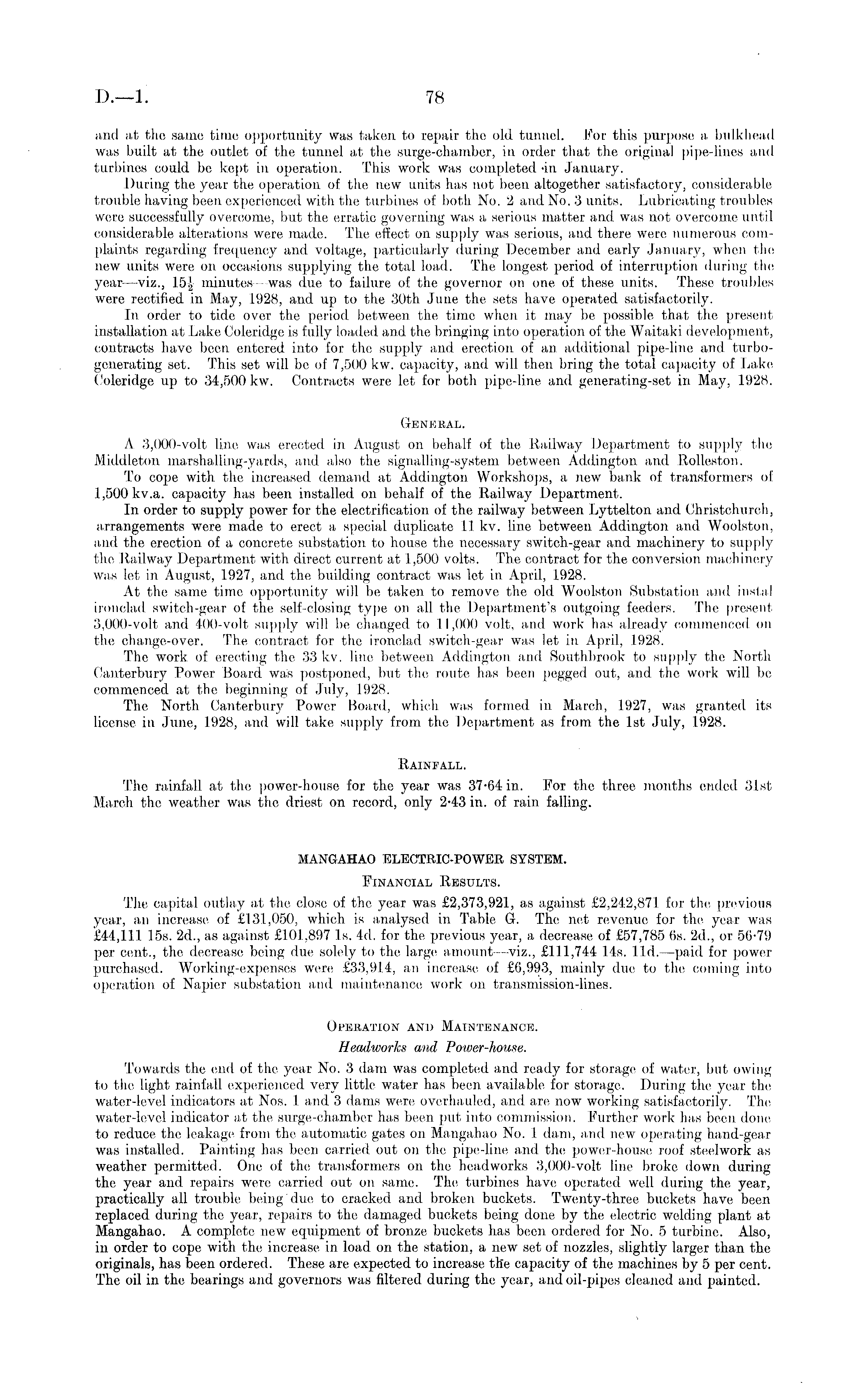 and at the same time opportunity was taken to repair the old tunnel. For this purpose a, bulkhead was built at the outlet oi the tunnel at the surge-chamber, in order that the original pipe-lines and turbines could be kept in operation. This work was completed -in January. During the year the operation of the new units has not been altogether satisfactory, considerable trouble having been experienced with the turbines of both. No. 2 and No. 3 units. Lubricating troubles were successfully overcome, but the erratic governing was a. serious matter and was not overcome until considerable alterations were made. The effect on supply was serious, and there were numerous complaints regarding frequency and voltage, particularly during December and early January, when the new units were on occasions supplying the total load. The longest period of interruption during the year—viz., 15J minutes -was due to failure of the governor on one of these units. These troubles were rectified in May, 1928, and up to the 30th June the sets have operated satisfactorily. In order to tide over the period between the time when it may be possible that the present installation at Lake Coleridge is fully loaded and the bringing into operation of the Waitaki development, contracts have been entered into for the supply and erection of an additional pipe-line and turbogenerating set. This set will be of 7,500 kw. capacity, and will then bring the total capacity of Lake Coleridge up to 34,500 kw. Contracts were let for both pipe-line and generating-set in May, 1928. General. A 3,000-volt lino was erected in August on behalf of the Railway Department to supply the Middleton marshalling-yards, and also the signalling-system between Addington and RoUeston. To cope with, the increased demand, at Addington Workshops, a new bank of transformers of 1,500 kv.a. capacity has been installed on behalf of the Railway Department. In order to supply power for the electrification of the railway between Lyttelton and Christchurch, arrangements were made to erect a special duplicate 11 kv. line between. Addington and Woolston, and the erection of a, concrete substation to house the. necessary switch-gear and machinery to supply the Railway Department with, direct current at 1,500 volts. The contract for the conversion machinery was let in August, 1927, and the building contract was let in April, 1928. At the same time opportunity will be taken to remove the old Woolston Substation and instal ironclad switch-gear of the self-closing type on all the Department's outgoing feeders. The present 3,000-volt and 400-volt supply will be changed to 11,000 volt, and work has already commenced on the change-over. The contract for the ironclad switch-gear was let in April, 1928. The work of erecting the 33 kv. line between Addington and Southbrook to supply the North Canterbury Power Board was postponed, but the route has been pegged out, and the work will be commenced at the beginning of July, 1928. The North Canterbury Power Board, which was formed in March, 1927, was granted its license, in June, 1928, and will take supply from the Department as from the Ist July, 1928. Rainfall. The rainfall at tin; power-house for the year was 37-64 in. For the three months ended 31st March the weather was the driest on record, only 2-43 in. of rain falling. MANGAHAO ELECTRIC-POWER SYSTEM. Financial Results. The capital outlay at, the close of the year was £2,373,921, as against £2,242,871 for the previous year, an increase of £131,050, which is analysed in Table G. The net revenue for the year was £44,111 15s. 2d., as against £101,897 Is. 4d. for'the previous year, a. decrease of £57,785 (is. 2d., or 56-79 per cent., the decrease being due solely to the large amount-—viz., £111,744 14s. lid. —paid for power purchased. Working-expenses were £33,914, an increase of £6,993, mainly due to the coming into operation of Napier substation and maintenance work on transmission-lines. Operation and Maintenance. Headworks and Power-house. Towards the end of the year No. 3 dam was completed and ready for storage of water, but owing to the light rainfall experienced very little water has been available for storage. During the year the water-level indicators at Nos. 1 and 3 dams were overhauled, and are now working satisfactorily. The water-level indicator at the surge-chamber has been put into commission. Further work has been done to reduce the leakage from the automatic gates on Mangahao No. 1. dam, and new operating hand-gear was installed. Painting has been carried, out on the pipe-line and the power-house roof steelwork as weather permitted. One of the transformers on the headworks 3,000-volt line broke down during the year and repairs were carried out on same. The turbines have operated well during the year, practically all trouble being due to cracked and broken buckets. Twenty-three buckets have been replaced, during the year, repairs to the damaged buckets being done by the electric welding plant at Mangahao. A complete new equipment of bronze buckets has been ordered for No. 5 turbine. Also, in order to cope with the increase, in load on the station, a new set of nozzles, slightly larger than the originals, has been ordered. These are expected to increase the capacity of the machines by 5 per cent. The oil in the bearings and governors was filtered during the year, and oil-pipes cleaned and painted.