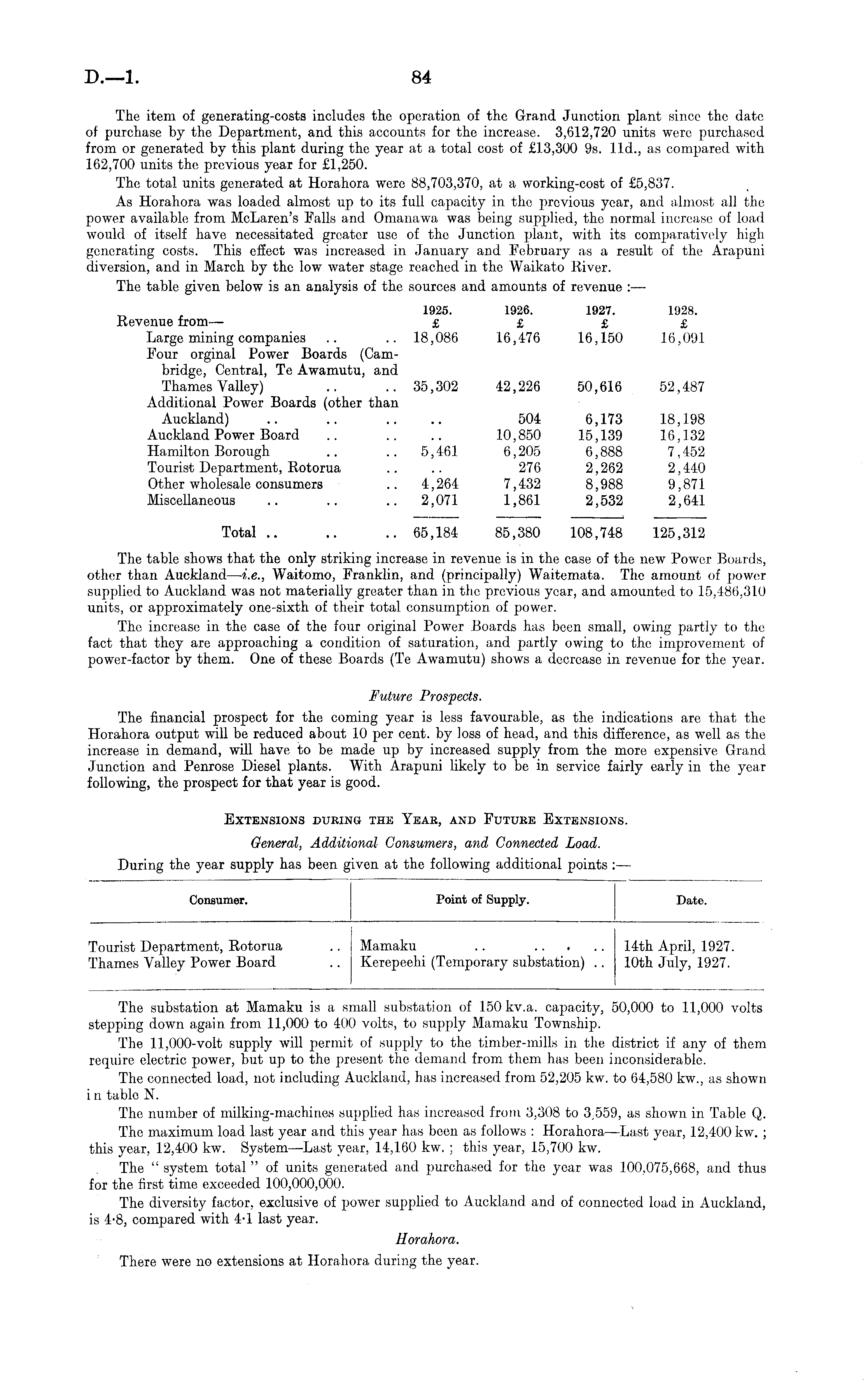 The item of generating-costs includes the operation of the Grand Junction plant since the date of purchase by the Department, and this accounts for the increase. 3,612,720 units were purchased from or generated by this plant during the year at a total cost of £13,300 9s. lid., as compared with 162,700 units the previous year for £1,250. The total units generated at Horahora were 88,703,370, at a working-cost of £5,837. As Horahora was loaded almost up to its full capacity in the previous year, and almost all the power available from McLaren's Falls and Omanawa was being supplied, the normal increase of load would of itself have necessitated greater use of the Junction, plant, with its comparatively high generating costs. This effect was increased in January and February as a result of the Arapuni diversion, and in March by the low water stage reached in the Waikato River. The table given below is an analysis of the sources and amounts of revenue : — 1925. 1926. 1927. 1928. Revenue from— £ £ £ £ Large mining companies .. .. 18,086 16,476 16,150 16,091 Four orginal Power Boards (Cambridge, Central, Te Awamutu, and Thames Valley) .. .. 35,302 42,226 50,616 52,487 Additional Power Boards (other than Auckland) .. .. .. .. 504 6,173 18,198 Auckland Power Board .. .. .. 10,850 15,139 16,132 Hamilton Borough .. .. 5,461 6,205 6,888 7,452 Tourist Department, Rotorua .. .. 276 2,262 2,440 Other wholesale consumers .. 4,264 7,432 8,988 9,871 Miscellaneous .. .. .. 2,071 1,861 2,532 2,641 Total .. .. ..65,184 85,380 108,748 125,312 The table shows that the only striking increase in revenue is in the case of the new Power Boards, other than Auckland — i.e., Waitomo, Franklin, and (principally) Waitemata. The amount of power supplied to Auckland was not materially greater than in the previous year, and amounted to 15,486,310 units, or approximately one-sixth of their total consumption of power. The increase in the case of the four original Power Boards has been small, owing partly to the fact that they are approaching a condition of saturation, and partly owing to the improvement of power-factor by them. One of these Boards (Te Awamutu) shows a decrease in revenue for the year. Future Prospects. The financial prospect for the coming year is less favourable, as the indications are that the Horahora output will be reduced about 10 per cent, by loss of head, and this difference, as well as the increase in demand, will have to be made up by increased supply from the more expensive Grand. Junction and Penrose Diesel plants. With Arapuni likely to be in service fairly early in the year following, the prospect for that year is good. Extensions during the Year, and Future Extensions. General, Additional Consumers, and Connected Load. During the year supply has been given at the following additional points : —