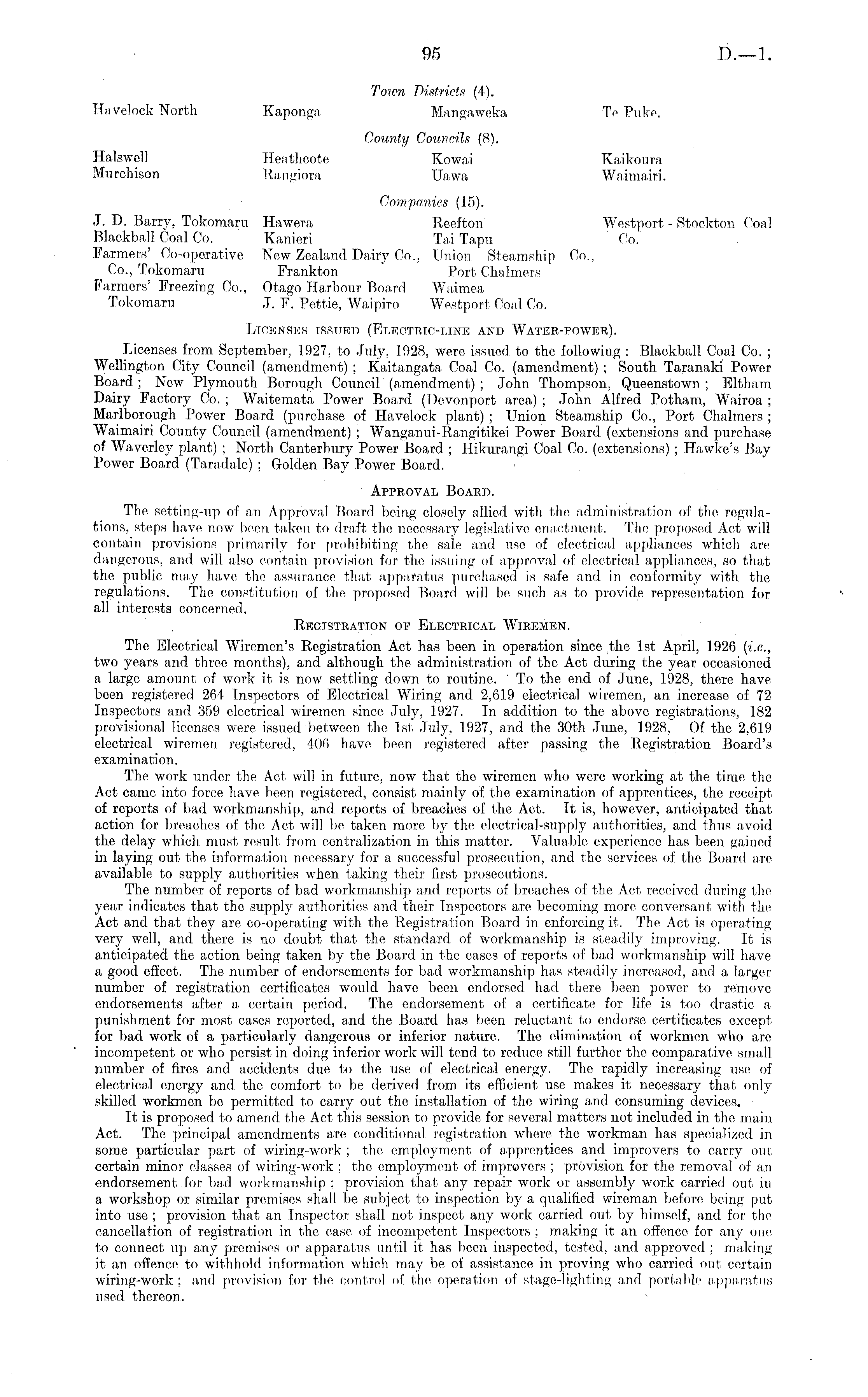 Town Districts (4). Havelock North Kaponga Mangaweka Te Puke. County Councils (8). Halswell Heathcote Kowai Kaikoura Murchison Rangiora Ua.wa Waimairi, Companies (15). J. D. Barry, Tokomaru Hawera Reefton Westport, - Stockton Coal Blackball Coal Co. Kanieri Tai Tapu Co. Farmers' Co-operative New Zealand D.airy Co., Union Steamship Co., Co., Tokomaru Frankton Port Chalmers Farmers' Freezing Co., Otago Harbour Board Waimea Tokomaru .1. F. Pettie, Waipiro Westport Coal Co. Licenses issued (Electrtc-line and Water-power). Licenses from September, 1927, to July, 1928, were issued to the following : Blackball Coal Co. ; Wellington City Council (amendment) ; Kaitangata Coal Co. (amendment) ; South Taranaki Power Board ; New Plymouth Borough Council (amendment) ; John Thompson, Queenstown ; Eltham Dairy Factory Co. ; Waitemata Power Board (Devonport area) ; John Alfred. Potham, Wairoa ; Marlborough Power Board (purchase of Havelock plant) ; Union Steamship Co., Port Chalmers ; Waimairi County Council (amendment) ; Wanganui-Rangitikei Power Board (extensions and purchase of Waverley plant) ; North Canterbury Power Board ; Hikurangi Coal Co. (extensions); Hawke's Bay Power Board (Taradale) ; Golden Bay Power Board. Approval Board. The setting-up of an Approval Board being closely allied with the administration of the regulations, steps have now been taken to draft the necessary legislative enactment. The proposed Act will contain provisions primarily for prohibiting the sale and use of electrical appliances which are dangerous, and will also contain provision for the issuing of approval of electrical appliances, so that the public may have the assurance that apparatus purchased is safe and in conformity with the regulations. The constitution of the proposed Board will be such as to provide representation for all interests concerned. B.egtstratton op Electrical Wtremen. The, Electrical Wiremen's Registration Act has been in operation since the Ist April, 1926 (i.e., two years and three months), and although the administration of the Act during the year occasioned a largo amount of work it is now settling down to routine. ' To the end of June, 1928, there have been registered 264 Inspectors of Electrical Wiring and 2,619 electrical wiremen, an increase of 72 Inspectors and 359 electrical wiremen since July, 1927. In addition to the above registrations, 182 provisional licenses were issued between the Ist July, 1927, and the 30th June, 1928, Of the 2,619 electrical wiremen registered, 406 have been registered after passing the Registration Board's examination. The work under the Act will in future, now that the wiremen who were working at the time the Act came into force have been registered, consist mainly of the examination of apprentices, the receipt of reports of bad workmanship, and reports of breaches of the Act. It is, however, anticipated that action for breaches of the Act will be taken more by the electrical-supply authorities, and thus avoid the delay which must result from centralization in this matter. Valuable experience has been gained in laying out the information necessary for a, successful prosecution, and the services of the Board are available to supply authorities when taking their first prosecutions. The number of reports of bad workmanship and reports of breaches of the Act received during the year indicates that the supply authorities and their Inspectors are becoming more conversant with the Act and that they are co-operating with the Registration Board in enforcing it. The Act is operating very well, and there is no doubt that the standard of workmanship is steadily improving. It is anticipated the. action being taken by the Board in the cases of reports of bad workmanship will have a good effect. The number of endorsements for bad workmanship has steadily increased, and. a larger number of registration certificates would have been endorsed had there been power to remove endorsements after a certain period. The endorsement of a certificate for life is too drastic a punishment for most cases reported, and. the Board has been reluctant to endorse certificates except for bad work of a particularly dangerous or inferior nature. The elimination of workmen who are incompetent or who persist in doing inferior work will tend to reduce still further the comparative small number of fires and accidents due to the use of electrical energy. The rapidly increasing use of electrical energy and the comfort to be derived from its efficient use makes it necessary that only skilled workmen be permitted to carry out the installation of the wiring and consuming devices. It is proposed to amend, the Act this session to provide for several matters not included in the main Act. The principal amendments are conditional registration where the workman, has specialized in some particular part of wiring-work ; the employment of apprentices and improvers to carry out certain minor classes of wiring-work ; the employment of improvers ; provision for the removal of an endorsement for bad workmanship : provision that any repair work or assembly work carried out in a, workshop or similar premises shall be subject to inspection by a qualified wireman before being put into use ; provision that an Inspector shall not inspect any work carried out by himself, and for the cancellation of registration in the case of incompetent Inspectors ; making it an offence for any one to connect up any premises or apparatus until it has been inspected, tested, and approved ; making it an offence to withhold information which may be of assistance in proving who carried out certain wiring-work; and provision for the control of the operation of stage-lighting and portable apparatus used thereon.