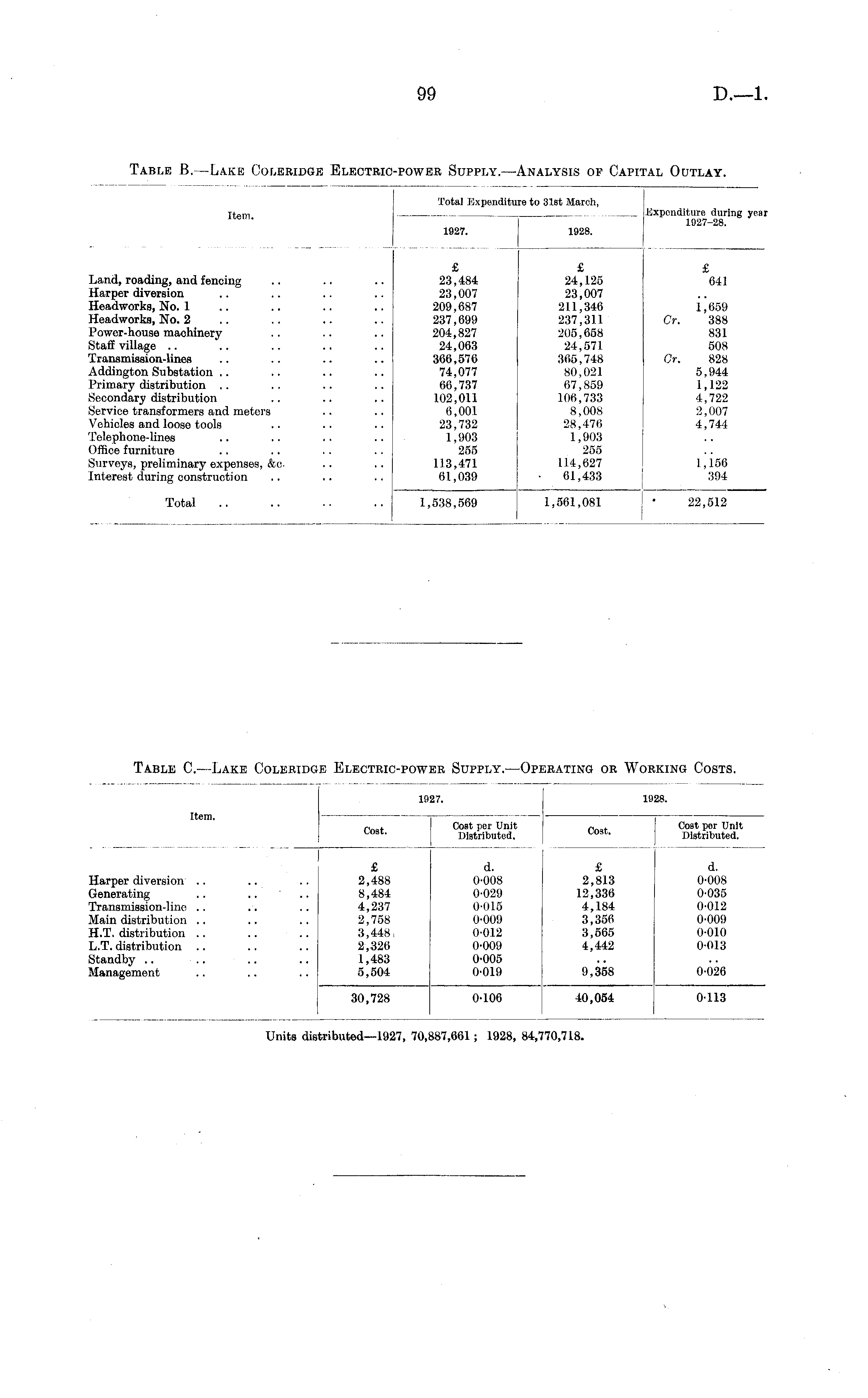 1927. 1928. Item. „ .. Cost per Unit -, t Cost per Unit Lost - Distributed. {Mau Distributed. £ d. £ d. Harper diversion .. .. .. 2,488 0-008 2,813 0-008 Generating .. .. .. 8,484 0-029 12,336 0-035 Transmission-line .. .-, .. 4,237 0-015 4,184 0-012 Main distribution .. .. .. 2,758 0-009 3,356 0-009 H.T. distribution .. .. .. 3,448, 0-012 3,565 0-010 L.T. distribution .. .. .. 2,326 0-009 4,442 0-013 Standby .. .. .. .. 1,483 0-005 Management .. .. .. 5,504 0-019 9,358 0-026 30,728 0-106 40,054 0-113 Units distributed—1927, 70,887,661 ; 1928, 84,770,718.