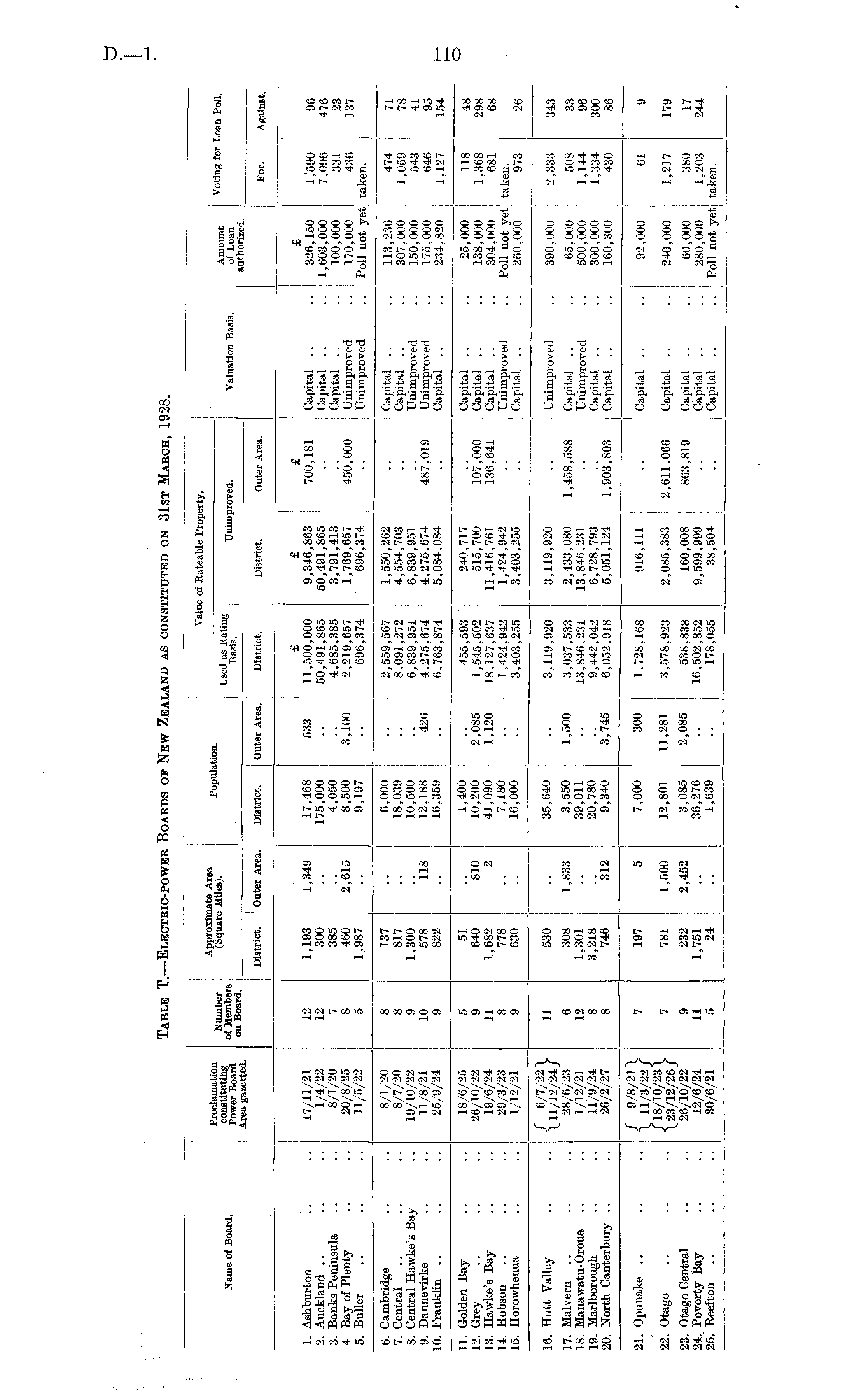 Value of Rateable Property. Numb « A <sq™ r rjffl£r Population. UsedasKatinK n Amount Voting lor Loan Poll. Name of Board. of Members bSsU Unimproved. Valuation Baals. of Loan Area gazetted. on Board - 1 authorized. District. Outer Area. District. Outer Area. District. District. Outer Area. For. Against - | £ £ £ £ 1. Aahburton .. .. 17/11/21 12 1,193 1,349 17,468 533 11,500,000 9,346,863 700,181 Capital .. .. 326,150 1 590 96 2. Auckland .. .. .. 1/4/22 12 300 .. 175,000 .. 50,491,865 50,491,865 .. Capital .. .. 1,603,000 7 096 476 3. Banks Peninsula .. .. 8/1/20 7 385 .. 4,050 .. 4,685,385 3,791,413 .. Capital .. .. 100,000 331 23 4 Bay of Plenty .. .. 20/8/25 8 460 2,615 8,500 3,100 2,219,657 1,769,657 450,000 Unimproved .. 170,000 436 137 5. Buller .. .. .. 11/5/22 5 1,987 .. 9,197 .. 696,374 696,374 .. Unimproved .. Poll not yet taken. 6. Cambridge .. .. 8/1/20 8 137 .. 6,000 .. 2,559,567 1,550,262 .. i Capital .. .. 113,236 474 71 7. Central .. .. .. 8/7/20 8 817 .. 18,039 .. 8,091,272 4,554,703 .. Capital .. .. 307,000 1 059 78 8. Central Hawke's Bay .. 19/10/22 9 1,300 .. 10,500 .. 6,839,951 6,839,951 .. Unimproved .. 'o43 41 9. Dannevirke .. .. 11/8/21 10 578 118 12,188 426 4,275,674 4,275,674 487,019 Unimproved .. 175,000 646 95 10. Franklin .. .. .. 25/9/24 9 822 .. 16,359 .. 6,763,874 5,084,084 .. Capital .. .. 234 \820 1,127 154 11. Golden Bay .. .. 18/6/25 5 51 .. 1,400 .. 455,593 240,717 .. Capital .. .. 25.000 118 48 12. Grey .. .. .. 26/10/22 9 640 810 10,200 2,085 1,545,502 515,700 107,000 Capital .. .. 138,000 1 368 298 13. Hawke's Bay .. .. 19/6/24 11 1,682 2 41,090 1,120 18,127,637 11,416,761 136,641 Capital .. .. 304,000 681 68 14. Hobson .. .. .. 29/3/23 8 778 .. 7,180 .. 1,424,942 1,424,942 .. Unimproved .. Poll not yet taken. 15. Horowhenua .. .. 1/12/21 9 630 .. 16,000 .. 3,403,255 3,403,255 .. Capital .. .. 260,000 973 26 16. Hutt Valley .. .. {n/12/24}' 11 530 " 35,640 .. 3,119,920 3,119,920 .. Unimproved .. 390,000 2,333 343 17. Malvern .. .. .. 28/6/23 6 308 1,833 3,550 1,500 3,037,533 2,433,080 1,458,588 Capital .. .. 65,000 508 33 18. Manawatu-Oroua .. .. 1/12/21 12 1,301 .. 39,011 .. 13,846,231 13,846,231 .. Unimproved .. 500,000 1,144 96 19. Marlborough .. .. 11/9/24 8 3,218 .. 20,780 .. 9,442,042 6,728,793 .. Capital .. .. 300,000 1,334 300 20. North Canterbury .. .. 26/2/27 8 746 312 9,340 3,745 6,052,918 5,051,124 1,903,803 Capital .. .. 160,300 430 86 J. 1 : 21. Opunake .. .. { 11 3/22/ 7 197 5 7,000 300 1,728,168 916,111 .. Capital .. .. 92,000 61 9 22. Otago .. .. .. {23/12/2!!} 7 781 1,500 12,801 11,281 3,578,923 2,085,383 2,611,066 Capital .. .. 240,000 1,217 179 23. Otago Central .. .. 26/10/22 9 232 2,452 3,085 2,085 538,838 160,008 863,819 Capital .. .. 60,000 380 17 24. Poverty Bay .. .. 12/6/24 11 1,751 .. 36,276 .. 16,502,852 9,599,999 .. Capital .. .. 280,000 1,203 244 25. Reefton .. .. .. 30/6/21 5 24 .. 1,639 .. 178,055 38,504 .. Capital .. .. Poll not yet taken.