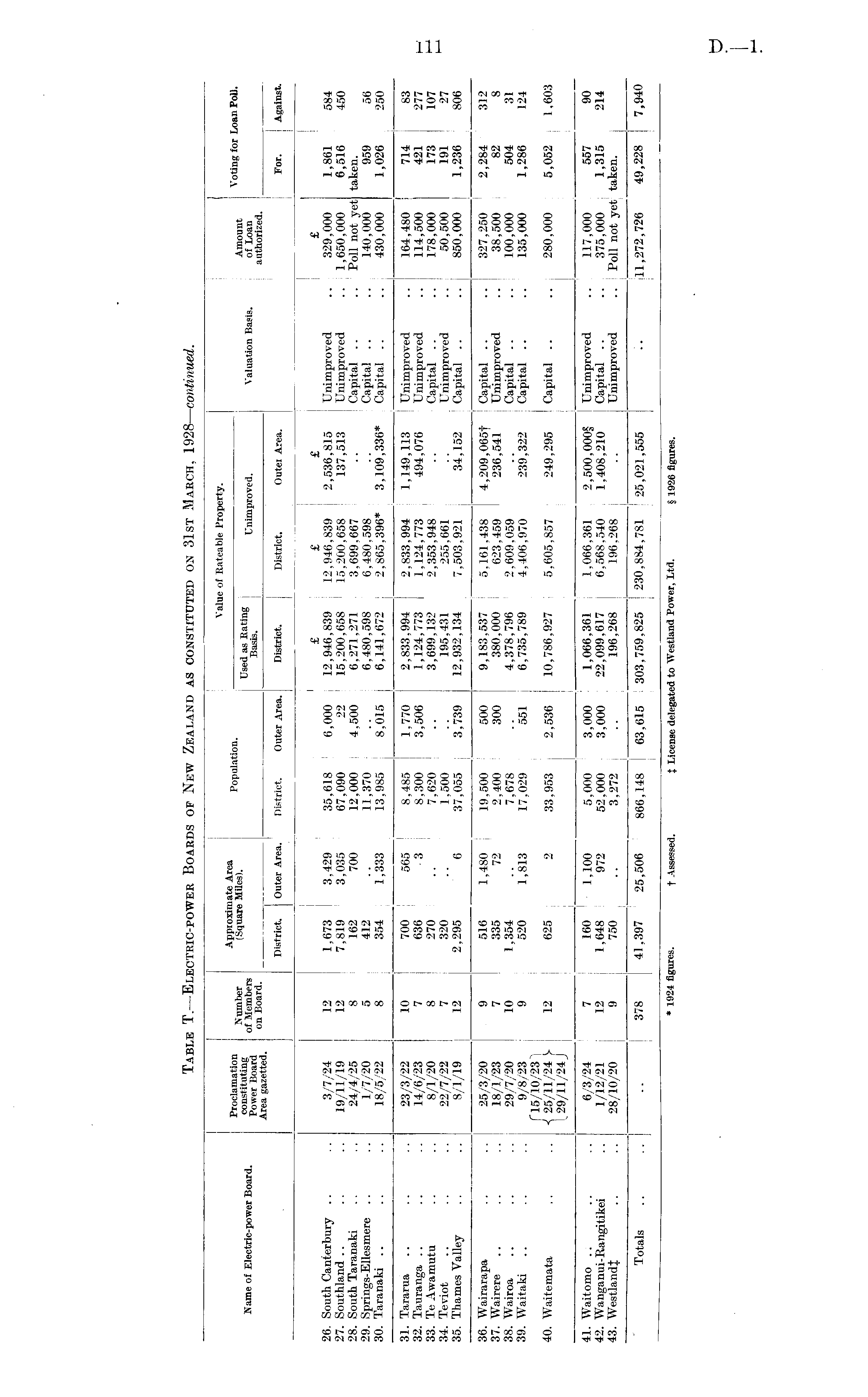 Value of Rateable Property. Number Popalation. - Amount Voting for Loan Poll. Name of Electric-power Board. SSL j>of Members j Unimproved. Valuation Basis. of Loan Ar"ettel ™ Board - j- — J authorized. District. Outer Area. District. Outer Area. District. District. Outei Area. For. 1 Against. I i j j j r i j j i | £ £ £ £ 26. South Canterbury .. .. 3/7/24 12 1,673 3,429 35,618 6,000 12,946,839 12,946,839 2,536,815 Unimproved .. 329,000 1,861 584 27. Southland .. .. .. 19/11/19 12 7,819 3,035 67,090 22 15,200,658 15,200,658 137,513 Unimproved .. 1,650,000 6,516 450 28. South Taranaki .. .. 24/4/25 8 162 700 12,000 4,500 6,271,271 3,699,667 .. Capital .. .. Poll not yet taken. 29. Springs-Ellesmere .. .. 1/7/20 5 412 .. 11,370 .. 6,480,598 6,480.598 .. Capital .. .. 140,000 959 56 30. Taranaki .. .. .. 18/5/22 8 354 1,333 13,985 8,015 6,141,672 j 2,865,396* 3,109,336* Capital .. .. 430,000 1,026 250 31. Tararua .. .. .. 23/3/22 10 700 565 ! 8,485 1,770 2,833,994 2,833.994 1,149,113 ! Unimproved .. j 164,480 ! 714 83 32. Tauranga .. .. .. 14/6/23 7 636 3 8,300 3,506 1,124,773 1,124,773 494,076 Unimproved .. 114,500 421 277 33. TeAwamutu .. .. 8/1/20 8 270 .. 7.620 .. 3,699,132 2,353,948 .. Capital .. .. 178,000 173 ! 107 34. Teviot .. .. .. 22/7/22 7 320 .. 1,500 .. 195,431 255,661 .. Unimproved .. 50,500 191 27 35. Thames Valley .. .. 8/1/19 12 2,295 6 37,055 3,739 12,932,134 7,503,921 34,152 Capital .. .. 850,000 ; 1,236 806 1 i 1 36. Wairarapa .. .. 25/3/20 9 516 1,480 19,500 500 9,183,537 5,161.438 I 4,209,065f Capital .. .. 327,250 2,284 312 37. Wairere .. .. .. 18/1/23 7 335 72 2,400 300 380,000 623,459 1 236,541 Unimproved .. 38,500 82 8 38. Wairoa .. .. .. 29/7/20 10 1,354 .. 7,678 .. 4,378,796 2,609,059 .. Capital .. .. 100,000 504 31 39. Waitaki .. .. .. 9/8/23 9 520 1,813 17,029 551 6,735,789 4,406,970 239,322 Capital .. .. 135,000 1,286 124 f15/10/23 40. Waitemata .. .. -J 25/11/24 )■ 12 625 2 33,953 2,536 10,786,927 5,605,857 249,295 Capital .. .. 280,000 5,052 1,603 !. 29/11/24 J 41. Waitomo .. .. .. 6/3/24 7 160 1,100 5,000 3,000 1,066.361 1,066,361 2,500,000§ Unimproved .. 117,000 557 90 42. Wanganui-Rangitikei .. 1/12/21 12 1,648 972 52,000 22,099,617 6,568,540 1,408,210 Capital .. .. 375,000 1,315 214 43. YVestlandl .. .. 28/10/20 9 750 .. 3,272 .. 196,268 196,268 .. Unimproved .. Poll not yet taken. Totals .. ..I .. 378 41.397 25,506 866,148 63,615 303,759,825 1230,884,781 25,021,555 .. ill,272, 726 49,228 7,940 I j * 1924 figures. t Assessed. J License delegated to Westland Power, Ltd. § 1926 figures.