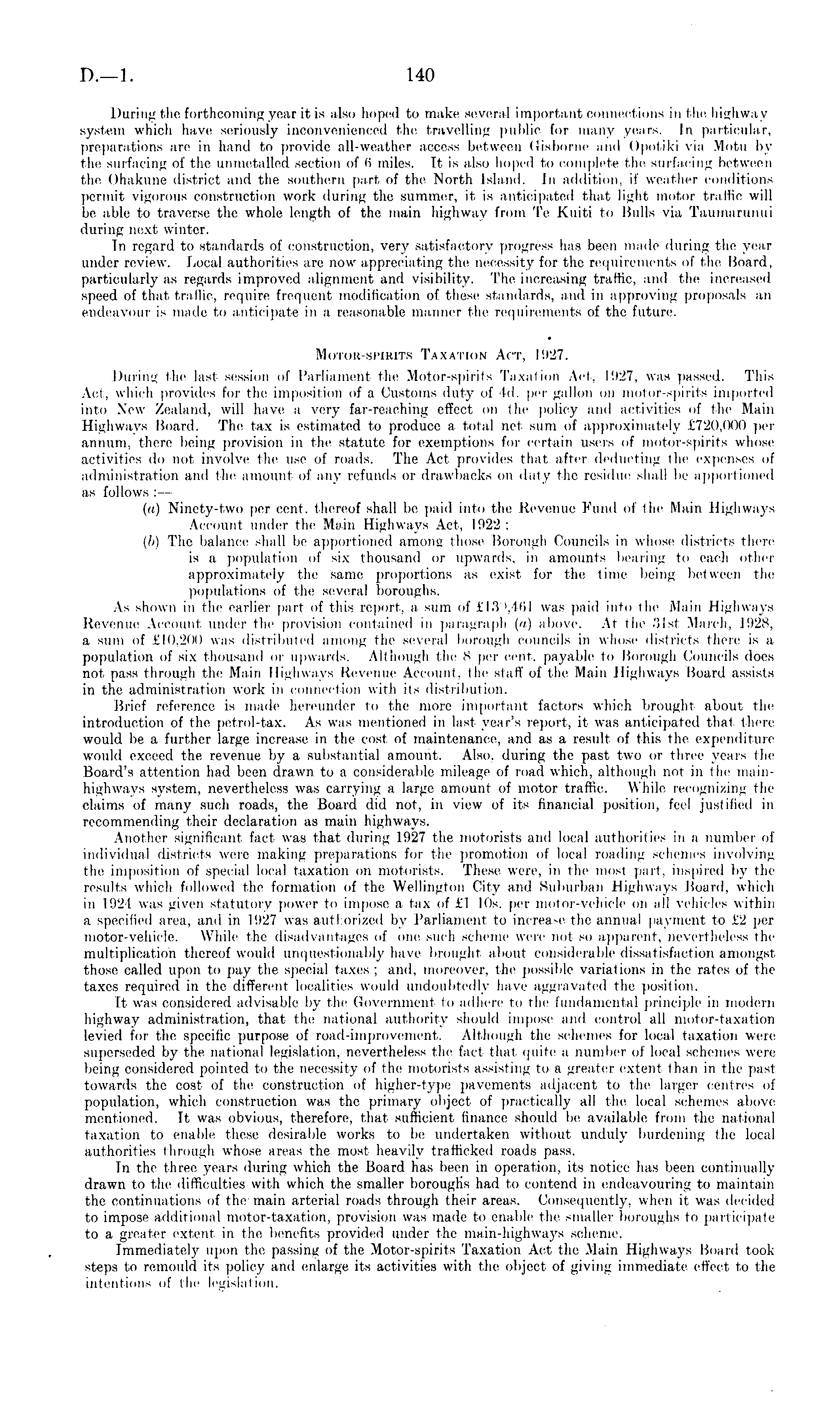 During the forthcoming year it is also hoped to make several important connections in the highway system which have seriously inconvenienced the travelling public for many years. In particular, preparations are in hand to provide all-weather access between Gisborne and Opotiki via Motu by the surfacing of the unmetalled section of 6 miles. It is also hoped to complete the surfacing between the Ohakune district and the southern part of the North Island. In addition, if weather conditions permit vigorous construction work during the summer, it is anticipated that light motor traffic will be able to traverse the whole length of the main highway from Te Kuiti to Bulls via Taumarunui during next winter. In regard to standards of construction, very satisfactory progress has been made during the year under review. Local authorities are now appreciating the necessity for the requirements of the Board, particularly as regards improved alignment and visibility. The increasing traffic, and the increased speed of that traffic, require frequent modification of these standards, and in approving proposals an endeavour is made to anticipate in a reasonable manner the requirements of the future. Motor-spirits Taxation Act, 1927. During the last session of Parliament the Motor-spirits Taxation Act, 1927, was passed. This Act, which provides for the imposition of a Customs duty of 4d. per gallon on motor-spirits imported into New Zealand, will have a very far-reaching effect on the policy and activities of the Main Highways Board. The tax is estimated to produce a total net sum of approximately £720,000 per annum, there being provision in the statute for exemptions for certain users of motor-spirits whose activities do not involve the use of roads. The Act provides that after deducting the expenses of administration and the amount of any refunds or drawbacks on duty the residue shall be apportioned as follows :— (a) Ninety-two per ccnt. thereof shall be paid into the Revenue Fund of the Main Highways Account under the Main Highways Act, 1922 ; (b) The balance shall be apportioned among those Borough Councils in whose districts there is a population of six thousand or upwards, in amounts bearing to each other approximately the same proportions as exist for the time being between the populations of the several boroughs. As shown in the earlier part of this report, a sum of £130,461 was paid into the Main Highways Revenue Account under the provision contained in paragraph (a) above. At the 31st March, 1928, a sum of £10,200 was distributed among the several borough councils in whose districts there is a population of six thousand or upwards. Although the 8 per cent, payable to Borough Councils does not pass through the Main Highways Revenue Account, the staff of the Main Highways Board assists in the administration work in connection with its distribution. Brief reference is made hereunder to the more important factors which brought about the introduction of the petrol-tax. As was mentioned in last year's report, it was anticipated that there would be a further large increase in the cost of maintenance, and as a result of this the expenditure would exceed the revenue by a substantial amount. Also, during the past two or three years the Board's attention had been drawn to a considerable mileage of road which, although not in the mainhighways system, nevertheless was carrying a large amount of motor traffic. While recognizing the claims of many such roads, the Board did not, in view of its financial position, feel justified in recommending their declaration as main highways. Another significant fact was that during 1927 the motorists and local authorities in a number of individual districts were making preparations for the promotion of local roading schemes involving the imposition of special local taxation on motorists. These were, in the most part, inspired by the results which followed the formation of the Wellington City and Suburban Highways Board, which in 1924 was given statutory power to impose a tax of £1 10s. per motor-vehicle on all vehicles within a specified area, and in 1927 was authorized by Parliament to increase the annual payment to £2 per motor-vehicle. While the disadvantages of one such scheme were not so apparent, nevertheless the multiplication thereof would unquestionably have brought about considerable dissatisfaction amongst those callcd upon to pay the special taxes ; and, moreover, the possible variations in the rates of the taxes required in the different localities would undoubtedly have aggravated the position. It was considered advisable by the Government to adhere to the fundamental principle in modern highway administration, that the national authority should impose and control all motor-taxation levied for the specific purpose of road-improvement. Although the schemes for local taxation were superseded by the national legislation, nevertheless the fact that quite a number of local schemes were being considered pointed to the necessity of the motorists assisting to a greater extent than in the past towards the cost of the construction of higher-type pavements adjacent to the larger centres of population, which construction was the primary object of practically all the local schemes above mentioned. It was obvious, therefore, that sufficient finance should be available from the national taxation to enable these desirable works to be undertaken without unduly burdening the local authorities through whose areas the most heavily trafficked roads pass. In the three years during which the Board has been in operation, its notice has been continually drawn to the difficulties with which the smaller boroughs had to contend in endeavouring to maintain the continuations of the- main arterial roads through their areas. Consequently, when it was decided to impose additional motor-taxation, provision was made to enable the smaller boroughs to participate to a greater extent in the ben