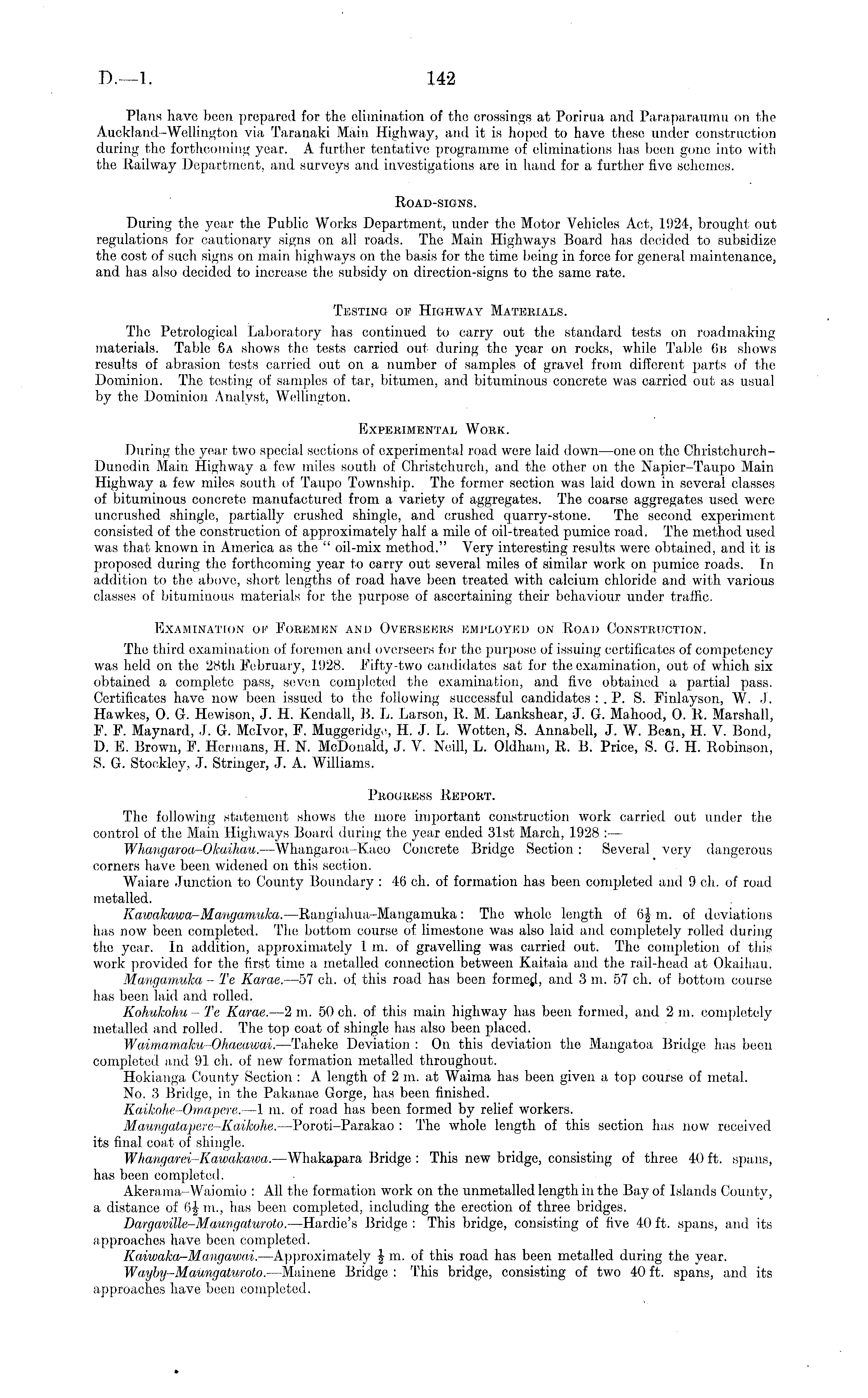 Plans have been prepared for the elimination of the crossings at Porirua and Paraparaumu on the Auckland-Wellington via Taranaki Main Highway, and. it is hoped to have these under construction during the forthcoming year. A further tentative programme of eliminations has been gone into with the Railway Department, and surveys and investigations are in hand for a further five schemes. Road-signs. During the year the Public Works Department, under the Motor Vehicles Act, 1924, brought, out regulations for cautionary signs on all roads. The Main Highways Board has decided to subsidize the cost of such signs on main highways on the basis for the time being in force for general maintenance, and has also decided to increase the subsidy on direction-signs to the same rate. Testing of Highway Materials. The Petrological Laboratory has continued to carry out the standard tests on roadmaking materials. Table 6a shows the tests carried out- during the year on rocks, while Table 6b shows results of abrasion tests carried out on a number of samples of gravel from different parts of the Dominion. The testing of samples of tar, bitumen, and bituminous concrete was carried out as usual by the Dominion Analyst, Wellington. E X PERIMENTAL WORK. During the year two special sections of experimental road were laid, down —one on the Christchurch - Dunedin Main Highway a low miles south of Christchurch, and the other on the Napior-Taupo Main Highway a few miles south of Taupo Township. The former section was laid down in several classes of bituminous concrete manufactured from a variety of aggregates. The coarse aggregates used were uncrushed shingle, partially crushed shingle, and crushed quarry-stone. The second experiment consisted of the construction of approximately half a mile of oil-treated pumice road. The method used was that known in America as the " oil-mix method." Very interesting results were obtained, and it is proposed during the forthcoming year to carry out several miles of similar work on pumice roads. In addition to the above, short lengths of road have been treated with calcium chloride and with various classes of bituminous materials for the purpose of ascertaining their behaviour under traffic. Examination ok Fqbemen and Overseers employed on Road Construction. The third examination of foremen and overseers for the purpose of issuing certificates of competency was held on the 28th February, 1928. Fifty-two candidates sat for the examination, out of which six obtained a complete pass, seven completed the examination, and five obtained a partial pass. Certificates have now been issued to the following successful candidates :„ P. S. Finlayson, W. .1. Hawkes, 0. G. Hewison, J. H. Kendall, B. L. Larson, R. M. Lankshear, J. G. Mahood, 0. R. Marshall, F. F. Maynard, ,J. G. Mclvor, F. Muggeridge, H. J. L. Wottcn, S. Annabell, J. W. Bean, H. V. Bond, D. E. Brown, F. Hermans, H. N. McDonald, J. V. Neill, L. Oldham, R. B. Price, S. G. H. Robinson, S. G. Stockloy, J. Stringer, J. A. Williams. Progress Report. The following statement shows the more important construction work carried out under the control of the Main Highways Board dining the year ended 31st March, 1928 :—- Whangaroa-Okaihau. —Whangaroa-Kaeo Concrete Bridge Section : Several very dangerous corners have been widened on this section. Waiare Junction to County Boundary : 46 eh. of formation has been completed and 9 eh. of road metalled. KawaJcawa-Mangamuka. —Rangiahua-Mangamuka: The whole length of 6| m. of deviations has now been completed. The bottom course of limestone was also laid and completely rolled during the year. In addition, approximately Im. of gravelling was carried out. The completion of this work provided for the first time a metalled connection between Kaitaia and the rail-head at Okaihau. Mangamuka - Te Karae. —57 eh. of this road has been formed, and 3 m. 57 eh. of bottom course has been laid and rolled. Kohukohu —Te Karae. —2 m. 50 eh. of this main highway has been formed, and 2m. completely metalled and rolled. The top coat of shingle has also been placed. Waimamaku-Ohaeawai. —Taheke Deviation : On this deviation the Mangatoa Bridge has been completed and 91 eh. of new formation metalled throughout. Hokianga County Section : A length of 2 m. at Waima has been given a top course of metal. No. 3 Bridge, in the Pakanae Gorge, has been finished. Kaikohe-Omapere. —1 m. of road has been formed by relief workers. M.aungatapere-Kaikohe. —Poroti-Parakao : The whole length of this section has now received its final coat of shingle. Whangarei-Kawakawa. —Whakapara Bridge: This new bridge, consisting of three 40ft. spans, has been completed. Akerama-Waiomio : All the formation work on the unmetalled length in the Bay of Islands County, a distance of 6| m., has been completed, including the erection of three bridges. Dargaville-Maungaturoto. —Hardies Bridge : This bridge, consisting of five 40 ft. spans, and its approaches have been completed. Kaiwalear-Mangawai. —Approximately | m. of this road has been metalled during the year. Wayby-Maungaturoto. —Mainene Bridge : This bridge, consisting of two 40 ft. spans, and its approaches have been completed.