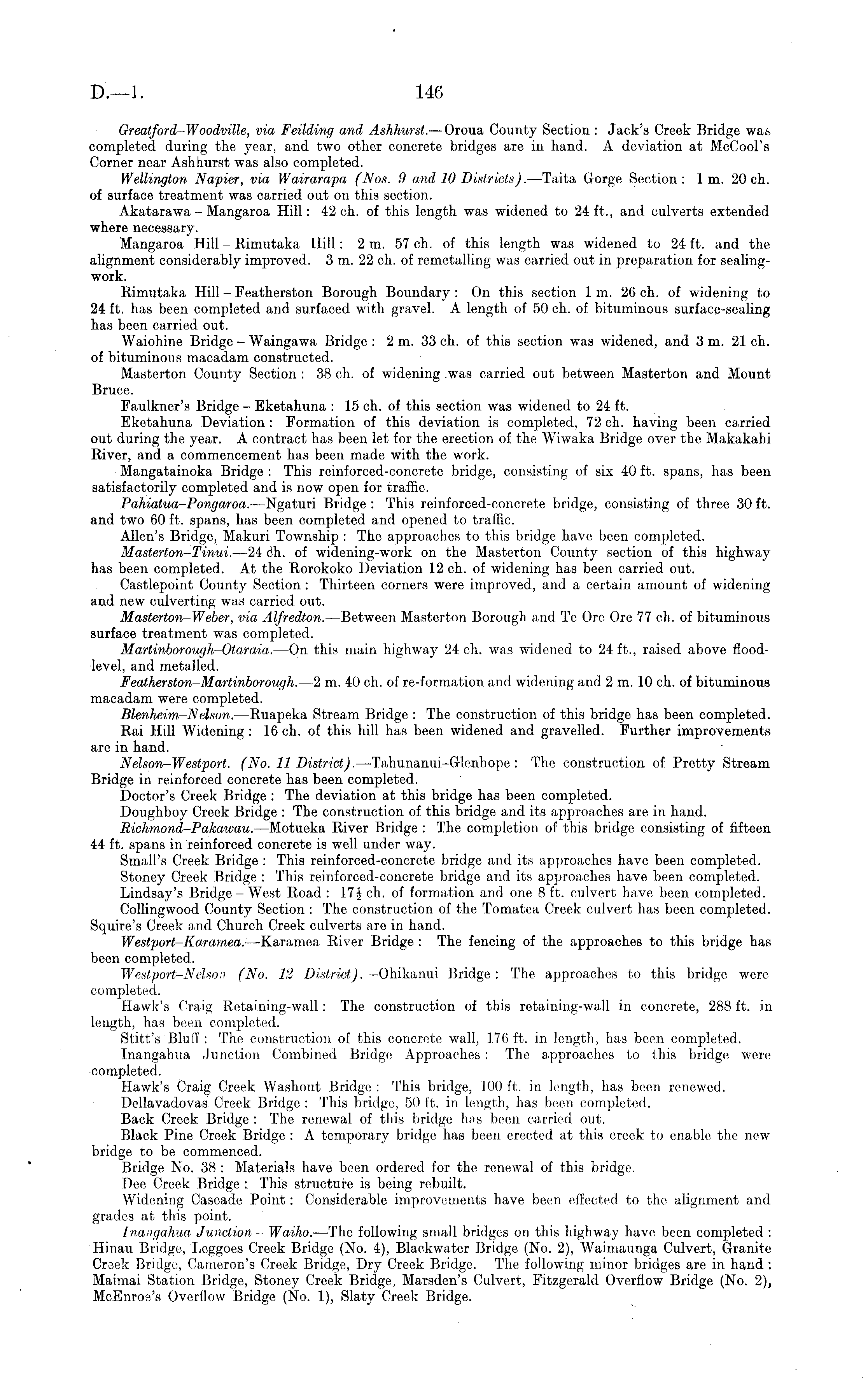 Greatford-Woodville, via Feilding and Ashhurst. —Oroua County Section : Jack's Creek Bridge was completed during the year, and two other concrete bridges are in hand. A deviation at McCool's Corner near Ashhurst was also completed. Wellington-Napier, via Wairarapa (Nos. 9 and 10 Districts). —Taita Gorge Section : 1 m. 20 eh. of surface treatment was carried out on this section. Akatarawa - Mangaroa Hill: 42 eh. of this length was widened to 24 ft., and culverts extended where necessary. Mangaroa Hill - Rimutaka Hill: 2m. 57 eh. of this length was widened to 24 ft. and the alignment considerably improved. 3m. 22 eh. of remetalling was carried out in preparation for sealingwork. Rimutaka Hill - Featherston Borough Boundary : On this section Im. 26 eh. of widening to 24 ft. has been completed and surfaced with gravel. A length of 50 eh. of bituminous surface-sealing has been carried out. Waiohine Bridge - Waingawa Bridge : 2 m. 33 eh. of this section was widened, and 3 m. 21 eh. of bituminous macadam constructed. Masterton County Section : 38 eh. of widening was carried out between Masterton and Mount Bruce. Faulkner's Bridge - Eketahuna : 15 eh. of this section was widened to 24 ft. Eketahuna Deviation : Formation of this deviation is completed, 72 eh. having been carried out during the year. A contract has been let for the erection of the Wiwaka Bridge over the Makakahi River, and a commencement has been made with the work. Mangatainoka Bridge : This reinforced-concrete bridge, consisting of six 40 ft. spans, has been satisfactorily completed and is now open for traffic. Pahiatua-Pongaroa. —Ngaturi Bridge : This reinforced-concrete bridge, consisting of three 30 ft. and two 60 ft. spans, has been completed and opened to traffic. Allen's Bridge, Makuri Township : The approaches to this bridge have been completed. Maslerton-Tinui. —24 eh. of widening-work on the Masterton County section of this highway has been completed. At the Rorokoko Deviation 12 eh. of widening has been carried out. Castlepoint County Section : Thirteen corners were improved, and a certain amount of widening and new culverting was carried out. Masterton-Weber, via Alfredton. —Between Masterton Borough and Te Ore Ore 77 eh. of bituminous surface treatment was completed. Martinborough-Otaraia. —On this main highway 24 eh. was widened to 24 ft., raised above floodlevel, and metalled. Featherston-Martinborough. —2 m. 40 eh. of re-formation and widening and 2m. 10 eh. of bituminous macadam were completed. Blenheim-Nelson. —Ruapeka Stream Bridge : The construction of this bridge has been completed. Rai Hill Widening :16 eh. of this hill has been widened and gravelled. Further improvements are in hand. Nelson-W estport. (No. J1 District). —Tahunanui-Grlenhope : The construction of Pretty Stream Bridge in reinforced concrete has been completed. Doctor's Creek Bridge : The deviation at this bridge has been completed. Doughboy Creek Bridge : The construction of this bridge and its approaches are in hand. Richmond-Pakawau. —Motuoka River Bridge : The completion of this bridge consisting of fifteen 44 ft. spans in reinforced concrete is well under way. Small's Creek Bridge : This reinforced-concrete bridge and its approaches have been completed. Stoney Creek Bridge : This reinforced-concrete bridge and its approaches have been completed. Lindsay's Bridge - West Road : eh. of formation and one 8 ft. culvert have been completed. Colling wood County Section : The construction of the Tomatea Creek culvert has been completed. Squire's Creek and Church Creek culverts are in hand. Westport-Kararnea. —Karamea River Bridge : The fencing of the approaches to this bridge has been completed. Westport-Nelson (No. .12 District). —Ohikanui Bridge : The approaches to this bridge were completed. Hawk's Craig Retaining-wall: The construction of this retaining-wall in concrete, 288 ft. in length, has been completed. Stiff's Bluff : The construction of this concrete wall, 176 ft. in length, has been completed. Inangahua Junction Combined Bridge Approaches : The approaches to this bridge were completed. Hawk's Craig Creek Washout Bridge: This bridge, 100 ft. in length, has been renewed. Dellavadovas Creek Bridge : This bridge, 50 ft. in length, has been completed. Back Crock Bridge : The renewal of this bridge has been carried out. Black Pine Creek Bridge : A temporary bridge has been erected at this creek to enable the new bridge to be commenced. Bridge No. 38 : Materials have been ordered for the renewal of this bridge. Dee Creek Bridge : This structure is being rebuilt. Widening Cascade Point: Considerable improvements have been effected to the alignment and grades at this point. Inangahua Junction - Waiho. —The following small bridges on this highway have, been completed : Hinau Bridge, Loggoes Creek Bridge (No. 4), Blaokwater Bridge (No. 2), Waimaunga Culvert, Granite, Creek Bridge, Cameron's Creek Bridge, Dry Creek Bridge. The following minor bridges are in hand : Maimai Station Bridge, Stoney Creek Bridge, Marsdcn's Culvert, Fitzgerald Overflow Bridge (No. 2), McEnroe's Overflow Bridge (No. 1), Slaty Creek Bridge.