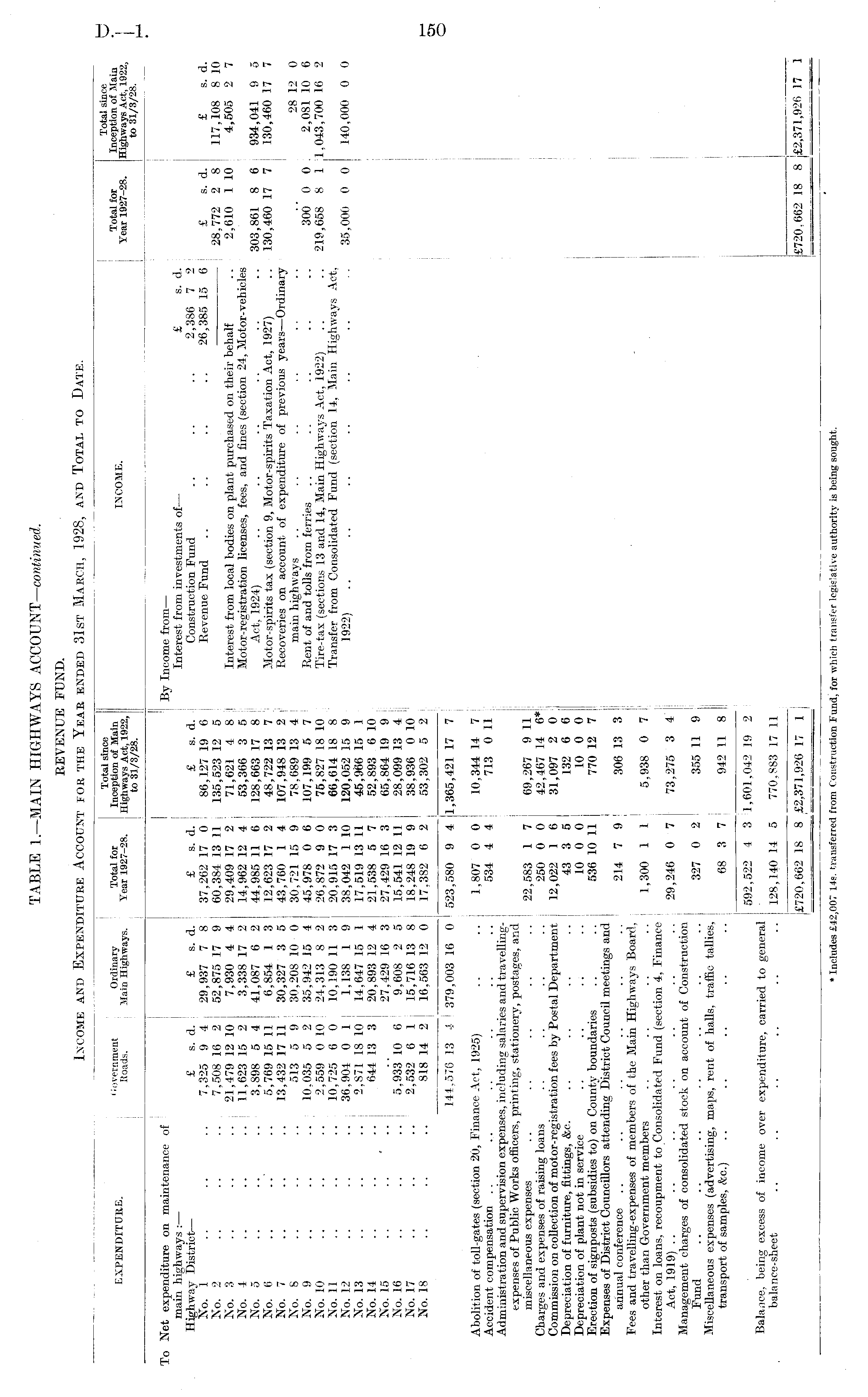 TABLE 1.—MAIN HIGHWAYS ACCOUNT— continued. REVENUE FUND. Income and Expenditure Account for the Year ended 31st March, 1928, and Total to Date.